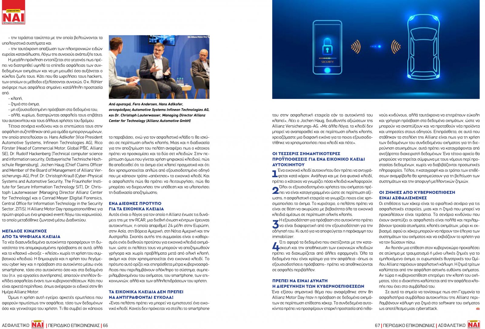 Nextdeal newsroom, 23/12/2020 - 13:47 facebook twitter linkedin 8o Allianz Motor Day: Ανοίγει το δρόμο στο αύριο της ασφάλισης αυτοκινήτου! Nextdeal newsroom, 23/12/2020 facebook twitter linkedin Εξαιρετικό ενδιαφέρον για τον κλάδο της ασφάλισης αυτοκινήτων είχε το 8o Allianz Motor Day, κατά το οποίο αναπτύχθηκαν οι κίνδυνοι που ελλοχεύουν από τα συνδεδεμένα στο Διαδίκτυο αυτοκίνητα, αλλά και από τη χρήση των ανέπαφων - ηλεκτρονικών κλειδιών. Σε αυτό που εστίασε το φετινό συνέδριο και οι ομιλητές του ήταν το κατά πόσον ως χρήστες είμαστε ασφαλείς με τα διασυνδεδεμένα αυτοκίνητα, η χρήση των οποίων αναμένεται να αυξηθεί τα επόμενα χρόνια. Ο μεγαλύτερος κίνδυνος σε αυτή τη περίπτωση θα είναι το hacking και ό,τι αυτό συνεπάγεται για τα κινούμενα οχήματα. Αυτό ήταν και το κύριο θέμα στο οποίο αναφέρθηκαν τα υψηλόβαθμα στελέχη του ομίλου, αλλά κι οι ειδικοί στον τομέα της διαδικτυακής ασφάλειας. Άπαντες συμφώνησαν ότι είναι επιβεβλημένη ανάγκη να δημιουργηθεί ένα ευρωπαϊκό κέντρο πληροφοριών και διαχείρισης της ασφάλειας των συνδεδεμένων οχημάτων το οποίο θα παρακολουθεί τις τάσεις στο συγκεκριμένο θέμα και θα εξυπηρετεί όλα τα ενδιαφερόμενα μέρη και κλάδους που σχετίζονται. Κι όλα αυτά με τη μέγιστη προσοχή σε ό,τι αφορά τα προσωπικά δεδομένα των χρηστών, τα οποία κι αυτά θα πρέπει να διαφυλάσσονται ως κόρη οφθαλμού από τους επιτήδειους. Διαβάστε το άρθρο όπως δημοσιεύθηκε στο Ασφαλιστικό ΝΑΙ, τεύχος 187, που κυκλοφόρησε (πατήστε πάνω στις εικόνες για μεγέθυνση): Ακολουθήστε το Nextdeal.gr στο Google News .