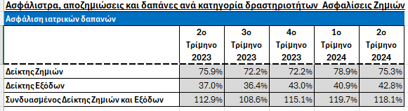 Nextdeal newsroom, 23/12/2024 - 10:48 facebook twitter linkedin Αποκλειστικό: Στο 118,1% ο δείκτης ζημιών και εξόδων (combined ratio) στις ασφαλίσεις ιατρικών δαπανών Nextdeal newsroom, 23/12/2024 facebook twitter linkedin Αποκαλυπτικά τα στοιχεία της Τράπεζας της Ελλάδος για τις ασφαλίσεις υγείας, με τον δείκτη ζημιών και εξόδων να κυμαίνεται τα πέντε τελευταία τρίμηνα, από το 2ο τρίμηνο του 2023 μέχρι και το 2ο τρίμηνο του 2024 από 112,9% μέχρι και ττο 118,1%. Αυτό σημαίνει ότι οι ασφαλιστικές εταιρείες γράφουν μεγάλες ζημιές στο συγκεκριμένο κλάδο. Ειδικότερα στην ασφάλιση ιατρικών δαπανών ο δείκτης ζημιών κυμαίνεται στα επίπεδα από 72,25 μέχρι και 78,9% ενώ ο δείκτης εξόδων από 36,4% μέχρι και 43%. Ο συνδυασμός αυτών των δύο δεικτών «στέλνει» τον συνδυασμένο δείκτη ζημιών και εξόδων μέχρι το 119,7% στο πρώτο τρίμηνο του 2024, με το δεύτερο τρίμηνο του 2024 να κυμαίνεται στο 118,1%. Δείτε στη συνέχεια τον πίνακα Ακολουθήστε το Nextdeal.gr στο Google News .