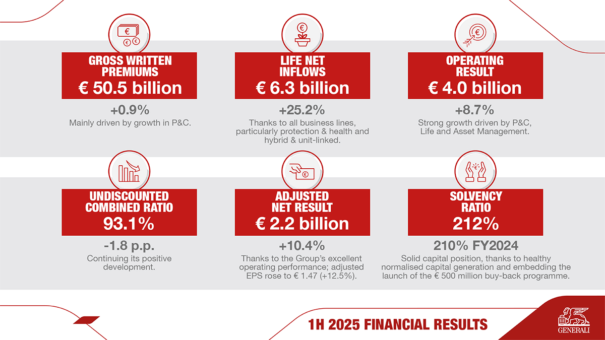 Nextdeal newsroom, 7/8/2025 - 15:52 facebook twitter linkedin Η Generali ξεκινά δυναμικά το Στρατηγικό Σχέδιο “Lifetime Partner 27: Driving Excellence” με ισχυρή ανάπτυξη στους κλάδους Γενικών Ασφαλίσεων, Ζωής και Διαχείρισης Κεφαλαίων Nextdeal newsroom, 7/8/2025 facebook twitter linkedin Συνολικά εγγεγραμμένα ασφάλιστρα: €50,5 δισ. (+0,9%), κυρίως λόγω ανάπτυξης στις Γενικές Ασφαλίσεις (+7,6%) Καθαρές εισροές στον κλάδο Ζωής: €6,3 δισ., θετικές σε όλες τις επιχειρηματικές γραμμές, με κυριότερη συμβολή από τα προϊόντα προστασίας & υγείας και τα μικτά & unit-linked Συνδυασμένος Δείκτης Ζημιών – Εξόδων (Combined Ratio): Βελτίωση στο 91,0% (-1,4 π.μ.) Ο μη προεξοφλημένος Συνδυασμένος Δείκτης Combined Ratio συνέχισε την ανοδική πορεία στο 93,1% (-1,8 π.μ.) Λειτουργικό αποτέλεσμα: Ισχυρή αύξηση στα €4,0 δισ. (+8,7%), με συμβολή από Γενικές Ασφαλίσεις, Ζωής και Διαχείριση Κεφαλαίων Προσαρμοσμένο καθαρό αποτέλεσμα: Ανήλθε σε €2,2 δισ. (+10,4%) χάρη στην εξαιρετική λειτουργική επίδοση του Ομίλου Προσαρμοσμένο Κέρδος Ανά Μετοχή (EPS): €1,47 (+12,5%) Ισχυρή κεφαλαιακή θέση: Ο Δείκτης Φερεγγυότητας (Solvency Ratio) ανήλθε σε 212% (210% για το 2024) χάρη στη σταθερή οργανική δημιουργία κεφαλαίου και λαμβάνοντας υπόψη την έναρξη του προγράμματος επαναγοράς ιδίων μετοχών ύψους €500 εκατ. Generali Group CEO, Phillipe Donnet, δήλωσε: «Τα εξαιρετικά αποτελέσματα του πρώτου εξαμήνου επιβεβαιώνουν την πολύ δυνατή εκκίνηση του Στρατηγικού Σχεδίου “Lifetime Partner 27: Driving Excellence”, με θετική επίδοση σε όλους τους τομείς Ασφαλίσεων και στην παγκόσμια πλατφόρμα Διαχείρισης Κεφαλαίων. Στις Ασφαλίσεις, οι Γενικές Ασφαλίσεις σημείωσαν σημαντική ανάπτυξη σε όλες τις βασικές αγορές μας, χάρη στη στρατηγική μας για μεγιστοποίηση της κερδοφόρας ανάπτυξης, ενώ οι καθαρές εισροές στον κλάδο Ζωής συνέχισαν την ανοδική τους πορεία, ενισχυμένες από τις προτιμώμενες επιχειρηματικές μας γραμμές. Η πλατφόρμα Διαχείρισης Κεφαλαίων, επίσης σημείωσε ισχυρές επιδόσεις, με σημαντική συνεισφορά από την Conning. Επιτύχαμε αυτά τα πολύ θετικά αποτελέσματα χάρη στις προσπάθειες όλων των συναδέλφων και των Δικτύων μας. Θα αξιοποιήσουμε αυτή τη δυναμική, επιδιώκοντας την Αριστεία ως Lifetime Partner των ασφαλισμένων μας, ενισχύοντας τις βασικές μας δυνατότητες και τις λειτουργίες του Ομίλου. Παραμένουμε πλήρως προσηλωμένοι στις ξεκάθαρες προτεραιότητες του στρατηγικού μας σχεδίου και θα συνεχίσουμε να δημιουργούμε αξία προς όφελος όλων των ενδιαφερομένων μερών.» Ακολουθήστε το Nextdeal.gr στο Google News .