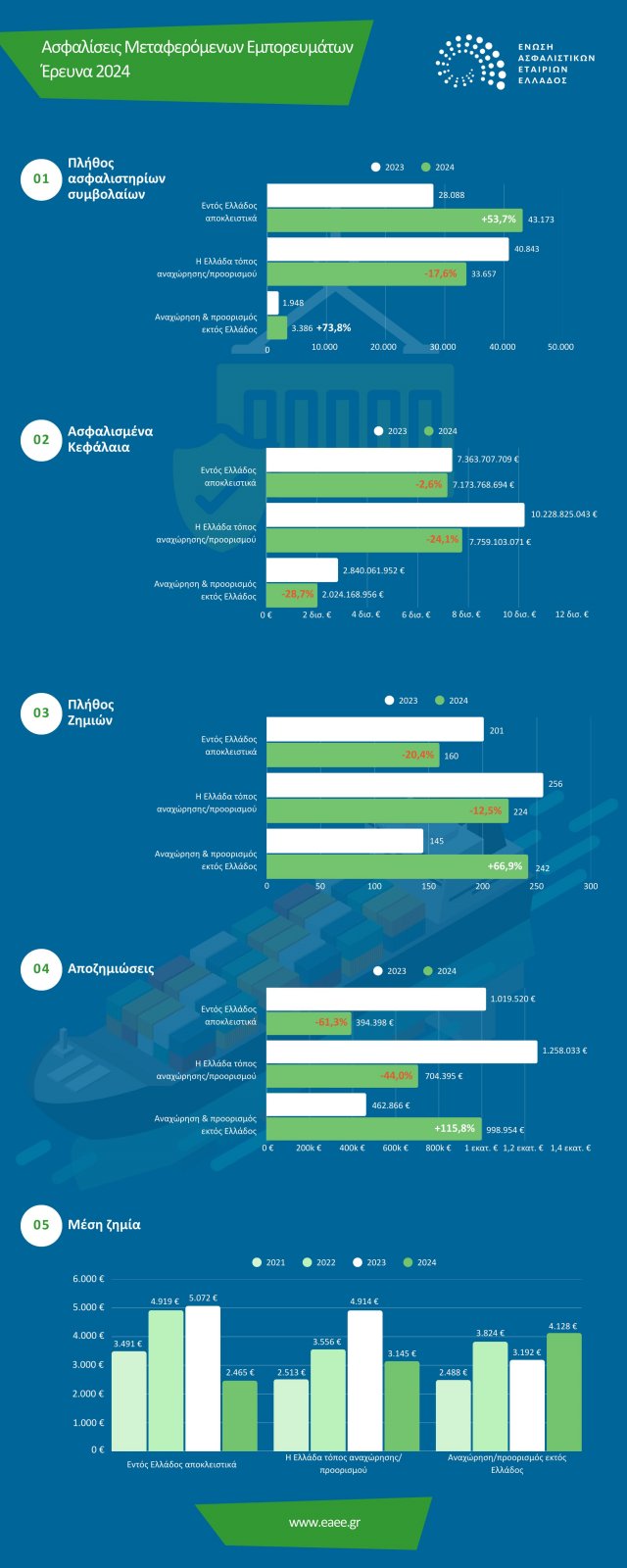 Nextdeal newsroom, 17/12/2025 - 13:50 facebook twitter linkedin ΕΑΕΕ: +13,2% οι ασφαλίσεις μεταφερόμενων εμπορευμάτων το 2024 Nextdeal newsroom, 17/12/2025 facebook twitter linkedin Στο site της ΕΑΕΕ www.eaee.gr αναρτήθηκε η έρευνα για τα στατιστικά στοιχεία ασφαλίσεων μεταφερόμενων εμπορευμάτων έτους 2024, σύμφωνα με την οποία, το πλήθος των συμβολαίων έχει αυξηθεί κατά +13,2% και συγκεκριμένα ανήλθε στα 80.216 το 2024. Μπορείτε να δείτε την έρευνα εδώ, το αντίστοιχο infographic εδώ και τα διαδραστικά διαγράμματα BI εδώ. Ακολουθήστε το Nextdeal.gr στο Google News .