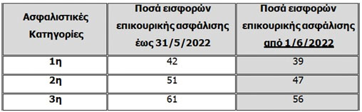Nextdeal newsroom, 22/7/2022 - 11:35 facebook twitter linkedin Αναρτήθηκαν τα ειδοποιητήρια για τις ασφαλιστικές εισφορές Ιουνίου Nextdeal newsroom, 22/7/2022 facebook twitter linkedin Αναρτήθηκαν στο διαδικτυακό τόπο του e-ΕΦΚΑ τα ενιαία ειδοποιητήρια των ασφαλιστικών εισφορών (κύριας, επικουρικής ασφάλισης και εφάπαξ παροχών) του μηνός Ιουνίου 2022 για ελεύθερους επαγγελματίες, αυτοτελώς απασχολούμενους και αγρότες με καταληκτική ημερομηνία εμπρόθεσμης πληρωμής την Παρασκευή 29.7.2022. Υπενθυμίζεται ότι από 1ης/6/2022 έχει επέλθει μείωση στις εισφορές του κλάδου επικουρικής ασφάλισης για μισθωτούς και μη μισθωτούς ασφαλισμένους, ως εξής: για Μισθωτούς (Παλαιούς και Νέους - ν.2084/1992) ιδιωτικού και δημόσιου τομέα (ΙΔΑΧ- ΙΔΟΧ) έχει μειωθεί στο 6% (από 6,50%), ενώ η εν λόγω μεταβολή αφορά και τους υπαγόμενους στην ασφάλιση του Τ.Ε.Κ.Α. για Μη Μισθωτούς (Αυτοαπασχολούμενους, Ελεύθερους Επαγγελματίες & Αγρότες) έχουν μειωθεί και ισχύουν ανά ασφαλιστική κατηγορία τα ακόλουθα ποσά: Επισημαίνεται ότι τα ποσά ανά ασφαλιστική κατηγορία του ανωτέρω πίνακα, ισχύουν και για τους έμμισθους δικηγόρους και μισθωτούς μηχανικούς. Ακολουθήστε το Nextdeal.gr στο Google News .