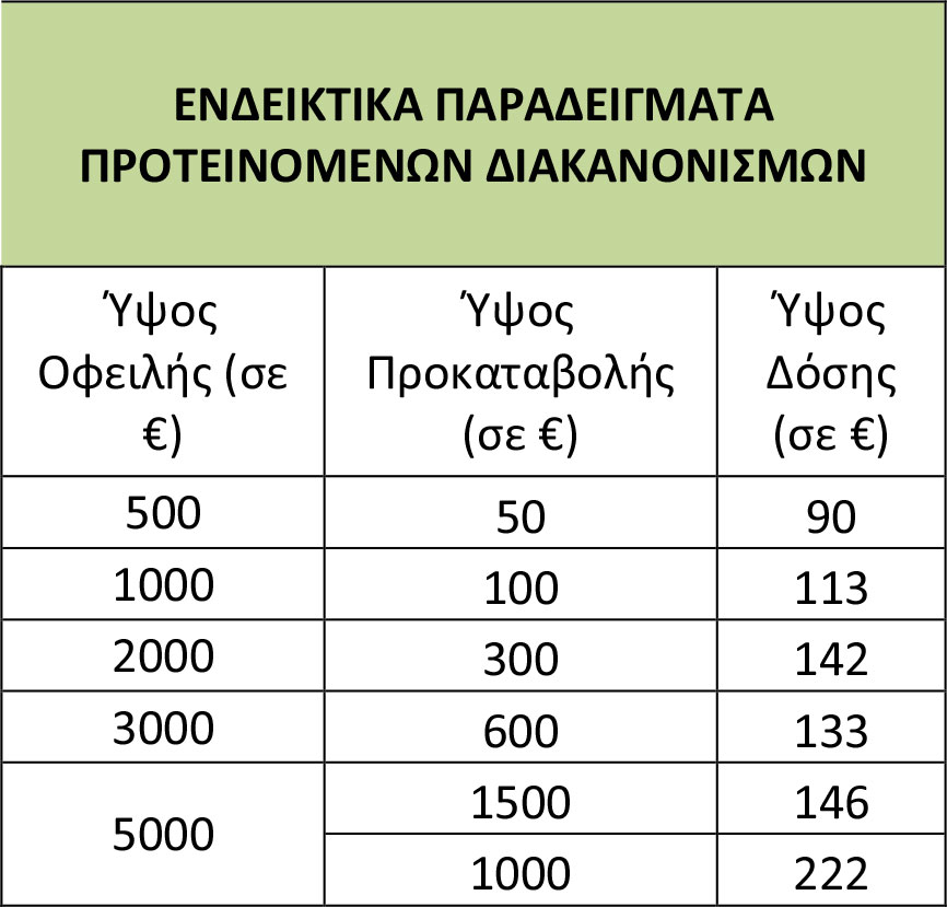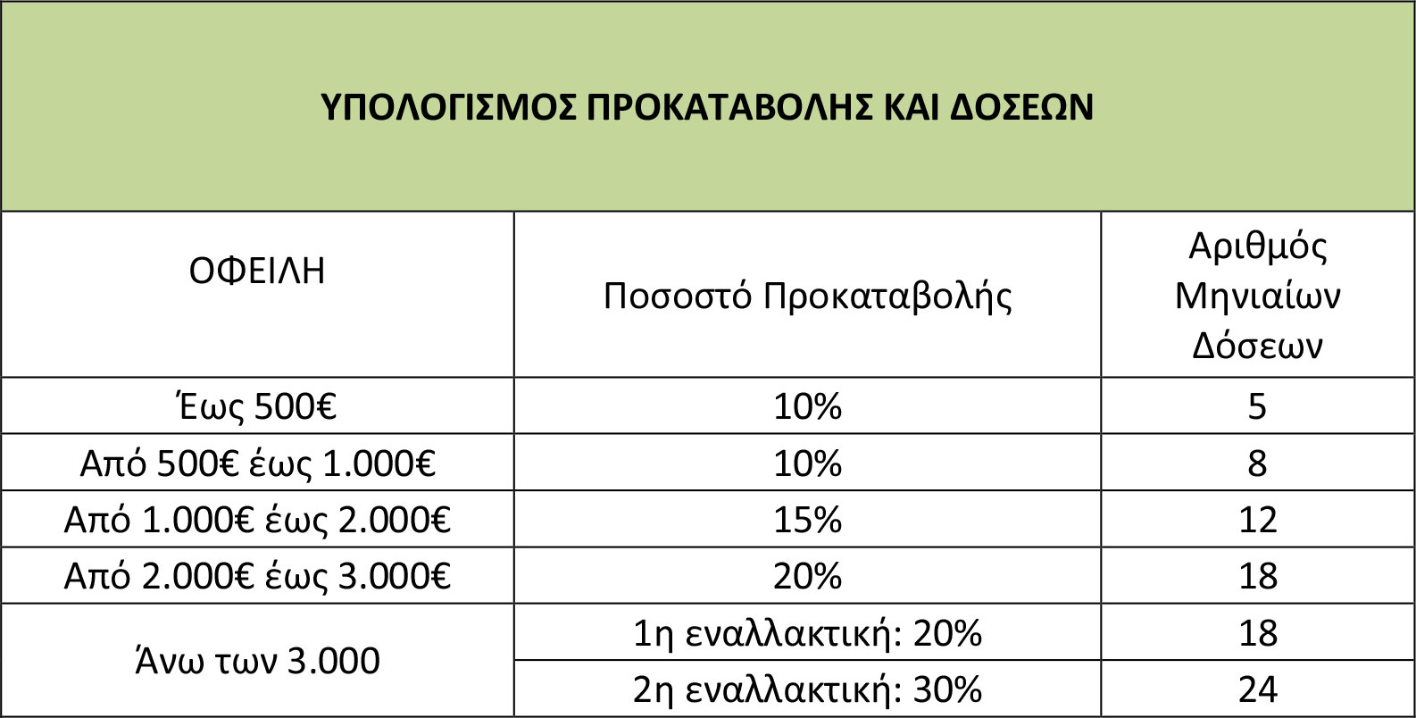 Ο υπολογισμός της προκαταβολής και των δόσεων γίνεται, ανάλογα με το ύψος της οφειλή, ως εξής: