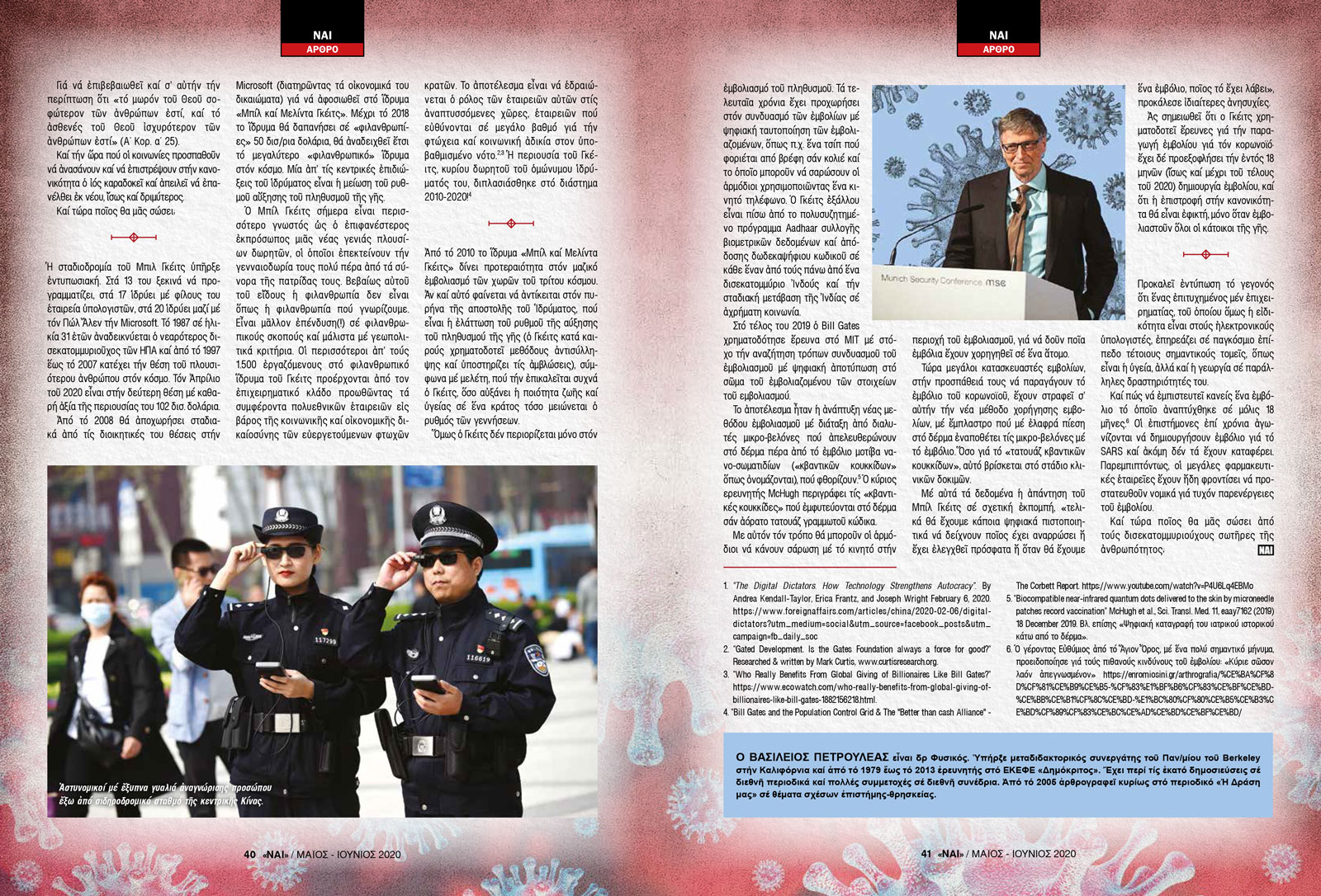 Nextdeal newsroom, 10/7/2020 - 15:13 facebook twitter linkedin Ἡ Κίνα, ὁ κορωνοϊός, ὁ Γκέιτς καί τό ἐμβόλιο Nextdeal newsroom, 10/7/2020 facebook twitter linkedin Γράφει ο Βασίλειος Πετρουλέας* «... ὁ ἄνθρωπος τῆς ἀποκρυπτογράφησης τοῦ γονιδιώματος καὶ τῶν βιοτεχνολογικῶν θαυμάτων, τῆς τεχνητῆς γονιμοποίησης, τῆς τεχνητῆς νοημοσύνης, τῆς ρομποτικῆς καὶ τῆς νανοτεχνολογίας, τῶν ἀσύλληπτων ἐπιτευγμάτων, τῆς «κατάκτησης» τοῦ σύμπαντος, ὁ ψεύτικος γίγαντας τῆς γνώσης καὶ δυνάμεως, πλήρως ταπεινωμένος, ἀπόλυτα ἰσοπεδωμένος, κυνηγάει ἕναν νανοϊὸ ποὺ ἔχει ἀναστατώσει τὴν οἰκουμένη καὶ ἔχει παραλύσει τὰ πάντα καὶ ἀδυνατεῖ νὰ τὸν ἀντιμετωπίσει.» Μητροπολίτης Μεσ. & Λαυρεωτικῆς Κος Νικόλαος Ἡ Κίνα, μέ πληθυσμό 1.400.000.000 εἶναι ἡ αὐστηρότερα ἐπιτηρούμενη μέ ἠλεκτρονικά μέσα χώρα τοῦ κόσμου. Κανένα ἄλλο καθεστώς δέν ἔχει ἀξιοποιήσει τήν τεχνητή νοημοσύνη γιά τήν παρακολούθηση τῶν πολιτῶν στό βαθμό πού τό ἔχει κάνει ἡ Κίνα. Κάμερες ὑψηλῆς ἀνάλυσης σέ κάθε γωνία, ψηφιακή ἀναγνώριση προσώπου στά καταστήματα, στό μετρό, στούς δημόσιους χώρους, προγράμματα ψηφιακῆς παρακολούθησης, αὐτόματη ἀνάλυση μεγάλων δεδομένων (big data) κ.ο.κ. Καί ἀπ᾽ τά στοιχεῖα πού συλλέγονται τό καθεστώς βαθμολογεῖ τούς πολίτες. Πολίτες μέ μή ἀποδεκτή κοινωνική συμπεριφορά παίρνουν χαμηλό «βαθμό κοινωνικῆς ἀξιοπιστίας», μέ συνέπεια νά στεροῦνται κοινωνικῶν προνομίων, ὅπως ἐπιδότηση ἐνοικίου, χρήση γρήγορων μέσων μεταφορᾶς γιά τίς μετακινήσεις τους, ἀπεριόριστη πρόσβαση στό διαδίκτυο, δάνεια ἀπό τίς τράπεζες κ.ο.κ. Συγχρόνως τό καθεστώς ἀναπτύσσει ἀλγορίθμους πρόβλεψης τῆς κοινωνικῆς συμπεριφορᾶς, προσπαθώντας νά χειραγωγήσει τούς πολίτες.1 .................. Ἡ ἐμφάνιση τοῦ νέου κορωνοϊοῦ ἔδωσε στήν κυβέρνηση εὔλογη ἀφορμή γιά νά ἐντατικοποιήσει τήν παρακολούθηση τῶν πολιτῶν. Εἴδαμε κατά τήν διάρκεια τῆς κρίσης drones νά πετοῦν πάνω ἀπό ἀνυποψίαστους πολίτες καί νά τούς δίνουν ἐντολή νά ἐπιστρέψουν ἀμέσως στά σπίτια τους. Διαβάσαμε γιά εἰδικές κάμερες πού μετροῦν ἐξ ἀποστάσεως τή θερμοκρασία τῶν πολιτῶν μέ ἀκρίβεια 0,3 βαθμῶν. Καί ἐάν οἱ μάσκες πού ἀναγκάστηκαν νά φοροῦν οἱ πολίτες ἔθεσαν σέ δοκιμασία τό πλέον ἀποτελεσματικό μέσο παρακολούθησης τῶν πολιτῶν, τήν ψηφιακή ἀναγνώριση προσώπου, οἱ ἑταιρεῖες ἀνέπτυξαν βελτιωμένους ἀλγορίθμους, πού ἀναγνωρίζουν τούς πολίτες ἀκόμη καί ὅταν φοροῦν μάσκα. Ἀκούσαμε περιπτώσεις πολιτῶν σέ κατ᾽ οἶκον καραντίνα, πού ἐντοπίσθηκαν ἀπό τό κινητό τους μόλις ἀποφάσισαν νά βγοῦν γιά λίγο ἔξω. Πληροφορηθήκαμε ὅτι τά συστήματα παρακολούθησης στά τρένα ἤξεραν γιά κάθε ἐπιβάτη, ποιοί κάθονταν τρεῖς σειρές μπροστά του καί τρεῖς σειρές πίσω του, ὥστε νά τόν θέσουν σέ καραντίνα ἐάν κάποιος ἀπ᾽ τούς συνταξιδιῶτες του εἶχε μολυνθεῖ μέ τόν ἰό κ.ο.κ. Παρ᾽ ὅλα αὐτά, ὁ ἰός διέφυγε ἀνενόχλητος γιά νά ἐπισκεφτεῖ καί ἄλλες χῶρες,...! .................. Τί εἶναι ἕνας ἰός; Εἶναι ἡ ἁπλούστερη δυνατή μορφή ζωῆς, ἐάν αὐτό μπορεῖ νά ἀποκληθεῖ ζωή. Μιά ὀργανική μορφή μέ γενετικό ὑλικό ἀλλά χωρίς κυτταρική δομή, οὕτε μεταβολισμό, ἡ ὁποία χρειάζεται ἕνα κύτταρο - ξενιστή γιά νά δημιουργήσει νέα προϊόντα καί νά ἀναπαραχθεῖ. Ὁ ἁπλούστερος λοιπόν ζωικός ὀργανισμός τόλμησε καί τά ἔβαλε μέ τήν πολυπληθέστερη χώρα τοῦ κόσμου, τήν ὁπλισμένη μέ τήν ἀρτιότερη ἠλεκτρονική τεχνολογία παρακολούθησης στόν κόσμο, καί ἔσπειρε πανικό! Καί στή