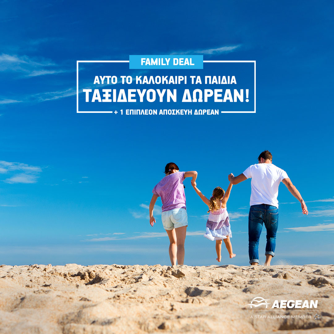 Nextdeal newsroom, 23/4/2021 - 10:05 facebook twitter linkedin Αυτό το καλοκαίρι τα παιδιά ταξιδεύουν δωρεάν με το Summer Family Deal της AEGEAN Nextdeal newsroom, 23/4/2021 facebook twitter linkedin Οι οικογένειες έχουν ό,τι χρειάζονται για ξέγνοιαστες διακοπές, αλλά και μοναδικά προνόμια για κρατήσεις έως 06/05 και πτήσεις από 15/05 έως 31/08 Δωρεάν εισιτήριο για παιδιά και βρέφη, μια δωρεάν επιπλέον βαλίτσα ανά οικογένεια, αλλαγές εισιτηρίων χωρίς rebooking fees και πολλά επιπλέον προνόμια συνθέτουν τον πυρήνα του “Summer Family Deal” που έχει σχεδιάσει η AEGEAN για να μπορέσουν όλες οι οικογένειες να προγραμματίσουν από σήμερα, τα μελλοντικά τους ταξίδια, με μεγαλύτερη ευελιξία, άνεση και σιγουριά. Πάντα δίπλα στον επιβάτη και στις ανάγκες που διαμορφώνουν οι νέες συνθήκες, καθώς η στιγμή της δυναμικής επανεκκίνησης των ταξιδίων πλησιάζει, η AEGEAN με μια νέα ενέργεια προσφέρει σε όλες τις οικογένειες: Δωρεάν εισιτήριο για παιδιά και βρέφη και μία δωρεάν επιπλέον βαλίτσα, για κρατήσεις κάθε οικογενειακού εισιτηρίου έως 06/05 και πτήσεις από 15/05/2021 έως 31/08/2021. Ακόμη μεγαλύτερη ευελιξία, καθώς παρέχεται η δυνατότητα αλλαγών χωρίς rebooking fees για κρατήσεις εισιτηρίων έως 14/05 και για ταξίδια σε όλο το δίκτυο εσωτερικού και εξωτερικού, που θα πραγματοποιηθούν από 15/05/2021 έως 31/10/2021. 50% έκπτωση για εισιτήρια κατοικιδίων, με χρήση του εκπτωτικού κωδικού "FAMILYOFFER" στην φόρμα κράτησης εισιτηρίου. Διπλάσια μίλια Miles+Bonus €15 έκπτωση για την επόμενη πτήση με κάθε PCR τεστ, μέσω του συνεργαζόμενου δικτύου 10% έκπτωση από τη Hertz, με χρήση του κωδικού προσφοράς «CDP 798393» στη φόρμα κράτησης της Hertz ή κατά την διαδικασία κράτησης εισιτηρίου. Για περισσότερες λεπτομέρειες, σχετικά με το νέο Summer Family Deal της AEGEAN και τον ολοκληρωμένο οδηγό Aegean For Families για κάθε βήμα του οικογενειακού ταξιδιού επισκεφτείτε την ιστοσελίδα www.aegeanair.com. Ακολουθήστε το Nextdeal.gr στο Google News .
