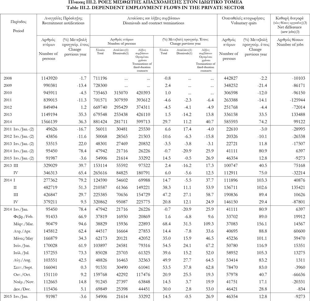 Nextdeal newsroom, 7/5/2015 - 14:19 facebook twitter linkedin Ενημερωθείτε εδώ στο nextdeal.gr για τις ροές μισθωτής απασχόλησης στον ιδιωτικό τομέα (προσλήψεις - απολύσεις)! Nextdeal newsroom, 7/5/2015 facebook twitter linkedin Το nextdeal.gr σας ενημερώνει για τις ροές μισθωτής απασχόλησης στον ιδιωτικό τομέα την περίοδο 2008-Ιανουάριος 2015, όπως αποτυπώνονται στο Στατιστικό Δελτίο Οικονομικής Συγκυρίας, τεύχος 160 Ιανουάριος-Φεβρουάριος 2015, της Τράπεζας της Ελλάδος. Δείτε παρακάτω τον σχετικό πίνακα (πατήστε πάνω στην εικόνα για μεγέθυνση): Πηγή: ΟΑΕΔ. Από το Μάρτιο του 2013: Υπουργείο Εργασίας, Πληροφοριακό Σύστημα "Εργάνη".(1) Απολύσεις εργαζομένων με συμβάσεις αορίστου χρόνου. (2) Διαθέσιμη περίοδος τρέχοντος έτους και αντίστοιχες περίοδοι προηγούμενων ετών. (3) Η καθαρή διαφορά πρέπει να αντιμετωπίζεται με επιφύλαξη, επειδή (α) οι οικειοθελείς αποχωρήσεις δεν καταγράφονται πλήρως και (β) δεν καλύπτονται οι αυτοαπασχολούμενοι και ο δημόσιος τομέας. Ακολουθήστε το Nextdeal.gr στο Google News .