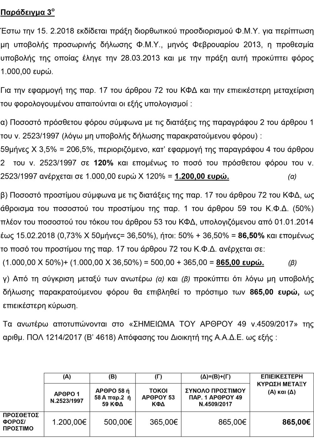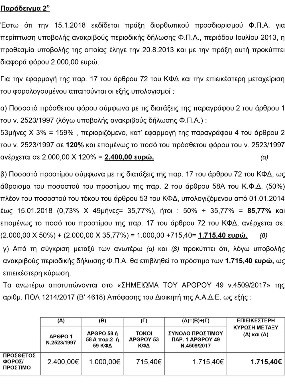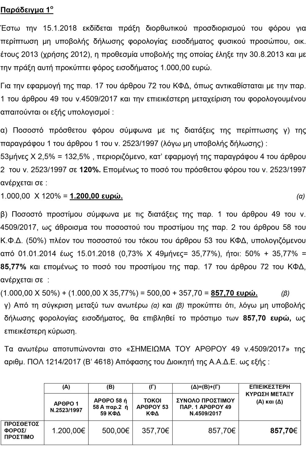 Nextdeal newsroom, 5/1/2018 - 10:48 facebook twitter linkedin H ΑΑΔΕ μειώνει φορολογικά πρόστιμα. Αναλυτικά παραδείγματα Nextdeal newsroom, 5/1/2018 facebook twitter linkedin Σε μειώσεις των προστίμων εκπρόθεσμης καταβολής φόρων για τα έτη από το 2006 μέχρι και το 2013, προχωρά η Ανεξάρτητη Αρχή Δημοσίων Εσόδων. Με εγκύκλιο της παρέχει οδηγίες προς τις εφορίες για την εφαρμογή των ευνοϊκότερων προστίμων για υποθέσεις που αφορούν χρήσεις μέχρι και το τέλος του 2013 πριν, δηλαδή, την εφαρμογή του Κώδικα Φορολογικών Διαδικασιών. Για παράδειγμα για υπόθεση μη υποβολής δήλωσης οι πρόσθετοι φόροι μειώνονται από 1.200 ευρώ σε 857,70 ευρώ ενώ σε άλλη υπόθεση υποβολής ανακριβούς δήλωσης από 2.400 ευρώ οι πρόσθετοι φόροι περιορίζονται σε 1.715,40 ευρώ. Ειδικότερα: Ακολουθήστε το Nextdeal.gr στο Google News .