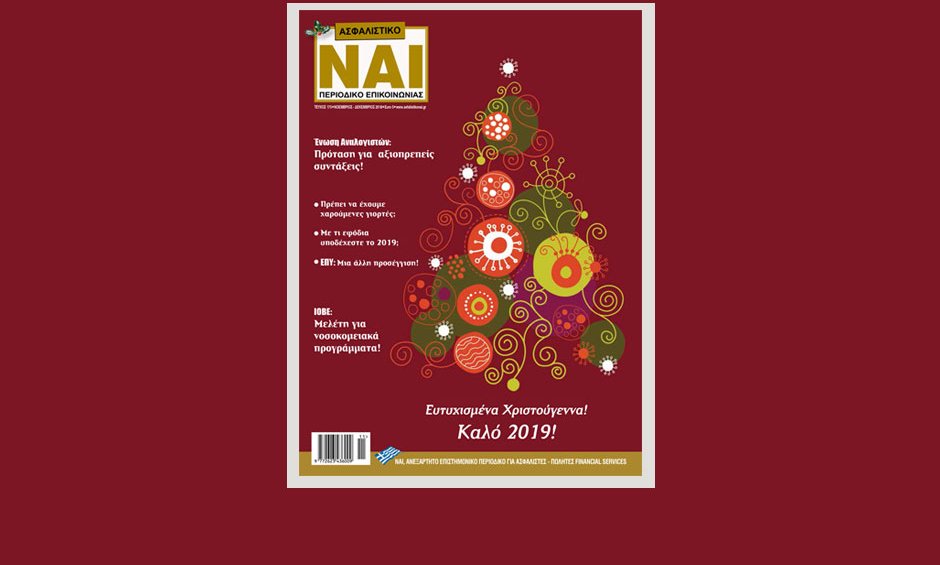 Nextdeal newsroom, 27/11/2018 - 14:08 facebook twitter linkedin Κυκλοφορεί το εορταστικό Ασφαλιστικό ΝΑΙ Nextdeal newsroom, 27/11/2018 facebook twitter linkedin Με μεγάλο αφιέρωμα στην εκπαιδευτική πολιτική των ασφαλιστικών εταιρειών για το 2019 κυκλοφορεί το εορταστικό Ασφαλιστικό ΝΑΙ. Διαβάστε με ποια εφόδια υποδέχονται το 2019 ασφαλιστικές και διαμεσολαβητές; Υψηλόβαθμα στελέχη από Εθνική Ασφαλιστική, Eurolife, NN, Interamerican, MetLife, ERGO, Generali, Allianz, Υδρόγειο, Συνεταιριστική Ασφαλιστική, Interasco, Cromar και δύο ασφαλιστικοί σύμβουλοι από Εθνική Ασφαλιστική και Interamerican, τοποθετούνται στο θέμα: «Τι τέλος (διόδιο) πληρώσατε για να περάσετε σε καλύτερους δρόμους τον επόμενο χρόνο» και απαντάνε για τις βασικές αρχές της εκπαιδευτικής πολιτικής της εταιρείας τους, που δίνουν βάρος και ποια εκπαιδευτικά μαθήματα παρακολούθησαν πρόσφατα. Σύστημα τριών πυλώνων για αξιοπρεπείς συντάξεις προτείνει Ένωση Αναλογιστών Ελλάδος. Διαβάστε την πρόταση των αναλογιστών που αντιμετωπίζει τα υπαρκτά προβλήματα του ελληνικού Συνταξιοδοτικού Συστήματος και τι πρωτοβουλίες ζήτησε ο πρόεδρος της Ένωσης κ. Πάνος Δημητρίου, ώστε να έχουν οι επόμενες γενιές αξιοπρεπές ασφαλιστικό σύστημα. Εταιρείες Ελεύθερης Παροχής Υπηρεσιών. Διαβάστε δύο ενδιαφέρουσες συνεντεύξεις εκπροσώπων εταιρειών ΕΠΥ οι οποίοι αναπτύσσουν στο Ασφαλιστικό ΝΑΙ τις απόψεις τους για την αγορά και τις εταιρείες τους. NEWSLETTER Λάβετε τα καλύτερα του Nextdeal στα εισερχόμενά σας, κάθε μέρα. Νοσοκομειακά προγράμματα ισόβιας κάλυψης. Διαβάστε τα στοιχεία για την αύξηση του κόστους των αποζημιώσεων που κατέβαλαν οι ασφαλιστικές εταιρείες, σύμφωνα με τη μελέτη του ΙΟΒΕ. Διαβάστε μια ενδιαφέρουσα συνέντευξη της Μαριάννας Παπαδάκη Country manager του Lloyd’s για Ελλάδα και Κύπρο. Η Μαριάννα Παπαδάκη τοποθετείται για τις αποζημιώσεις, την αύξηση ασφαλίστρων και τις αντασφαλιστικές απαιτήσεις. Άρθρο Εκδότη: Διαβάστε πως ο Ήλιος της Δικαιοσύνης μπορεί να μας εμπνεύσει και να μας οδηγήσει στα καλά και συμφέροντα της ζωής μας. «Εγώ προτιμώ τον Οδυσσέα Ελύτη και όσους του έδωσαν Νόμπελ Λογοτεχνίας! Μαζί με αυτούς θα προσεύχομαι στον Ήλιο της Δικαιοσύνης, που για τους χριστιανούς είναι ο Χριστός, να μην ξεχνάει τη χώρα μου» γράφει στο άρθρο του ο εκδότης κ. Ευάγγελος Σπύρου. Συναισθηματικά: Εν όψει των ημερών, το ΝΑΙ επιχειρεί να προσφέρει στους αναγνώστες του μία πνευματική Περιήγηση στους Αγίους Τόπους, στην ευδαίμονα Ιερουσαλήμ. Πωλήσεις: Διαβάστε γιατί η περίοδος των εορτών είναι και μια καλή ευκαιρία για νέα ξεκινήματα με προϋποθέσεις που εμείς οι ίδιοι θα τις κάνουμε καλύτερες. Σελίδες Κύπρου: Μία νέα ενότητα με ειδήσεις και δραστηριότητα των ασφαλιστικών εταιρειών από την Κύπρο. Διαβάστε ακόμη, την δραστηριότητα όλων των ασφαλιστικών εταιριών με την έγκυρη ματιά των δημοσιογράφων του ΝΑΙ. Και όπως πάντα, το ΑΣΦΑΛΙΣΤΙΚΟ UNDERWRITING μία μοναδική ενότητα με ειδήσεις και εκπλήξεις. Ακολουθήστε το Nextdeal.gr στο Google News .