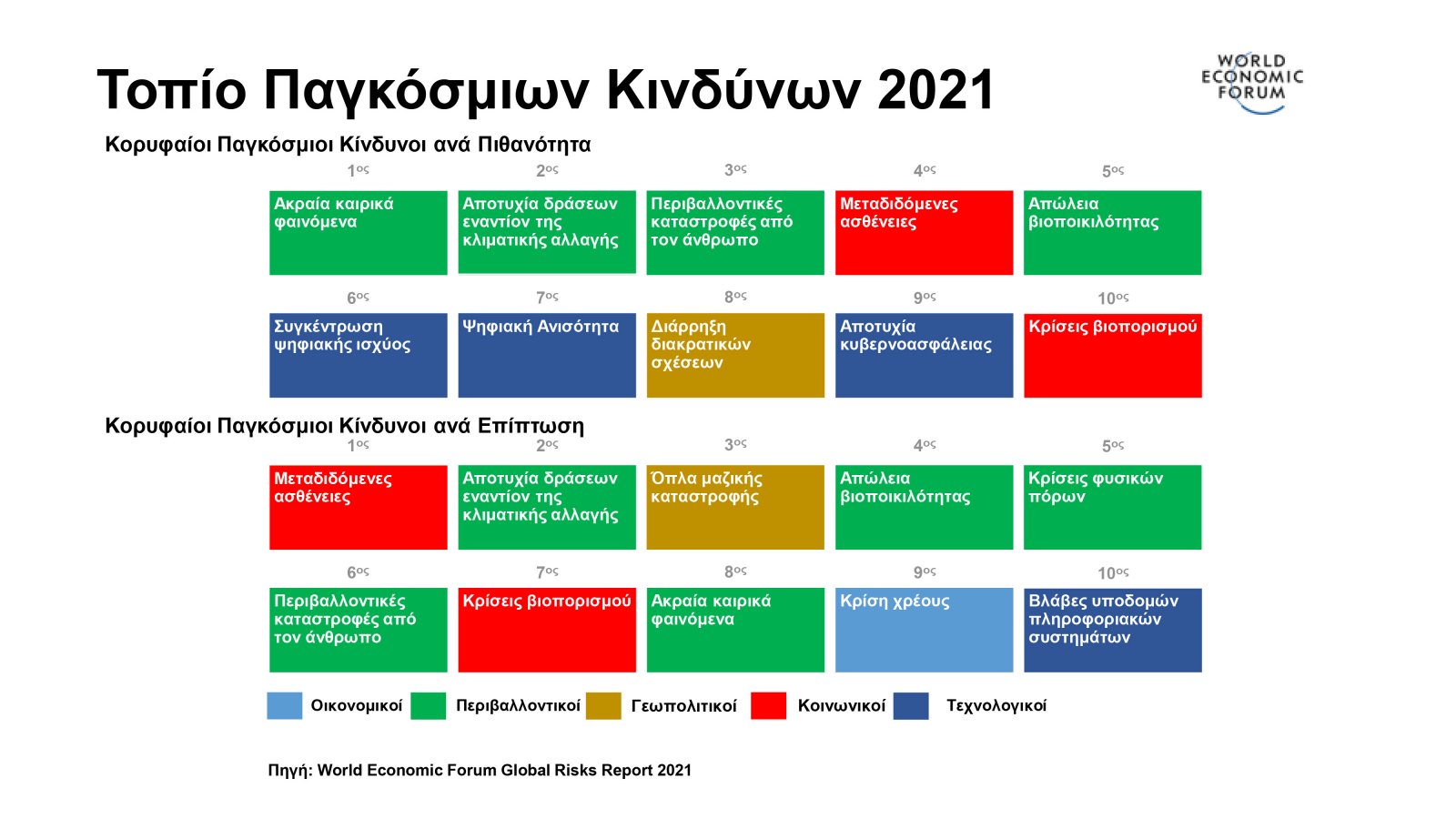 Nextdeal newsroom, 21/1/2021 - 16:19 facebook twitter linkedin Global Risks Report: Το Τοπίο Παγκόσμιων Κινδύνων για το 2021! Nextdeal newsroom, 21/1/2021 facebook twitter linkedin Τα τελευταία 15 χρόνια, το "World Economic Forum" προειδοποιεί την ανθρωπότητα για τους κινδύνους των πανδημιών. Το 2020, αντιληφθήκαμε τις αρνητικές συνέπειες του να αγνοούμε την κατάλληλη προετοιμασία και τους μακροχρόνιους κινδύνους. Η πανδημία της COVID-19 δεν έχει επηρεάσει μόνο εκατομμύρια ζωές, αλλά επίσης, όξυνε τις μακροχρόνιες ανισότητες στην υγεία, την οικονομία και τα ψηφιακά συστήματα. Δισεκατομμύρια άνθρωποι που είναι υπεύθυνοι για να παρέχουν φροντίδα στους συναθρώπους τους, εργαζόμενοι και μαθητές - ειδικά ομάδες που βρίσκονταν σε μειονεκτική θέση πριν από την πανδημία - διατρέχουν τον κίνδυνο να αποκλειστούν από τις νέες και δικαιότερες κοινωνίες, όπως θα διαμορφώνονταν στο πλαίσιο μιας επικείμενης ανάκαμψης. Σύμφωνα, λοιπόν με το Global Risks Report 2021, που δημοσιεύτηκε σήμερα, αυτές οι εξελίξεις ενδέχεται να εμποδίσουν περαιτέρω την οικουμενική συνεργασία που απαιτείται για την αντιμετώπιση μακροπρόθεσμων προκλήσεων όπως η περιβαλλοντική υποβάθμιση. Σε ό, τι αφορά την πρόσβαση στην τεχνολογία και τις ψηφιακές δεξιότητες, το χάσμα μεταξύ των «εχόντων» και των «μη εχόντων» τα μέσα, κινδυνεύει να διευρυνθεί διασαλεύοντας την κοινωνική συνοχή. Αυτό θα επηρεάσει ιδιαίτερα τους νέους παγκοσμίως, η γενιά των οποίων αντιμετωπίζει τη δεύτερη κρίση της, χάνοντας ενδεχομένως εντελώς, σημαντικές ευκαιρίες προς αξιοποίηση στην επόμενη δεκαετία. Οι οικονομικές και ψηφιακές πιέσεις καθώς και πιέσεις που αφορούν τη φήμη, ως αποτέλεσμα της COVID-19, απειλούν να παραγκωνίσουν πολλές εταιρείες και το εργατικό τους δυναμικό στις αγορές του μέλλοντος. Ενώ αυτές οι δυνητικές ανισότητες τείνουν να κατακερματίσουν τον κοινωνικό ιστό των κρατών, μια ολοένα και πιο τεταμένη και εύθραυστη γεωπολιτική προοπτική θα αποτρέψει επίσης την παγκόσμια ανάκαμψη, εάν οι μεσαίου μεγέθους δυνάμεις δε λάβουν θέση στο τραπέζι των διαπραγματεύσεων. Για άλλη μια φορά, οι περιβαλλοντικοί κίνδυνοι κυριαρχούν από πλευράς επιπτώσεων και πιθανοτήτων, για την ακόλουθη δεκαετία. Η διατάραξη της κοινωνικής συνοχής, η αβεβαιότητα και η ανησυχία θα δυσκολέψουν τον απαραίτητο συντονισμό για την αντιμετώπιση της διαρκούς υποβάθμισης του πλανήτη. Για πρώτη φορά, η έκθεση αξιολογεί τους κινδύνους ανάλογα και με το πότε οι ερωτηθέντες πιστεύουν ότι θα αποτελέσουν κρίσιμη απειλή για τον κόσμο. Οι σαφείς και παρόντες κίνδυνοι (0-2 έτη) αποκαλύπτουν ανησυχία για τις ζωές και τις συνθήκες διαβίωσης - μεταξύ των οποίων οι μολυσματικές ασθένειες, οι κρίσεις επαγγελματικής απασχόλησης, η ψηφιακή ανισότητα και η απογοήτευση των νέων ανθρώπων. Μεσοπρόθεσμα (σε 3-5 έτη), οι ερωτηθέντες πιστεύουν ότι ο κόσμος θα τεθεί υπό την απειλή οικονομικών και τεχνολογικών κινδύνων, οι οποίοι πιθανολογείται να επέλθουν σε αρκετά χρόνια - όπως οι «φούσκες» των περιουσιακών στοιχείων, η κατάρρευση των υποδομών πληροφορικών συστημάτων, η αστάθεια των τιμών και τα χρηματοπιστωτικά κραχ. Υπαρξιακές απειλές (5-10 χρόνια) - όπως τα όπλα μαζικής καταστροφής, η διάλυση κρατών, η απώλεια βιοποικιλότητας και οι δυμενείς τεχνολογικές εξελίξεις - είναι μερικά από τα επικρατέστερα μακροπρόθεσμα προβλήματα. «Το 2020, ο κίνδυνος μιας πανδημίας έγινε πραγματικότητα, κάτι που η εν θέματι έκθεση τονίζει, ήδη απ