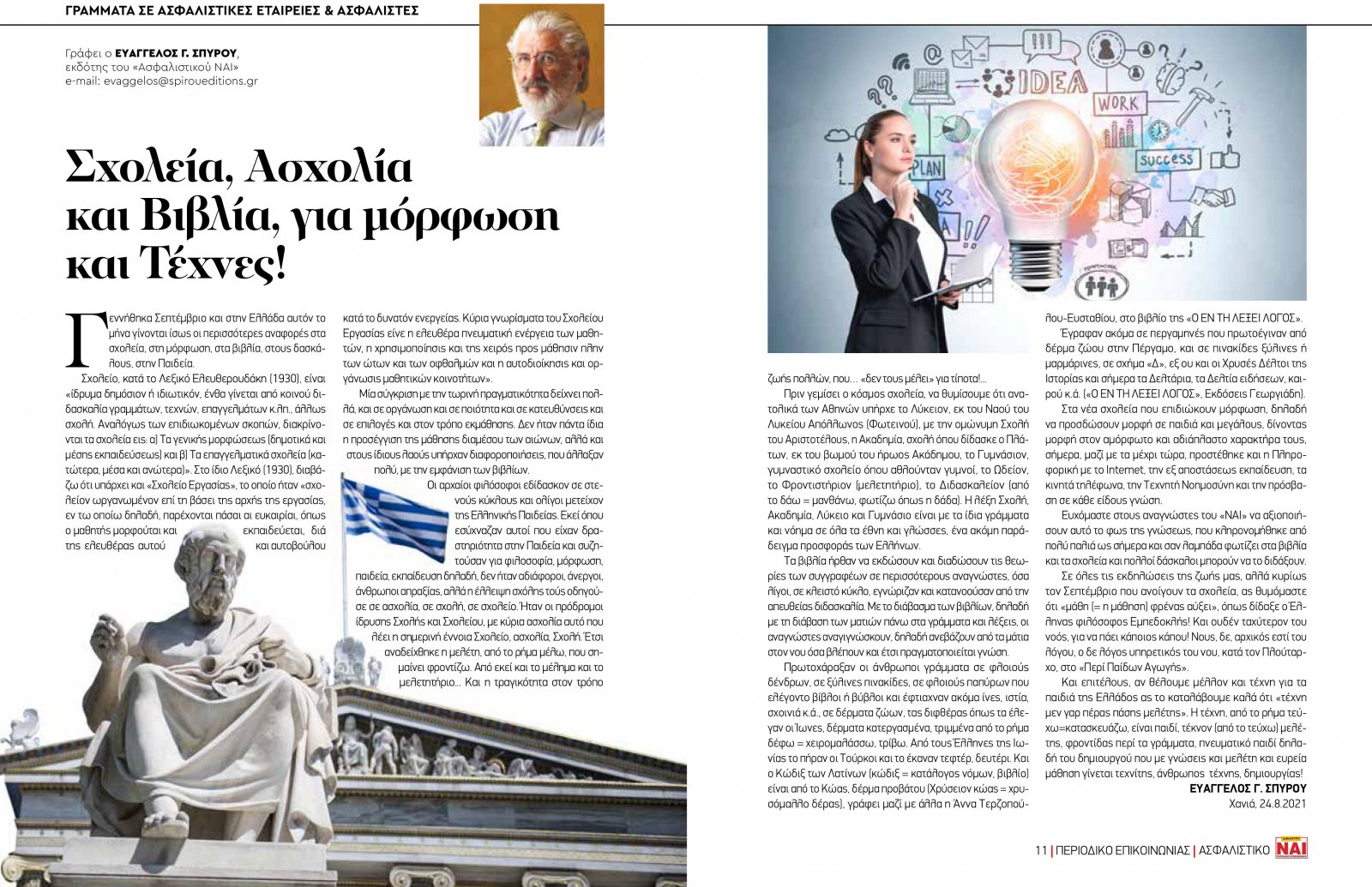 Ευάγγελος Γ. Σπύρου, 22/9/2021 - 09:21 facebook twitter linkedin Σχολεία, Ασχολία και Βιβλία, για μόρφωση και Τέχνες! Ευάγγελος Γ. Σπύρου, 22/9/2021 facebook twitter linkedin Γεννήθηκα Σεπτέμβριο και στην Ελλάδα αυτόν το μήνα γίνονται ίσως οι περισσότερες αναφορές στα σχολεία, στη μόρφωση, στα βιβλία, στους δασκάλους, στην Παιδεία. Σχολείο, κατά το Λεξικό Ελευθερουδάκη (1930), είναι «ίδρυμα δημόσιον ή ιδιωτικόν, ένθα γίνεται από κοινού διδασκαλία γραμμάτων, τεχνών, επαγγελμάτων κ.λπ., άλλως σχολή. Αναλόγως των επιδιωκομένων σκοπών, διακρίνονται τα σχολεία εις: α) Τα γενικής μορφώσεως (δημοτικά και μέσης εκπαιδεύσεως) και β) Τα επαγγελματικά σχολεία (κατώτερα, μέσα και ανώτερα)». Στο ίδιο Λεξικό (1930), διαβάζω ότι υπάρχει και «Σχολείο Εργασίας», το οποίο ήταν «σχολείον ωργανωμένον επί τη βάσει της αρχής της εργασίας, εν τω οποίω δηλαδή, παρέχονται πάσαι αι ευκαιρίαι, όπως ο μαθητής μορφούται και εκπαιδεύεται, διά της ελευθέρας αυτού και αυτοβούλου κατά το δυνατόν ενεργείας. Κύρια γνωρίσματα του Σχολείου Εργασίας είνε η ελευθέρα πνευματική ενέργεια των μαθητών, η χρησιμοποίησις και της χειρός προς μάθησιν πλην των ώτων και των οφθαλμών και η αυτοδιοίκησις και οργάνωσις μαθητικών κοινοτήτων». Μία σύγκριση με την τωρινή πραγματικότητα δείχνει πολλά, και σε οργάνωση και σε ποιότητα και σε κατευθύνσεις και σε επιλογές και στον τρόπο εκμάθησης. Δεν ήταν πάντα ίδια η προσέγγιση της μάθησης διαμέσου των αιώνων, αλλά και στους ίδιους λαούς υπήρχαν διαφοροποιήσεις, που άλλαξαν πολύ, με την εμφάνιση των βιβλίων. Οι αρχαίοι φιλόσοφοι εδίδασκον σε στενούς κύκλους και ολίγοι μετείχον της Ελληνικής Παιδείας. Εκεί όπου εσύχναζαν αυτοί που είχαν δραστηριότητα στην Παιδεία και συζητούσαν για φιλοσοφία, μόρφωση, παιδεία, εκπαίδευση δηλαδή, δεν ήταν αδιάφοροι, άνεργοι, άνθρωποι απραξίας, αλλά η έλλειψη σχόλης τούς οδηγούσε σε ασχολία, σε σχολή, σε σχολείο. Ήταν οι πρόδρομοι ίδρυσης Σχολής και Σχολείου, με κύρια ασχολία αυτό που λέει η σημερινή έννοια Σχολείο, ασχολία, Σχολή. Έτσι αναδείχθηκε η μελέτη, από το ρήμα μέλω, που σημαίνει φροντίζω. Από εκεί και το μέλημα και το μελετητήριο... Και η τραγικότητα στον τρόπο ζωής πολλών, που... «δεν τους μέλει» για τίποτα!... Πριν γεμίσει ο κόσμος σχολεία, να θυμίσουμε ότι ανατολικά των Αθηνών υπήρχε το Λύκειον, εκ του Ναού του Λυκείου Απόλλωνος (Φωτεινού), με την ομώνυμη Σχολή του Αριστοτέλους, η Ακαδημία, σχολή όπου δίδασκε ο Πλάτων, εκ του βωμού του ήρωος Ακάδημου, το Γυμνάσιον, γυμναστικό σχολείο όπου αθλούνταν γυμνοί, το Ωδείον, το Φροντιστήριον (μελετητήριο), το Διδασκαλείον (από το δάω = μανθάνω, φωτίζω όπως η δάδα). Η λέξη Σχολή, Ακαδημία, Λύκειο και Γυμνάσιο είναι με τα ίδια γράμματα και νόημα σε όλα τα έθνη και γλώσσες, ένα ακόμη παράδειγμα προσφοράς των Ελλήνων. Τα βιβλία ήρθαν να εκδώσουν και διαδώσουν τις θεωρίες των συγγραφέων σε περισσότερους αναγνώστες, όσα λίγοι, σε κλειστό κύκλο, εγνώριζαν και κατανοούσαν από την απευθείας διδασκαλία. Με το διάβασμα των βιβλίων, δηλαδή με τη διάβαση των ματιών πάνω στα γράμματα και λέξεις, οι αναγνώστες αναγιγνώσκουν, δηλαδή ανεβάζουν από τα μάτια στον νου όσα βλέπουν και έτσι πραγματοποιείται γνώση. NEWSLETTER Λάβετε τα καλύτερα του Nextdeal στα εισερχόμενά σας, κάθε μέρα. Πρωτοχάραξαν οι άνθρωποι γράμματα σε φλοιούς δένδρων, σε ξύλινες πινακίδες, σε φλοιούς παπύρων που ελέγοντο βίβλοι ή βύβλοι και έφτιαχναν ακόμα ίνες, ιστ