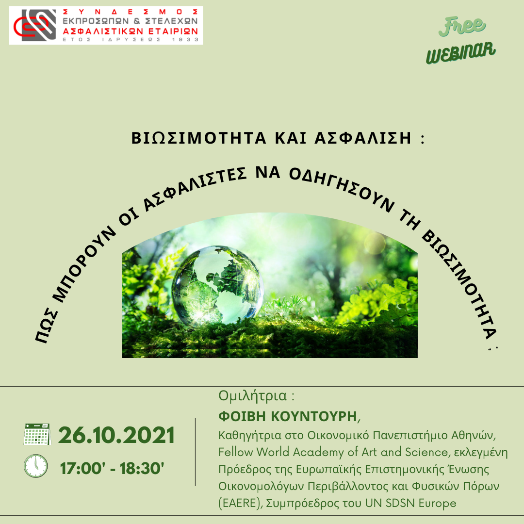 Nextdeal newsroom, 15/10/2021 - 09:55 facebook twitter linkedin Ο ΣΕΣΑΕ φιλοξενεί την κα Φοίβη Κουντούρη Nextdeal newsroom, 15/10/2021 facebook twitter linkedin O Σ.Ε.Σ.Α.Ε. στα πλαίσια των εκδηλώσεων που πραγματοποιεί αποφάσισε τη διοργάνωση διαδικτυακής εκδήλωσης, με επιστημονικό ενδιαφέρον, την Τρίτη, 26 Οκτωβρίου 2021 και ώρα 17:00’ – 18:30’. Στο webinar αυτό, ο Σύνδεσμος έχει τη χαρά να φιλοξενήσει την κα Φοίβη Κουντούρη, Καθηγήτρια στο Οικονομικό Πανεπιστήμιο Αθηνών, Fellow World Academy of Art and Science, εκλεγμένη Πρόεδρο της Ευρωπαϊκής Επιστημονικής Ένωσης Οικονομολόγων Περιβάλλοντος και Φυσικών Πόρων (EAERE), Συμπρόεδρο του UN SDSN Europe, η οποία θα αναπτύξει το θέμα : «Βιωσιμότητα και Ασφάλιση: Πως μπορούν οι Ασφαλιστές να οδηγήσουν τη βιωσιμότητα;». Θα ακολουθήσει συζήτηση επί των ερωτήσεων που θα υποβληθούν από τους θεατές, το συντονισμό της οποίας έχει αναλάβει ο κ. Ερρίκος Μοάτσος, Αντιπρόεδρος του Σ.Ε.Σ.Α.Ε. Με την πεποίθηση ότι, το θέμα αυτό είναι ιδιαίτερης βαρύτητας και παρουσιάζει εξαιρετικό ενδιαφέρον για την ασφαλιστική αγορά, καλούμε όσους επιθυμούν να παρακολουθήσουν το webinar να δηλώσουν συμμετοχή στο e-mail : [email protected], αναφέροντας ονοματεπώνυμο και ηλεκτρονική διεύθυνση, προκειμένου να τους σταλεί προσωπική πρόσκληση. Η συμμετοχή είναι δωρεάν. Στην προσπάθεια αυτή του Συνδέσμου, πολύτιμη είναι η στήριξη των χορηγών μας : “AON” – Πλατινένιος Χορηγός, “ERGO”, "EUROLIFE FFH" & “HOWDEN MATRIX S.A.” – Χρυσοί Χορηγοί. Ακολουθήστε το Nextdeal.gr στο Google News .