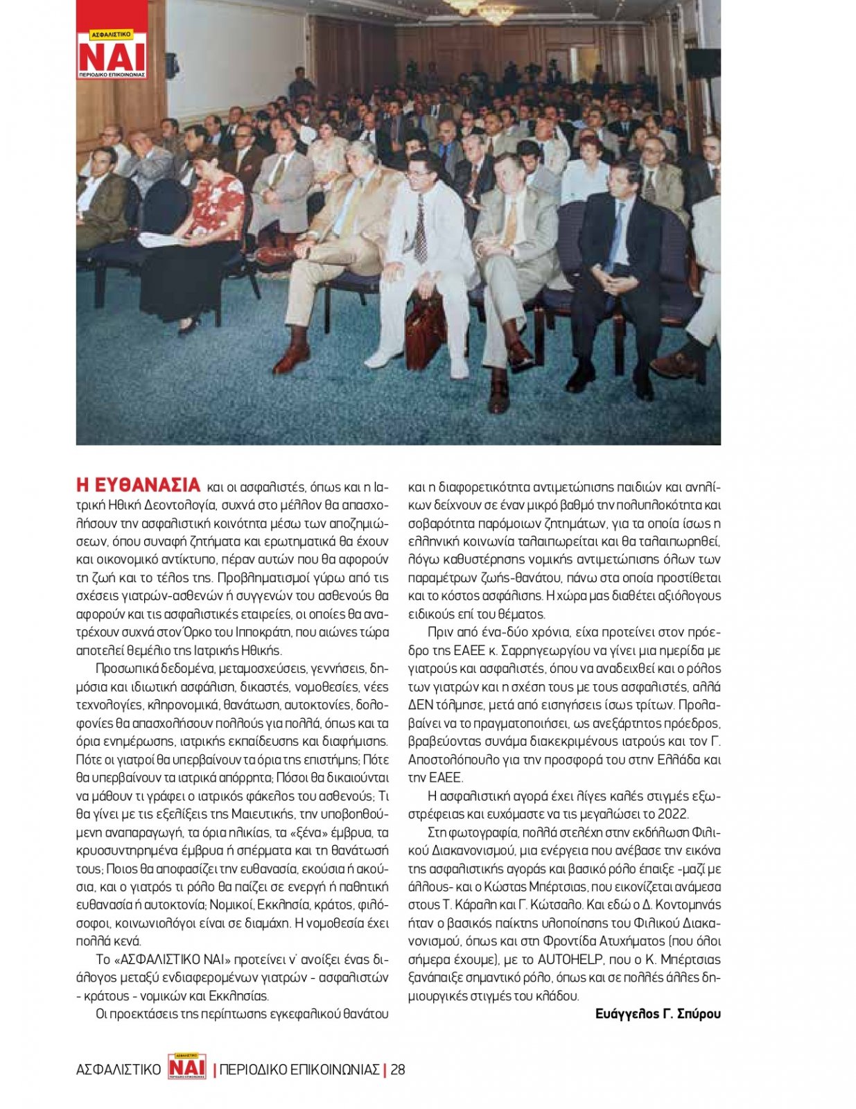 Ασφαλιστικό underwriting από το 1990, 14/1/2022 - 14:15 facebook twitter linkedin Η ευθανασία και οι ασφαλιστές Ασφαλιστικό underwriting από το 1990, 14/1/2022 facebook twitter linkedin Η ευθανασία και οι ασφαλιστές, όπως και η Ιατρική Ηθική Δεοντολογία, συχνά στο μέλλον θα απασχολήσουν την ασφαλιστική κοινότητα μέσω των αποζημιώσεων, όπου συναφή ζητήματα και ερωτηματικά θα έχουν και οικονομικό αντίκτυπο, πέραν αυτών που θα αφορούν τη ζωή και το τέλος της. Προβληματισμοί γύρω από τις σχέσεις γιατρών-ασθενών ή συγγενών του ασθενούς θα αφορούν και τις ασφαλιστικές εταιρείες, οι οποίες θα ανατρέχουν συχνά στον Όρκο του Ιπποκράτη, που αιώνες τώρα αποτελεί θεμέλιο της Ιατρικής Ηθικής. Προσωπικά δεδομένα, μεταμοσχεύσεις, γεννήσεις, δημόσια και ιδιωτική ασφάλιση, δικαστές, νομοθεσίες, νέες τεχνολογίες, κληρονομικά, θανάτωση, αυτοκτονίες, δολοφονίες θα απασχολήσουν πολλούς για πολλά, όπως και τα όρια ενημέρωσης, ιατρικής εκπαίδευσης και διαφήμισης. Πότε οι γιατροί θα υπερβαίνουν τα όρια της επιστήμης; Πότε θα υπερβαίνουν τα ιατρικά απόρρητα; Πόσοι θα δικαιούνται να μάθουν τι γράφει ο ιατρικός φάκελος του ασθενούς; Τι θα γίνει με τις εξελίξεις της Μαιευτικής, την υποβοηθούμενη αναπαραγωγή, τα όρια ηλικίας, τα «ξένα» έμβρυα, τα κρυοσυντηρημένα έμβρυα ή σπέρματα και τη θανάτωσή τους; Ποιος θα αποφασίζει την ευθανασία, εκούσια ή ακούσια, και ο γιατρός τι ρόλο θα παίζει σε ενεργή ή παθητική ευθανασία ή αυτοκτονία; Νομικοί, Εκκλησία, κράτος, φιλόσοφοι, κοινωνιολόγοι είναι σε διαμάχη. Η νομοθεσία έχει πολλά κενά. Το «ΑΣΦΑΛΙΣΤΙΚΟ ΝΑΙ» προτείνει ν’ ανοίξει ένας διάλογος μεταξύ ενδιαφερομένων γιατρών - ασφαλιστών - κράτους - νομικών και Εκκλησίας. Οι προεκτάσεις της περίπτωσης εγκεφαλικού θανάτου και η διαφορετικότητα αντιμετώπισης παιδιών και ανηλίκων δείχνουν σε έναν μικρό βαθμό την πολυπλοκότητα και σοβαρότητα παρόμοιων ζητημάτων, για τα οποία ίσως η ελληνική κοινωνία ταλαιπωρείται και θα ταλαιπωρηθεί, λόγω καθυστέρησης νομικής αντιμετώπισης όλων των παραμέτρων ζωής-θανάτου, πάνω στα οποία προστίθεται και το κόστος ασφάλισης. Η χώρα μας διαθέτει αξιόλογους ειδικούς επί του θέματος. Πριν από ένα-δύο χρόνια, είχα προτείνει στον πρόεδρο της ΕΑΕΕ κ. Σαρρηγεωργίου να γίνει μια ημερίδα με γιατρούς και ασφαλιστές, όπου να αναδειχθεί και ο ρόλος των γιατρών και η σχέση τους με τους ασφαλιστές, αλλά ΔΕΝ τόλμησε, μετά από εισηγήσεις ίσως τρίτων. Προλαβαίνει να το πραγματοποιήσει, ως ανεξάρτητος πρόεδρος, βραβεύοντας συνάμα διακεκριμένους ιατρούς και τον Γ. Αποστολόπουλο για την προσφορά του στην Ελλάδα και την ΕΑΕΕ. Η ασφαλιστική αγορά έχει λίγες καλές στιγμές εξωστρέφειας και ευχόμαστε να τις μεγαλώσει το 2022. Στη φωτογραφία, πολλά στελέχη στην εκδήλωση Φιλικού Διακανονισμού, μια ενέργεια που ανέβασε την εικόνα της ασφαλιστικής αγοράς και βασικό ρόλο έπαιξε -μαζί με άλλους- και ο Κώστας Μπερτσιάς, που εικονίζεται ανάμεσα στους Τ. Καραλή και Γ. Κώτσαλο. Και εδώ ο Δ. Κοντομηνάς ήταν ο βασικός παίκτης υλοποίησης του Φιλικού Διακανονισμού, όπως και στη Φροντίδα Ατυχήματος (που όλοι σήμερα έχουμε), με το AUTOHELP, που ο Κ. Μπερτσιάς ξανάπαιξε σημαντικό ρόλο, όπως και σε πολλές άλλες δημιουργικές στιγμές του κλάδου. Ευάγγελος Γ. Σπύρου Δείτε το όπως δημοσιεύτηκε στο περιοδικο ΑΣΦΑΛΙΣΤΙΚΟ ΝΑΙ, Τεύχος 193, Νοέμβριος-Δεκέμβριος 2021 Πατήστε επάνω στην εικόνα για μεγέθυνση Ακολουθήστε το Nextdeal.gr στο Google News .