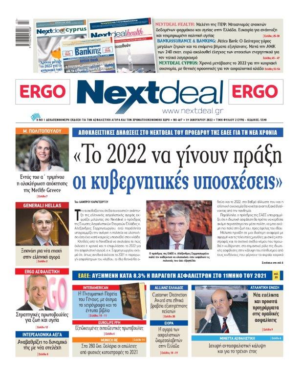 Nextdeal newsroom, 19/1/2022 - 11:37 facebook twitter linkedin Με αποκλειστικές δηλώσεις Σαρρηγεωργίου για τη νέα χρονιά κυκλοφορεί το Nextdeal! Nextdeal newsroom, 19/1/2022 facebook twitter linkedin Αισιόδοξος για την πορεία της ελληνικής ασφαλιστικής αγοράς εμφανίζεται ο πρόεδρος της Ένωσης Ασφαλιστικών Εταιρειών Ελλάδος κ. Αλέξανδρος Σαρρηγεωργίου στο NextDeal που κυκλοφορεί, σήμερα στα περίπτερα όλης της χώρας με τρία ένθετα το NextDeal health, το Bankassurance & Banking και το NextDeal Cyprus. Διαβάστε τις εκτιμήσεις του προέδρου της ΕΑΕΕ για το «κλείσιμο» του 2021,αλλά και τις προβλέψεις του για το τρέχον έτος. Διαβάστε επίσης τι ζητά από την πολιτεία για τον ασφαλιστικό κλάδο και γιατί επισημαίνει την αναγκαιότητα της ιδιωτικής ασφάλισης για τον πολίτη. Διαβάστε ακόμη: Τι προβλέπει το πρωτόκολλο για τους εργαζόμενους που έχουν νοσήσει από κορονοϊό και τι απαιτείται για να πληρωθεί ο εργαζόμενος την άδεια ασθενείας από τον ΕΦΚΑ. Ενας χρήσιμος οδηγός για όλους τους ασφαλισμένους. Πριμ έως 7.800 ετησίως για τους αριστούχους του ΕΦΚΑ Τι προβλέπει το σχέδιο νόμου για μπόνους, κυρώσεις και στελέχη από τον ιδιωτικό τομέα. Πως θα λειτουργήσει το νέο σύστημα καταβολής πριμ για τους άριστους υπαλλήλους και ποιες αυστηρές κυρώσεις προβλέπει για τους μη αποτελεσματικούς. Μελέτες ΕΑΕΕ: Αυξημένη κατά 8,3% η παραγωγή ασφαλίστρων στο 11μηνο του 2021 EIOPA:Η αγορά των ασφαλιστικών διαμεσολαβητών στην Ελλάδα. Aναλυτικοί πίνακες Munich Re:Στα 280 δισ. δολάρια οι απώλειες από φυσικές καταστροφές το 2021 NEWSLETTER Λάβετε τα καλύτερα του Nextdeal στα εισερχόμενά σας, κάθε μέρα. NextDeal health Πανελλήνια Ένωσης Φαρμακοβιομηχανίας.Διαβάστε γιατί είναι σημαντική η μελέτη για την υλοποίηση ενός μηχανισμού ανοικτών δεδομένων φαρμάκου και υγείας, που παρουσιάστηκε στο πλαίσιο των εργασιών του Πανελλήνιου Συνεδρίου για τα Οικονομικά και τις Πολιτικές της. Και 20 σελίδες με όλα τα νέα για την υγεία, τις φαρμακευτικές εταιρίες και όλες τις εξελίξεις από το χώρο. Bancassurance & Banking Αttica Bank: Ο δεύτερος γύρος μεγάλων ζημιών και τα επόμενα βήματα εξυγίανσης Διαβάστε πως θα τρέξει η διαδικασία εξυγίανσης του ισολογισμού και (επαν)ιδιωτικοποίησης της Attica Bank, με βάση τη συμφωνία μετόχων, που έχουν υπογράψει Ταμείο Χρηματοπιστωτικής Σταθερότητας με το σχήμα των επενδυτών ΤΜΕΔΕ-Ellington. NextDeal Cyprus Διαβάστε στο ρεπορτάζ του ανταποκριτή μας στην Κύπρο Γιάννη Σεϊτανίδη γιατί το 2022 προβλέπεται θετικό για τον ασφαλιστικό κλάδο. Πως στο τρέχον έτος που θα είναι χρονιά μετάβασης για την κυπριακή οικονομία, ο ασφαλιστικός τομέας έχει μπροστά του προοπτικές περαιτέρω ανάκαμψης. Και όπως πάντα ρεπορτάζ, μελέτες, άρθρα, ειδήσεις, η δραστηριότητα των ασφαλιστικών εταιριών και τα νέα των τραπεζών με το κύρος των δημοσιογράφων του Nextdeal. Πατήστε εδώ για μεγένθυση Ακολουθήστε το Nextdeal.gr στο Google News .