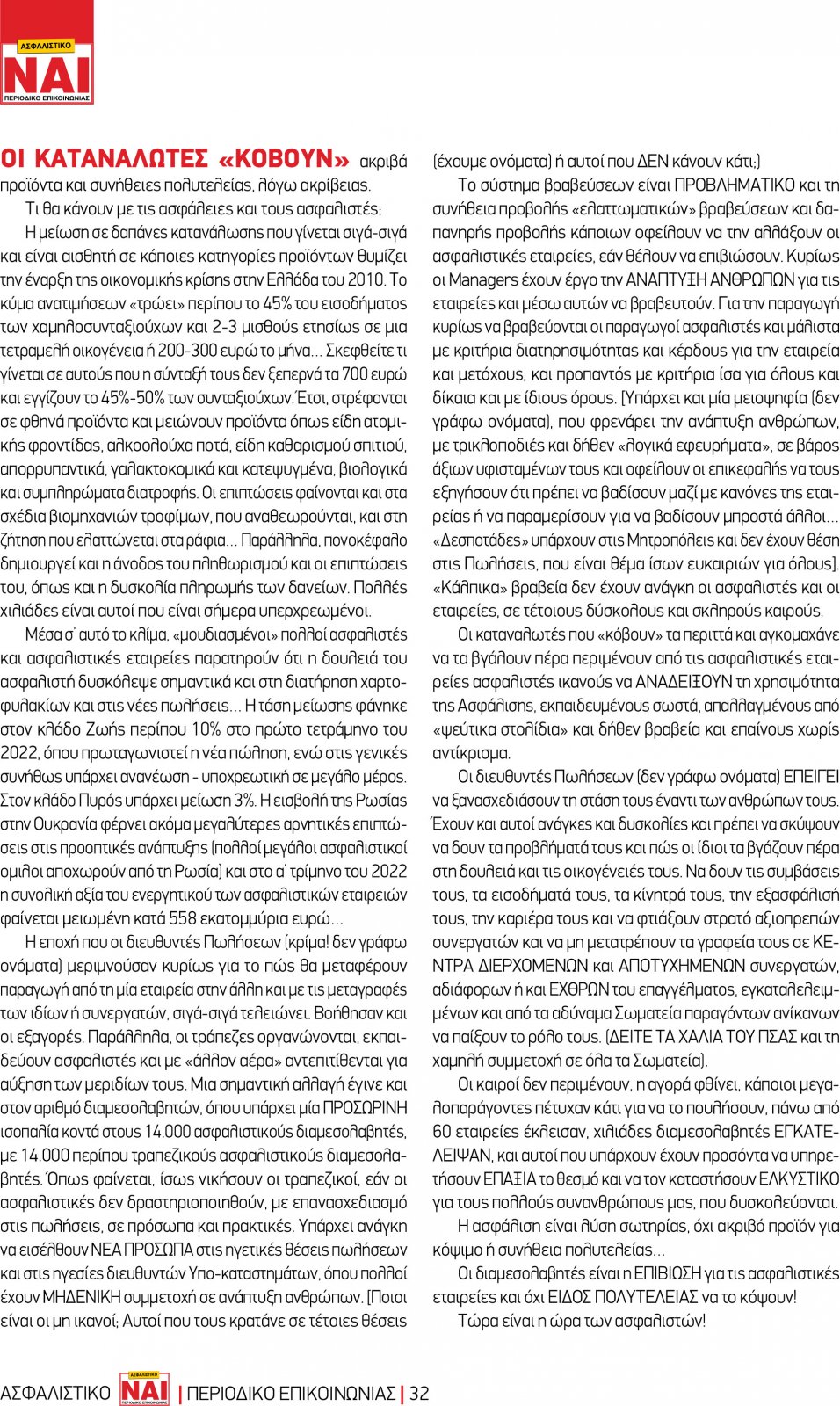 Ασφαλιστικό underwriting από το 1990, 11/7/2022 - 09:24 facebook twitter linkedin Τώρα είναι η ώρα των ασφαλιστών! Ασφαλιστικό underwriting από το 1990, 11/7/2022 facebook twitter linkedin Οι καταναλωτές «κόβουν» ακριβά προϊόντα και συνήθειες πολυτελείας, λόγω ακρίβειας. Τι θα κάνουν με τις ασφάλειες και τους ασφαλιστές; Η μείωση σε δαπάνες κατανάλωσης που γίνεται σιγά-σιγά και είναι αισθητή σε κάποιες κατηγορίες προϊόντων θυμίζει την έναρξη της οικονομικής κρίσης στην Ελλάδα του 2010. Το κύμα ανατιμήσεων «τρώει» περίπου το 45% του εισοδήματος των χαμηλοσυνταξιούχων και 2-3 μισθούς ετησίως σε μια τετραμελή οικογένεια ή 200-300 ευρώ το μήνα… Σκεφθείτε τι γίνεται σε αυτούς που η σύνταξή τους δεν ξεπερνά τα 700 ευρώ και εγγίζουν το 45%-50% των συνταξιούχων. Έτσι, στρέφονται σε φθηνά προϊόντα και μειώνουν προϊόντα όπως είδη ατομικής φροντίδας, αλκοολούχα ποτά, είδη καθαρισμού σπιτιού, απορρυπαντικά, γαλακτοκομικά και κατεψυγμένα, βιολογικά και συμπληρώματα διατροφής. Οι επιπτώσεις φαίνονται και στα σχέδια βιομηχανιών τροφίμων, που αναθεωρούνται, και στη ζήτηση που ελαττώνεται στα ράφια... Παράλληλα, πονοκέφαλο δημιουργεί και η άνοδος του πληθωρισμού και οι επιπτώσεις του, όπως και η δυσκολία πληρωμής των δανείων. Πολλές χιλιάδες είναι αυτοί που είναι σήμερα υπερχρεωμένοι. Μέσα σ’ αυτό το κλίμα, «μουδιασμένοι» πολλοί ασφαλιστές και ασφαλιστικές εταιρείες παρατηρούν ότι η δουλειά του ασφαλιστή δυσκόλεψε σημαντικά και στη διατήρηση χαρτοφυλακίων και στις νέες πωλήσεις… Η τάση μείωσης φάνηκε στον κλάδο Ζωής περίπου 10% στο πρώτο τετράμηνο του 2022, όπου πρωταγωνιστεί η νέα πώληση, ενώ στις γενικές συνήθως υπάρχει ανανέωση - υποχρεωτική σε μεγάλο μέρος. Στον κλάδο Πυρός υπάρχει μείωση 3%. Η εισβολή της Ρωσίας στην Ουκρανία φέρνει ακόμα μεγαλύτερες αρνητικές επιπτώσεις στις προοπτικές ανάπτυξης (πολλοί μεγάλοι ασφαλιστικοί ομιλοι αποχωρούν από τη Ρωσία) και στο α’ τρίμηνο του 2022 η συνολική αξία του ενεργητικού των ασφαλιστικών εταιρειών φαίνεται μειωμένη κατά 558 εκατομμύρια ευρώ... Η εποχή που οι διευθυντές Πωλήσεων (κρίμα! δεν γράφω ονόματα) μεριμνούσαν κυρίως για το πώς θα μεταφέρουν παραγωγή από τη μία εταιρεία στην άλλη και με τις μεταγραφές των ιδίων ή συνεργατών, σιγά-σιγά τελειώνει. Βοήθησαν και οι εξαγορές. Παράλληλα, οι τράπεζες οργανώνονται, εκπαιδεύουν ασφαλιστές και με «άλλον αέρα» αντεπιτίθενται για αύξηση των μεριδίων τους. Μια σημαντική αλλαγή έγινε και στον αριθμό διαμεσολαβητών, όπου υπάρχει μία ΠΡΟΣΩΡΙΝΗ ισοπαλία κοντά στους 14.000 ασφαλιστικούς διαμεσολαβητές, με 14.000 περίπου τραπεζικούς ασφαλιστικούς διαμεσολαβητές. Όπως φαίνεται, ίσως νικήσουν οι τραπεζικοί, εάν οι ασφαλιστικές δεν δραστηριοποιηθούν, με επανασχεδιασμό στις πωλήσεις, σε πρόσωπα και πρακτικές. Υπάρχει ανάγκη να εισέλθουν ΝΕΑ ΠΡΟΣΩΠΑ στις ηγετικές θέσεις πωλήσεων και στις ηγεσίες διευθυντών Υπο-καταστημάτων, όπου πολλοί έχουν ΜΗΔΕΝΙΚΗ συμμετοχή σε ανάπτυξη ανθρώπων. [Ποιοι είναι οι μη ικανοί; Αυτοί που τους κρατάνε σε τέτοιες θέσεις (έχουμε ονόματα) ή αυτοί που ΔΕΝ κάνουν κάτι;) Το σύστημα βραβεύσεων είναι ΠΡΟΒΛΗΜΑΤΙΚΟ και τη συνήθεια προβολής «ελαττωματικών» βραβεύσεων και δαπανηρής προβολής κάποιων οφείλουν να την αλλάξουν οι ασφαλιστικές εταιρείες, εάν θέλουν να επιβιώσουν. Κυρίως οι Managers έχουν έργο την ΑΝΑΠΤΥΞΗ ΑΝΘΡΩΠΩΝ για τις εταιρείες και μέσω αυτών να βραβευτούν. Για την παραγωγή κυρίως να βραβεύοντ