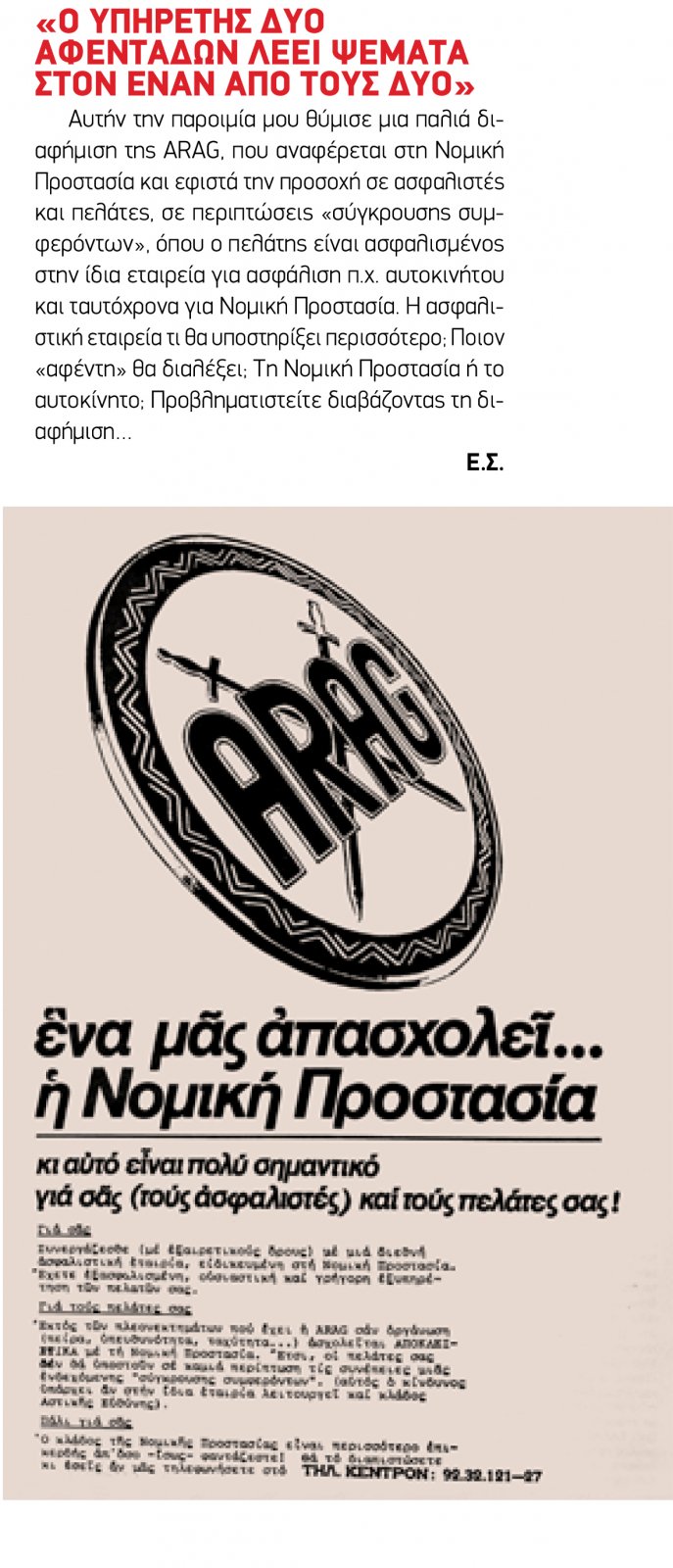 Ασφαλιστικό underwriting από το 1990, 9/11/2022 - 13:16 facebook twitter linkedin Mια παλιά διαφήμιση της ARAG που προκαλεί προβληματισμό! Ασφαλιστικό underwriting από το 1990, 9/11/2022 facebook twitter linkedin «Ο υπηρέτης δύο αφεντάδων λέει ψέματα στον έναν από τους δύο». Αυτήν την παροιμία μου θύμισε μια παλιά διαφήμιση της ARAG, που αναφέρεται στη Νομική Προστασία και εφιστά την προσοχή σε ασφαλιστές και πελάτες, σε περιπτώσεις «σύγκρουσης συμφερόντων», όπου ο πελάτης είναι ασφαλισμένος στην ίδια εταιρεία για ασφάλιση π.χ. αυτοκινήτου και ταυτόχρονα για Νομική Προστασία. Η ασφαλιστική εταιρεία τι θα υποστηρίξει περισσότερο; Ποιον «αφέντη» θα διαλέξει; Τη Νομική Προστασία ή το αυτοκίνητο; Προβληματιστείτε διαβάζοντας τη διαφήμιση... Ε.Σ. Δείτε το όπως δημοσιεύτηκε στο περιοδικό Ασφαλιστικό ΝΑΙ, που κυκλοφορεί (πατήστε πάνω την εικόνα για μεγέθυνση): Ακολουθήστε το Nextdeal.gr στο Google News .