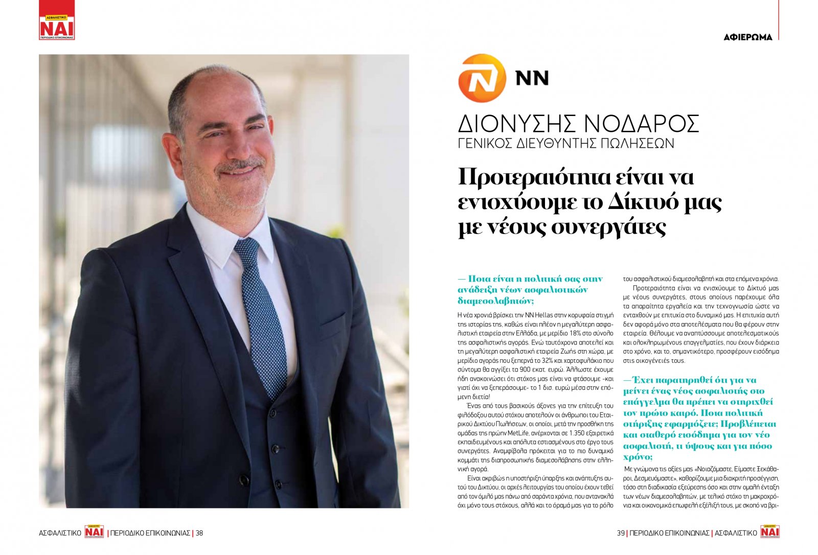 Ασφαλιστικό ΝΑΙ, 8/3/2023 - 13:52 facebook twitter linkedin Διονύσης Νοδάρος, Γενικός Διευθυντής της ΝΝ Hellas: «Προτεραιότητα είναι να ενισχύουμε το Δίκτυό μας με νέους συνεργάτες!» Ασφαλιστικό ΝΑΙ, 8/3/2023 facebook twitter linkedin Το «Ασφαλιστικό ΝΑΙ», στηρίζοντας το θεσμό του ασφαλιστικού διαμεσολαβητή, στο τεύχους 200 (Ιανουάριος-Φεβρουάριος 2023) στο πρώτο τεύχος της νέας χρονιάς, έχει εκτενές αφιέρωμα με τίτλο «2023-Χρονιά ανάδειξης νέων ασφαλιστικών διαμεσολαβητών. Εσείς τι θα κάνετε για να ανανεώσετε το ανθρώπινο δυναμικό σας;». Ασφαλιστικές εταιρείες μέσω των στελεχών τους τοποθετούνται στα ερωτήματα του «Ασφαλιστικού ΝΑΙ» και εξάγονται χρήσιμα συμπεράσματα. Κοινός τόπος των απαντήσεων είναι η ανάδειξη της χρησιμότητας του ασφαλιστικού διαμεσολαβητή. Ακολουθεί συνέντευξη του Διονύση Νοδάρου, Γενικού Διευθυντή της ΝΝ Hellas: Ποια είναι η πολιτική σας στην ανάδειξη νέων ασφαλιστικών διαμεσολαβητών; Η νέα χρονιά βρίσκει την ΝΝ Hellas στην κορυφαία στιγμή της ιστορίας της, καθώς είναι πλέον η μεγαλύτερη ασφαλιστική εταιρεία στην Ελλάδα, με μερίδιο 18% στο σύνολο της ασφαλιστικής αγοράς. Ενώ ταυτόχρονα αποτελεί και τη μεγαλύτερη ασφαλιστική εταιρεία Ζωής στη χώρα, με μερίδιο αγοράς που ξεπερνά το 32% και χαρτοφυλάκιο που σύντομα θα αγγίξει τα 900 εκατ. ευρώ. Άλλωστε έχουμε ήδη ανακοινώσει ότι στόχος μας είναι να φτάσουμε -και γιατί όχι να ξεπεράσουμε- το 1 δισ. ευρώ μέσα στην επό μενη διετία! Ένας από τους βασικούς άξονες για την επίτευξη του φιλόδοξου αυτού στόχου αποτελούν οι άνθρωποι του Εταιρικού Δικτύου Πωλήσεων, οι οποίοι, μετά την προσθήκη της ομάδας της πρώην MetLife, ανέρχονται σε 1.350 εξαιρετικά εκπαιδευμένους και απόλυτα εστιασμένους στο έργο τους συνεργάτες. Αναμφίβολα πρόκειται για το πιο δυναμικό κομμάτι της διαπροσωπικής διαμεσολάβησης στην ελληνική αγορά. Είναι ακριβώς η υποστήριξη ύπαρξης και ανάπτυξης αυ τού του Δικτύου, οι αρχές λειτουργίας του οποίου έχουν τεθεί από τον όμιλό μας πάνω από σαράντα χρόνια, που αντανακλά όχι μόνο τους στόχους, αλλά και το όραμά μας για το ρόλο του ασφαλιστικού διαμεσολαβητή και στα επόμενα χρόνια. Προτεραιότητα είναι να ενισχύουμε το Δίκτυό μας με νέους συνεργάτες, στους οποίους παρέχουμε όλα τα απαραίτητα εργαλεία και την τεχνογνωσία ώστε να ενταχθούν με επιτυχία στο δυναμικό μας. Η επιτυχία αυτή δεν αφορά μόνο στα αποτελέσματα που θα φέρουν στην εταιρεία. Θέλουμε να αναπτύσσουμε αποτελεσματικούς και ολοκληρωμένους επαγγελματίες, που έχουν διάρκεια στο χρόνο, και το, σημαντικότερο, προσφέρουν εισόδημα στις οικογένειές τους. Έχει παρατηρηθεί ότι για να μείνει ένας νέος ασφαλιστής στο επάγγελμα θα πρέπει να στηριχθεί τον πρώτο καιρό. Ποια πολιτική στήριξης εφαρμόζετε; Προβλέπεται και σταθερό εισόδημα για τον νέο ασφαλιστή, τι ύψους και για πόσο χρόνο; Με γνώμονα τις αξίες μας «Νοιαζόμαστε, Είμαστε Ξεκάθαροι, Δεσμευόμαστε», καθορίζουμε μια διακριτή προσέγγιση, τόσο στη διαδικασία εξεύρεσης όσο και στην ομαλή ένταξη των νέων διαμεσολαβητών, με τελικό στόχο τη μακροχρόνια και οικονομικά επωφελή εξέλιξή τους, με σκοπό να βρισκόμαστε πάντοτε δίπλα στην ελληνική κοινωνία και τους συνανθρώπους μας. Είναι πολύ σημαντικό να στηρίζουμε τους νέους συνεργάτες στα πρώτα τους βήματα. Ο Κανονισμός Πωλήσεων της NN Hellas διαμορφώνει καθοριστικά τα παραπάνω, αφού, πρώτον, ορίζει σε βάθος τριετίας (και όχι απλά πρώτου χρόνου) το χαρακτηρ