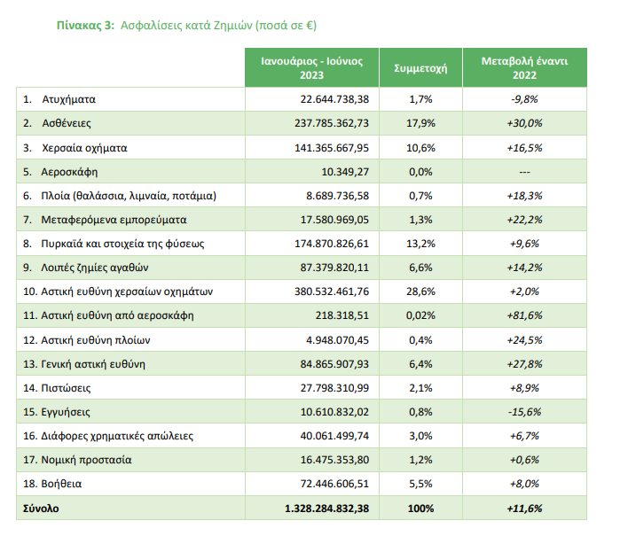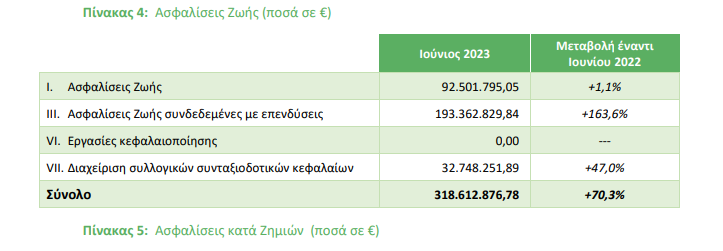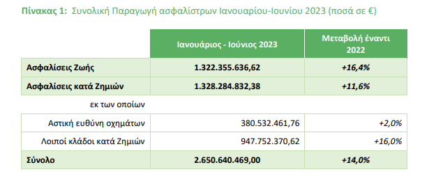 Nextdeal newsroom, 7/9/2023 - 13:19 facebook twitter linkedin Έκρηξη στην παραγωγή ασφαλίστρων κατά το πρώτο εξάμηνο του 2023! Nextdeal newsroom, 7/9/2023 facebook twitter linkedin Σημαντική αύξηση πραγματοποιήθηκε στην παραγωγή ασφαλίστρων κατά το πρώτο εξάμηνο του 2023, σύμφωνα με την έρευνα της ΕΑΕΕ. Ειδικότερα, αυτό είχε σαν αποτέλεσμα η συνολική παραγωγή ασφαλίστρων όλων των κλάδων ζωής και ζημιών να αυξηθεί κατά 14,0%. Επίσης στο πρώτο εξάμηνο του 2023 η παραγωγή ασφαλίστρων ανήλθε στα 2.650.640.469,00 ευρώ. Ειδικότερα, το σύνολο παραγωγής ασφαλίσεων Ζωής ανήλθε στα 1.322.355.636,62 (+16,4%), το σύνολο Παραγωγής ασφαλίστρων κατά Ζημιών ανήλθε στα 1.328.284.832,38 ευρώ ( +11,6% ), εκ των οποίων η Αστική Ευθύνη Οχημάτων ανήλθε στα 380.532.461,76 ευρώ ( +2,0% ) και οι λοιποί κλάδοι κατά Ζημιών στα 947.752.370,62 ευρώ (+16,0%). Η ΕΑΕΕ διεξάγει έρευνα σχετικά με την παραγωγή ασφαλίστρων ανά μήνα μεταξύ των ασφαλιστικών επιχειρήσεων - μελών της. Συνολικά ανταποκρίθηκαν 49 ασφαλιστικές επιχειρήσεις, εκ των οποίων οι 43 δραστηριοποιήθηκαν στις ασφαλίσεις κατά Ζημιών και 15 στις ασφαλίσεις Ζωής. Από τις 49 ασφαλιστικές επιχειρήσεις, οι 27 δραστηριοποιήθηκαν στην Ελλάδα με την μορφή της Ανώνυμης Ασφαλιστικής Εταιρίας, 2 με τη μορφή του αλληλασφαλιστικού συνεταιρισμού, 15 ως Υποκαταστήματα αλλοδαπής ασφαλιστικής και 5 ευρωπαϊκές ασφαλιστικές δραστηριοποιήθηκαν με καθεστώς ελεύθερης παροχής υπηρεσιών. Σύμφωνα με τα στοιχεία αυτά, (κατόπιν προσαρμογής των δεδομένων του προηγούμενου χρονικού διαστήματος με νεότερες απαντήσεις), από τη σύγκριση των δηλώσεων παραγωγής ασφαλίστρων των μηνών Ιανουαρίου - Ιουνίου 2023 των ανωτέρω επιχειρήσεων με τις αντίστοιχες της ίδιας περιόδου για το 2022 των ιδίων επιχειρήσεων, προκύπτουν τα παρακάτω: Η ανωτέρω αποτύπωσης της παραγωγής ασφαλίστρων, αναφέρεται στην καταγραφή του συνόλου των εγγεγραμμένων ασφαλίστρων από τις πρωτασφαλίσεις (συμπεριλαμβανομένων των δικαιωμάτων συμβολαίων) στο πλήρες των ποσών (ανεξαρτήτως αν αφορούν περιοδικές καταβολές ή εφάπαξ πληρωμή ασφαλίστρων), έτσι όπως ταξινομούνται στους κλάδους ασφαλίσεων σύμφωνα με τον Ν.4364/2016 (κατόπιν της προσαρμογής των δεδομένων του προηγούμενου χρονικού διαστήματος). Στους πίνακες που ακολουθούν καταγράφονται αναλυτικά τα αποτελέσματα της έρευνας παραγωγής ασφαλίστρων ανά κλάδο ασφάλισης (Ζωής και Ζημιών) για το χρονικό διάστημα Ιανουαρίου – Ιουνίου 2023 καθώς και η μεταβολή τους έναντι του αντίστοιχου διαστήματος του 2022. Στους πίνακες που ακολουθούν καταγράφονται αναλυτικά τα αποτελέσματα της έρευνας παραγωγής ασφαλίστρων ανά κλάδο ασφάλισης (Ζωής και Ζημιών) μηνός Ιουνίου του 2023 καθώς και η μεταβολή τους έναντι των αντιστοίχων του Ιουνίου του 2022. Ακολουθήστε το Nextdeal.gr στο Google News .
