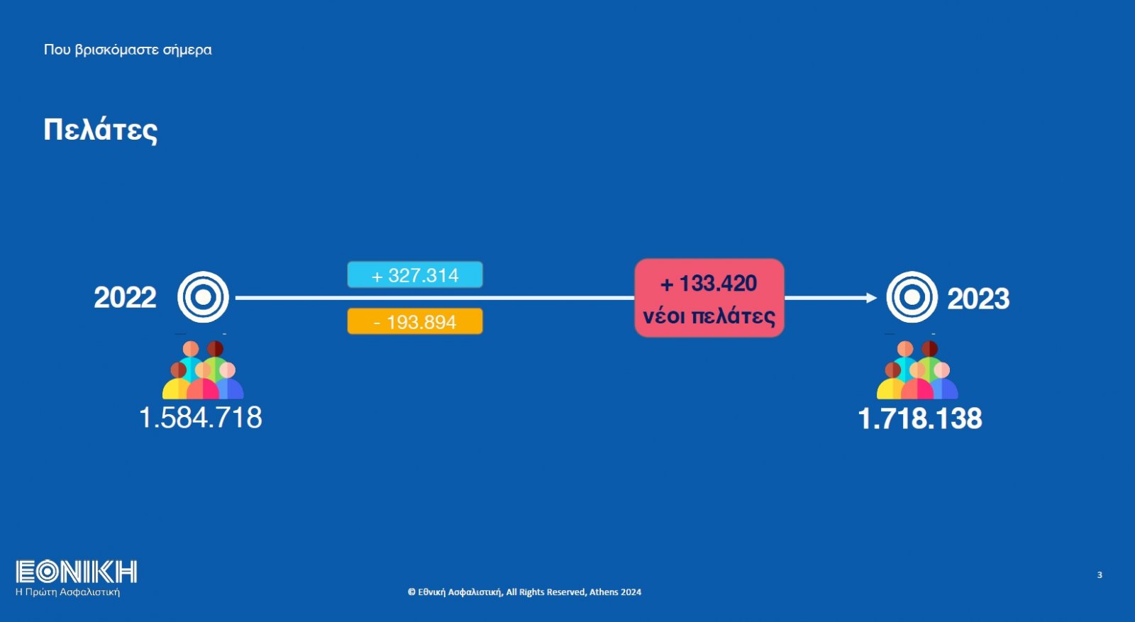 Nextdeal newsroom, 27/2/2024 - 16:30 facebook twitter linkedin Οι πέντε στόχοι της Εθνικής Ασφαλιστικής στη νέα εποχή! (βίντεο με ομιλία του Robert Gauci) Nextdeal newsroom, 27/2/2024 facebook twitter linkedin Η Εθνική Ασφαλιστική, παρουσίασε τη νέα εταιρική της ταυτότητα, με κεντρικό μήνυμα «Εδώ, για την επόμενη ημέρα», σε εκδήλωση Τύπου που πραγματοποιήθηκε την Τρίτη, 27 Φεβρουαρίου, στο Συνεδριακό Κέντρο της εταιρείας. Ταυτόχρονα, ο Διευθύνων Σύμβουλος της Εθνικής Ασφαλιστικής, RobertGauci, έκανε μια ανασκόπηση των αλλαγών που έχουν ολοκληρωθεί στην εταιρεία αλλά και των στόχων της για το 2024. Η Εθνική Ασφαλιστική εισέρχεται από σήμερα σε μια νέα εποχή, μια εποχή στον πυρήνα της οποίας βρίσκεται ο μοναδικός συγκερασμός της ιστορικής κληρονομιάς και της αξιοπιστίας, που μόνο το όνομα της Εθνικής Ασφαλιστικής μπορεί να εκπροσωπήσει, χάρη στην πολυετή πορεία και την έμπρακτη στήριξή της στις πιο κρίσιμες στιγμές της ελληνικής κοινωνίας από το 1891. Η αλλαγή του λογότυπου και της εταιρικής ταυτότητας της εταιρείας αναδεικνύει τα νέα στοιχεία που χαρακτηρίζουν το επιχειρησιακό προφίλ της, όπως ο ψηφιακός μετασχηματισμός, η δημιουργία νέων, ευέλικτων οργανωτικών δομών και ο σχεδιασμός προϊόντων και υπηρεσιών που ανταποκρίνονται στις σύγχρονες ανάγκες της κοινωνίας και της επιχειρηματικότητας. Η εταιρική εικόνα της Εθνικής Ασφαλιστικής εκσυγχρονίζεται, αντικατοπτρίζοντας την κυρίαρχη θέση της και τον ηγετικό της ρόλο στην ελληνική αγορά. Συμπυκνώνει στοιχεία από την ιστορική οπτική της ταυτότητα, αναδεικνύοντας συγχρόνως τα χαρακτηριστικά της ανανέωσης και της συνεχούς προσαρμογής στις ανάγκες του σήμερα και του αύριο. Ο Robert Gauci, Διευθύνων Σύμβουλος της Εθνικής Ασφαλιστικής, κατά τη διάρκεια της παρουσίασης, ανέφερε: «Η επόμενη ημέρα για την Εθνική Ασφαλιστική ξεκινάει σήμερα. Μια νέα ημέρα, όπου η Εθνική Ασφαλιστική θα συνεχίσει να φροντίζει για το μέλλον και την ασφάλειά όλων, όπως έκανε πάντα. Αλλά θα έχει τις ανάγκες των πολιτών και των επιχειρήσεων σε πρώτη προτεραιότητα. Με σύγχρονες λύσεις, αξιοπιστία και σταθερότητα, διαμορφώνουμε καθημερινά ένα μέλλον καλύτερο και πιο ασφαλές, για όλους, με την ίδια σύνεση που το κάνουμε εδώ και 133 χρόνια. Επενδύοντας στον ψηφιακό μετασχηματισμό δημιουργούμε τα απαραίτητα εργαλεία για να αποκτήσουμε καλύτερη γνώση των πελατών μας και να παρέχουμε μία ξεχωριστή εμπειρία εξυπηρέτησης. Αυτή η φιλοσοφία και οι αξίες που διέπουν την επόμενη ημέρα της Εθνικής Ασφαλιστικής, αποτυπώνονται με σύγχρονο τρόπο στη νέα εταιρική μας ταυτότητα. Η νέα μας εικόνα θέλαμε να αποτυπώνει όλα τα στοιχεία που κάνουν την Εθνική Ασφαλιστική αυτή που είναι, αλλά και τα στοιχεία αυτά που θα τη διαμορφώσουν στην πιο σύγχρονη ασφαλιστική εταιρεία του 21ου αιώνα. Μια εταιρεία που αξιοποιεί την καινοτομία, την τεχνογνωσία και τη διαχρονικά ισχυρή εμπειρία εξυπηρέτησης, για να υποστηρίξει με τον καλύτερο τρόπο τις σύγχρονες ανάγκες των πελατών της». Εκτός από τη νέα εταιρική ταυτότητα, κατά τη διάρκεια της εκδήλωσης Τύπου παρουσιάστηκαν σημαντικά στοιχεία από την πορεία της Εθνικής Ασφαλιστικής το 2023: Οι πελάτες της εταιρείας άγγιξαν τα 1,72 εκ, αφού προστέθηκαν 133.000 νέοι ασφαλισμένοι στο πελατολόγιο της σε σχέση με το 2022, με τον δείκτη cross selling να αγγίζει τα 1,2 συμβόλαια ανά πελάτη. Η αύξηση σε όρους νέου χαρτοφυλακίου για το 2023 πλησίασε το 19,3% σε σχέση με την προηγούμενη χρονιά, 