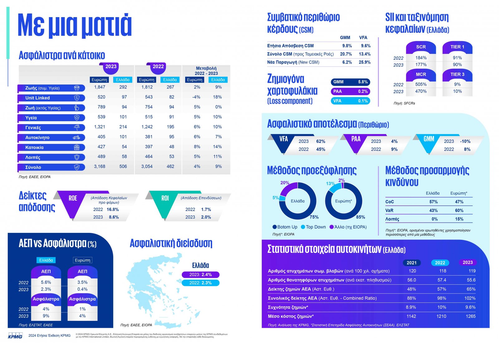 Nextdeal newsroom, 16/12/2024 - 15:54 facebook twitter linkedin Εκδήλωση της KPMG για την Ιδιωτική Ασφάλιση στην Ελλάδα και παρουσίαση της Ετήσιας Έκθεσης για το 2024 Nextdeal newsroom, 16/12/2024 facebook twitter linkedin Το νέο λογιστικό πρότυπο ΔΠΧΑ 17, η τεχνητή νοημοσύνη, ο μετασχηματισμός των εταιρειών, οι φορολογικές εξελίξεις και ο εκσυγχρονισμός της οικονομικής διεύθυνσης κυριαρχούν στην ατζέντα του ασφαλιστικού κλάδου Για 14η συνεχόμενη χρονιά, η KPMG στην Ελλάδα, προχώρησε στη δημοσίευση της Ετήσιας Έκθεσης για την Ασφαλιστική Αγορά για το 2024, ένα εξαιρετικά χρήσιμο εργαλείο ανάλυσης της χρηματοοικονομικής κατάστασης, των αποδόσεων και προοπτικών των ασφαλιστικών εταιρειών αλλά και συνολικά του ασφαλιστικού κλάδου στην Ελλάδα. Στην Έκθεση για το 2024, δημοσιεύονται στατιστικά στοιχεία και αναλυτικός σχολιασμός που βοηθούν στην ανασκόπηση της αγοράς με τα τελευταία δημοσιευμένα στοιχεία του 2023, σύμφωνα με τα ΔΠΧΑ 17 και ΔΠΧΑ 9, καθώς και ανάλυση για τις τάσεις, τους κινδύνους και τις προοπτικές του κλάδου με έμφαση σε: • Επίδραση ΔΠΧΑ 17 στις επιδόσεις των ασφαλιστικών εταιρειών. • Νέες τάσεις και ασφαλιστικός μετασχηματισμός μέσα από την ματιά των κορυφαίων CEO. • Η τεχνητή νοημοσύνη στην πρώτη γραμμή μετασχηματισμού στον ασφαλιστικό τομέα. • Στην ανάγκη μετασχηματισμού των εταιρειών και ιδιαίτερα στον εκσυγχρονισμό της οικονομικής διεύθυνσης. • Ενημέρωση για εξελίξεις σε φορολογικά θέματα. Ο Φίλιππος Κάσσος, Partner, Audit, Insurance Services της KPMG στην Ελλάδα με αφορμή τα αποτελέσματα της Ετήσιας Έκθεσης για την Ασφαλιστική Αγορά για το 2024 αναφέρει «Η ιδιωτική ασφαλιστική αγορά στην Ελλάδα για το έτος που έκλεισε το 2023 απέδωσε σημαντικά καλύτερα (9% αύξηση παραγωγής) τόσο σχετικά με το ΑΕΠ (2.3%) όσο και συγκριτικά με το μέσο όρο της Ευρώπης (4%), ενώ η τάση αυτή φαίνεται να συνεχίζεται με τον ίδιο ή/και καλύτερο ρυθμό και το 2024, σύμφωνα με τα τελευταία διαθέσιμα στοιχεία. Οι κύριοι παράγοντες της ανόδου φαίνεται να επηρεάζονται από τις σημαντικές «πληθωριστικές» αυξήσεις των τιμολογίων στο αυτοκίνητο, την περιουσία και την υγεία λόγω αυξημένου κόστους εργασιών, ενώ οι ασφαλιστές ζωής εκμεταλλευόμενοι τις υψηλότερες αποδόσεις προσελκύουν μέρος της ζήτησης για επενδυτικού τύπου προϊόντα. Στον αντίποδα, η εφαρμογή του νέου λογιστικού προτύπου (ΔΠΧΑ 17) από τις ασφαλιστικές επιχειρήσεις μας παρείχε πολύτιμες νέες πληροφορίες για την οικονομική κατάσταση των εταιρειών, τις αποδόσεις και την αξία τους. Η 14η έκδοση της KPMG περιλαμβάνει μια σειρά από νέους δείκτες απόδοσης των εταιρειών που θεωρούμε ότι θα τοποθετηθούν ψηλά στη λίστα στοιχείων που συμβάλλουν στην αξιολόγηση της αγοράς και των εταιρειών». Η παρουσίαση της Έκθεσης Η Ετήσια Έκθεση παρουσιάστηκε στην εκδήλωση με κεντρικό μήνυμα “Insurance Transformation: The New Landscape” της KPMG στην Ελλάδα, την Τρίτη 12 Δεκεμβρίου 2024 στο Athenaeum InterContinental. Στην εκδήλωση συμμετείχαν ανώτατα στελέχη από κορυφαίες ασφαλιστικές εταιρείες καθώς και διευθυντικά στελέχη της KPMG. Ο Αλκιβιάδης Σιαράβας, Marketing, Communications & Corporate Citizenship Manager, KPMG στην Ελλάδα, παρουσίασε και συντόνισε την εκδήλωση, τονίζοντας ότι στόχος της είναι η ανάδειξη των βασικών ευρημάτων της ετήσιας έκθεσης της KPMG, καθώς και forum συζήτησης επίκαιρων θεμάτων που απασχολούν τον χώρο της Ιδιωτικής Ασφάλισης στην Ελλάδα. Μέσα από την ανασκόπηση της αγοράς, η εκδήλωση αποτέλεσε αφετηρία για συζητήσεις σχετικά με τις 