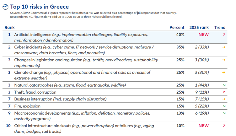 Nextdeal newsroom, 16/1/2026 - 13:40 facebook twitter linkedin Allianz Risk Barometer 2026: Οι κυβερνοεπιθέσεις παραμένουν ο κορυφαίος επιχειρηματικός κίνδυνος, αλλά το AI ακολουθεί στο Nο2 ως η ταχύτερα ανερχόμενη απειλή Nextdeal newsroom, 16/1/2026 facebook twitter linkedin Οι κυβερνοεπιθέσεις, και ιδίως οι επιθέσεις με ransomware, κατατάσσονται για πέμπτη συνεχόμενη φορά ως ο νούμερο 1 κίνδυνος για εταιρίες όλων των μεγεθών (42% των συνολικών απαντήσεων) Η τεχνητή νοημοσύνη (AI) είναι ο ταχύτερα ανερχόμενος επιχειρηματικός κίνδυνος, σκαρφαλώνοντας από την 10η στη 2η θέση (32%), υπογραμμίζοντας τις νέες απειλές που αντιμετωπίζουν οι εταιρίες σε σχεδόν όλους τους κλάδους Οι γεωπολιτικές αναταραχές και η αβεβαιότητα ωθούν τους πολιτικούς κινδύνους και τη βία στην 7η θέση, την υψηλότερη θέση που έχουν καταλάβει ποτέ Στην Ελλάδα, για το 2026, η τεχνητή νοημοσύνη αναδεικνύεται ως ο κορυφαίος επιχειρηματικός κίνδυνος (40%), με τις κυβερνοεπιθέσεις να ακολουθούν στην 2η θέση (35%) Οι κυβερνοεπιθέσεις βρέθηκαν πολύ στα πρωτοσέλιδα το 2025 και εξακολουθούν να αποτελούν τη μεγαλύτερη ανησυχία για τις εταιρίες παγκοσμίως το 2026, σύμφωνα με το Allianz Risk Barometer. Το προηγούμενο έτος ήταν επίσης σημαντικό για την ενίσχυση του ρυθμού ενσωμάτωσης της τεχνητής νοημοσύνης (AI), γεγονός που αντανακλάται στην κατάταξή του ως τον ταχύτερα ανερχόμενο κίνδυνο, καταλαμβάνοντας τη 2η θέση στην ετήσια έρευνα, ως μια σύνθετη πηγή λειτουργικού και νομικού κινδύνου, καθώς και κινδύνου φήμης. Παρόλα αυτά, σχεδόν οι μισοί από τους ερωτηθέντες πιστεύουν ότι η τεχνητή νοημοσύνη προσφέρει περισσότερα οφέλη παρά κινδύνους στον κλάδο τους, ενώ, ένας στους πέντε δηλώνει το αντίθετο. Για πρώτη φορά, η διακοπή της επιχειρηματικής δραστηριότητας δεν βρίσκεται στις δύο πρώτες θέσεις των κινδύνων, καθώς έπεσε στην 3η θέση. Ωστόσο, το ενδεχόμενο αυτό παραμένει σημαντική ανησυχία, δεδομένου ότι μπορεί να αποτελέσει συνέπεια άλλων κινδύνων που βρίσκονται στην παγκόσμια πρώτη δεκάδα. Παράγοντες όπως οι μειωμένες απώλειες κατά την περίοδο των τυφώνων το 2025, σηματοδοτούν την πτώση του κινδύνου των φυσικών καταστροφών στην 5η θέση. Την ίδια στιγμή, οι πολιτικοί κίνδυνοι και η βία ανεβαίνουν από την 9η στην 7η θέση, λόγω των αυξανόμενων ανησυχιών για τη γεωπολιτική αστάθεια και τις συγκρούσεις σε όλο τον κόσμο. Στην Ελλάδα, η τεχνητή νοημοσύνη αναδεικνύεται ως ο κορυφαίος επιχειρηματικός κίνδυνος για το 2026, εισερχόμενη για πρώτη φορά στην κατάταξη και συγκεντρώνοντας το 40% των απαντήσεων, ενώ στη 2η θέση ακολουθούν οι κυβερνοεπιθέσεις με 35%. Στην 3η θέση, με ποσοστό 25%, κατατάσσονται οι αλλαγές στο νομοθετικό και κανονιστικό πλαίσιο, η κλιματική αλλαγή, οι φυσικές καταστροφές -οι οποίες πέρυσι βρίσκονταν στην πρώτη θέση-, καθώς και η κλοπή, η απάτη και η διαφθορά, σκαρφαλώνοντας από την ένατη θέση. Οι διακοπές στην επιχειρηματική δραστηριότητα και την εφοδιαστική αλυσίδα, όπως και ο κίνδυνος πυρκαγιών και εκρήξεων, διαμορφώνονται στο 15% στη 7η θέση, ενώ ελαφρά υποχώρηση καταγράφεται στις μακροοικονομικές εξελίξεις (13%) στην 9η θέση. Τέλος, ως νέα είσοδος στη δεκάδα προστίθεται ο κίνδυνος διακοπής λειτουργίας και βλάβης σε κρίσιμες υποδομές, με ποσοστό 10%. Ο CEO της Allianz Commercial, Thomas Lillelund, σχολιάζει: «Μετά την αστάθεια και την αβεβαιότητα του 2025, οι επιχειρήσεις συνεχίζουν να αντιμετωπίζουν αλληλένδετους και ιδιαίτερα πολύπλοκους κινδύνους στο ταχέως μεταβαλλόμενο περιβάλλ