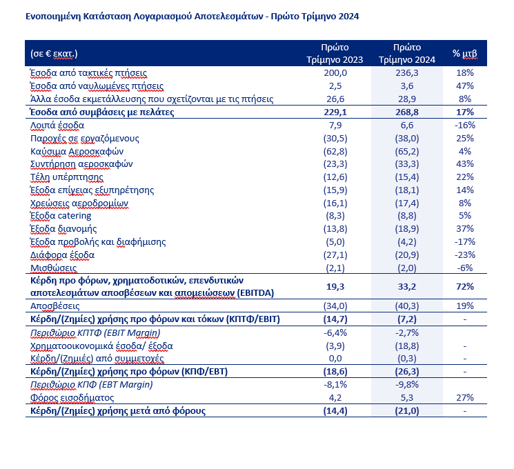 Nextdeal newsroom, 24/5/2024 - 10:56 facebook twitter linkedin AEGEAN: Βασικά Μεγέθη Πρώτου Τριμήνου 2024 - Αύξηση κύκλου εργασιών κατά 17%! Nextdeal newsroom, 24/5/2024 facebook twitter linkedin Αύξηση κύκλου εργασιών κατά 17% και βελτίωση λειτουργικής κερδοφορίας (EΒΙΤ) στο εποχικά ασθενέστερο πρώτο τρίμηνο του έτους €268,8 εκατ. Κύκλος Εργασιών, 17% υψηλότερος σε σχέση με το 2023. 2,9 εκατ. επιβάτες, 11% περισσότεροι από το πρώτο τρίμηνο του 2023. EBITDA κέρδη €33,2 εκατ. από κέρδη €19,3 εκατ. την αντίστοιχη περίοδο του 2023. EBIT Ζημίες €7,2 εκατ., βελτιωμένες από ζημίες €14,7 εκατ. την αντίστοιχη περίοδο του 2023. €21,0 εκατ. Ζημίες μετά από Φόρους από €14,4 εκατ. ζημίες την αντίστοιχη περίοδο του 2023. Η AEGEAN ανακοινώνει τα βασικά οικονομικά και λειτουργικά αποτελέσματα του πρώτου τριμήνου 2024. Ο κύκλος εργασιών το πρώτο τρίμηνο ανήλθε σε €268,8 εκατ., αυξημένος κατά 17% σε σχέση με το πρώτο τρίμηνο του 2023. Σε συνέχεια της υψηλής δυναμικής του 2023, η AEGEAN συνέχισε την αναπτυξιακή της πορεία με περαιτέρω αύξηση της χωρητικότητας και τους χειμερινούς μήνες. Ο Όμιλος προσέφερε 10% περισσότερες θέσεις στο δίκτυο εξωτερικού σε 85 απευθείας συνδέσεις από τα δύο κύρια αεροδρόμια της χώρας. Συνολικά, ο Όμιλος προσέφερε 3,8 δις. χιλιομετρικές θέσεις, 12% περισσότερες σε σχέση με το πρώτο τρίμηνο του 2023 και μετέφερε 2,9 εκατ. επιβάτες, 11% περισσότερους σε σχέση με το πρώτο τρίμηνο του 2023, εκ των οποίων 1,7 εκατ. επιβάτες από/προς προορισμούς του εξωτερικού. Ο συντελεστής πληρότητας διαμορφώθηκε στο 82%. Η AEGEAN παρέμεινε σταθερή στη στρατηγική ανάπτυξης και σε συνδυασμό με την ορθολογική διαχείριση του κόστους της, πέτυχε αύξηση των κερδών ΕΒΙΤDA, ήτοι κέρδη €33,2 εκατ. από κέρδη €19,3 εκατ. την αντίστοιχη περίοδο του 2023, αλλά και βελτίωσε τα λειτουργικά της αποτελέσματα (EBIT) με μικρότερες ζημίες €7,2 εκατ. έναντι €14,7 εκατ. το 2023. Ο Όμιλος συνεχίζει απρόσκοπτα το επενδυτικό του πλάνο στο νέο στόλο έχοντας παραλάβει 7 νέα αεροσκάφη σε σχέση με το Μάρτιο του 2023 ενώ έχει προβεί και σε επέκταση λειτουργικών μισθώσεων φθάνοντας συνολικά τα 79 αεροσκάφη, με αποτέλεσμα το κονδύλι των αποσβέσεων να έχει αυξηθεί κατά 19% σε σχέση με την αντίστοιχη περίοδο του 2023. Παρά τη βελτίωση της λειτουργικής κερδοφορίας οι ζημίες μετά από φόρους διαμορφώθηκαν σε €21,0 εκατ. από ζημίες €14,4 εκατ. το πρώτο τρίμηνο του 2023, λόγω της αρνητικής μεταβολής στην ισοτιμία του δολαρίου από την αρχή του έτους που επηρεάζει την αποτίμηση των μελλοντικών ροών των μισθώσεων αεροσκαφών. Κατά το πρώτο τρίμηνο 2024 ο Όμιλος της AEGEAN εμφάνισε ισχυρές καθαρές ταμειακές ροές €188,6 εκατ., απόρροια και των υψηλών προ-πωλήσεων για τη θερινή περίοδο, με αποτέλεσμα τα ταμειακά διαθέσιμα, ισοδύναμα και λοιπές χρηματοοικονομικές επενδύσεις να διαμορφωθούν σε €729 εκατ.[1] την 31.03.2024 μετά και την εξαγορά των Τίτλων Κτήσης Μετοχών (Warrants) και την καταβολή της Αγοραίας Αξίας ύψους €85,4 εκατ. την 02.01.2024. Ο κ. Δημήτρης Γερογιάννης, Διευθύνων Σύμβουλος, ανέφερε σχετικά: «Η προσπάθεια της AEGEAN για τη βελτίωση της εποχικότητας είναι ορατή στην επένδυση στο δίκτυο εξωτερικού αλλά και τη σημαντική αύξηση του κύκλου εργασιών και της κίνησης το πρώτο τρίμηνο. Για ακόμα ένα τρίμηνο, το εποχικά ασθενέστερο, η AEGEAN παρουσίασε υψηλότερη κερδοφορία EBITDA αποδεικνύοντας την ανθεκτική της βάση, την προσαρμοστικότητα και την ανταγωνιστικότητα στη διαχείριση του κόστους της. Είμαστε έτοιμοι για μία δυναμική θερινή σεζόν, με ενίσχυση δρομολογίω