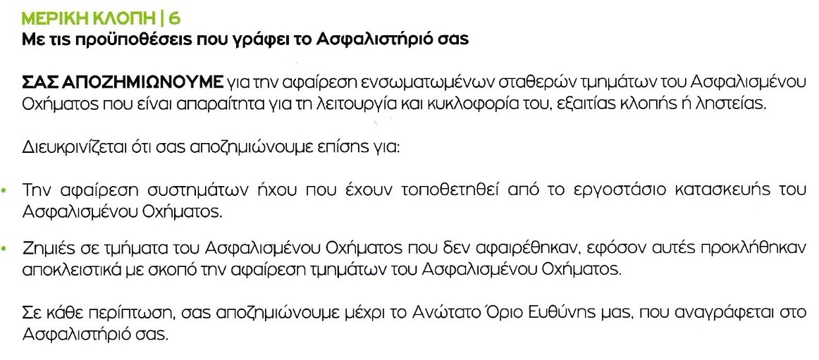 Μέντωρ Διαμεσολαβητής, 26/11/2018 - 13:09 facebook twitter linkedin Κλοπή καθρεπτών από παρκαρισμένο όχημα: Πως αποζημιώνουν τα συμβόλαια αυτοκινήτων; Μέντωρ Διαμεσολαβητής, 26/11/2018 facebook twitter linkedin Με αφορμή το περιστατικό κλοπής των κρυστάλλων από τους πλαϊνούς καθρέπτες του οχήματος της γνωστής ηθοποιού και παρουσιάστριας στο κέντρο της Αθήνας το nextdeal.gr ενημερώνει σχετικά. Η παροχή «Μερική Κλοπή» δίδεται προαιρετικά από όλα τα συμβόλαια οχημάτων όλων των εταιρειών, μαζί με την παροχή Ολική Κλοπή και αποζημιώνει τον ιδιοκτήτη για τις υλικές ζημιές που θα συμβούν από αφαίρεση τεμαχίων ή εξαρτημάτων του οχήματος, που είναι σταθερά προσδεμένα στο σώμα του και απαραίτητα για την κίνηση και την λειτουργία του. Επιπλέον στην παροχή περιλαμβάνονται και οι ζημιές που θα υποστεί το όχημα κατά την διάρκεια που είναι στην κατοχή του κλέφτη. Η αποζημίωση αφορά την πραγματική τρέχουσα αξία του αυτοκινήτου και των τεμαχίων που αφαιρέθηκαν ή καταστράφηκαν και πάντοτε έως του ύψους του ασφαλιζόμενου κεφαλαίου που έχει συμφωνηθεί. Δείτε εδώ τι αναγράφει η εταιρεία Συνεταιριστική, όμοια όλων των εταιρειών: Ο ιδιοκτήτης μόλις αντιληφθεί το συμβάν οφείλει να το καταγγείλει στην αστυνομία, να λάβει αντίγραφο του δελτίου συμβάντος και να ενημερώσει τον διαμεσολαβητή και την εταιρεία του ώστε να γίνουν οι απαραίτητες ενέργειες για την δήλωση, καταγραφή και αποζημίωση του περιστατικού. Οι πλαϊνοί καθρέπτες είναι απαραίτητοι για την ασφαλή οδήγηση και κίνηση του οχήματος και η έλλειψή τους μπορεί να οδηγήσει σε σοβαρό τροχαίο ατύχημα. Η αντικατάσταση τους δύναται να πραγματοποιηθεί ακόμα και με την συμβολή των εξειδικευμένων εταιρειών αντικατάστασης κρυστάλλων όπως για παράδειγμα Carglass, Glassdrive, Filisglass που συνεργάζονται με τις ασφαλιστικές εταιρείες προς άμεση εξυπηρέτηση του ασφαλισμένου οδηγού. Δείτε εδώ τι αναγράφει η εταιρεία Eurolife ERB όμοια όλων των εταιρειών: Εξαρτήματα που έχουν τοποθετηθεί προαιρετικά πάνω στο όχημα για λόγους διευκόλυνσης του οδηγού όπως για παράδειγμα μπαγκαζέρια, ρεζέρβα, σχάρα κ.α. συνήθως εξαιρούνται της αποζημίωσης από την παροχή Μερική Κλοπή από όλες τις εταιρείες, υπό την βάση πως τα εν λόγω εξαρτήματα δεν συμβάλλουν στην κίνηση και στην λειτουργία του οχήματος. Επιπλέον εξαιρούνται της παροχής Μερικής Κλοπής και τυχόν φθορές λόγω χρήσης, μείωση απόδοσης, μείωση εμπορικής αξίας, αφαίρεση συστημάτων εικόνας ή πλοήγησης, ζημιές σε μαλακή ή αφαιρούμενη οροφή οχήματος τύπου cabrio, (εκτός εάν κάποια κάλυψη έχει συμφωνηθεί διαφορετικά και αναγράφεται στο πίνακα παροχών του συμβολαίου), αμέλεια του ασφαλισμένου ιδιοκτήτη κ.α. και πάντοτε σύμφωνα με τους όρους του εκάστου συμβολαίου. Ιδιαίτερα σημαντικός ο ρόλος του διαμεσολαβητή να ενημερώνει και να διευκρινίζει στον ασφαλισμένο ιδιοκτήτη το εύρος των παροχών της ασφάλισης του οχήματος του. Ενημερωθείτε σήμερα από τον προσωπικό σας διαμεσολαβητή. ©Μέντωρ Διαμεσολαβητής Με πληροφορίες από protothema.gr Ακολουθήστε το Nextdeal.gr στο Google News .