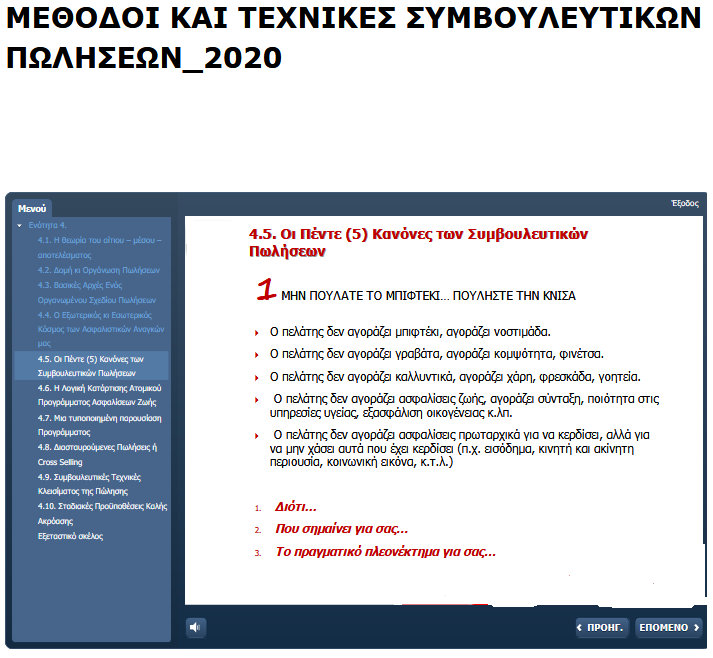 Κώστας Παπαϊωάννου, 15/4/2020 - 08:36 facebook twitter linkedin Επαναπιστοποιήσεις, στόχοι ευρωπαϊκών μέσων όρων ανάπτυξης και άλλα... ευτράπελα! Κώστας Παπαϊωάννου, 15/4/2020 facebook twitter linkedin Είναι τα προγράμματα e-learning σύγχρονα και αποτελούν πανάκεια; Πιστεύουμε πράγματι ότι με την εκπαιδευτική βοήθεια που προσφέρουμε στους ασφαλιστικούς διαμεσολαβητές, εν έτι 2020, μπορούμε να προσεγγίσουμε τους ευρωπαϊκούς μέσους όρους αποτελεσμάτων και ανάπτυξης επί του ΑΕΠ; Η κρίσιμη δεκαετία που πέρασε για την ασφαλιστική αγορά, εξ αιτίας των μνημονίων, της οικονομικής κρίσης και της σημαντικής μείωσης του Ελληνικού ΑΕΠ, σε συνδυασμό με την επιβολή της νέας νομοθεσίας και της νέας περισσότερο σφιχτής εποπτείας, ανάγκασε τις ασφαλιστικές επιχειρήσεις να λάβουν δραστικά μέτρα για την προστασία τους. Μεταξύ των κύριων εργαλείων που επέλεξαν να χρησιμοποιήσουν οι ασφαλιστικές επιχειρήσεις, στο πλαίσιο της μείωσης των δαπανών τους, ήταν δυστυχώς και η ουσιαστική αποδυνάμωση των εκπαιδευτικών δραστηριοτήτων τους. Στρατηγικό λάθος, αλλά έγινε! Σε περιόδους κρίσης, δυστυχώς και οι ίδιοι οι ασφαλιστικοί διαμεσολαβητές μείωσαν δραστικά τις εξειδικευμένες εκπαιδευτικές δραστηριότητές τους, προκειμένου να αντεπεξέλθουν οικονομικά στα παραγωγικά αδιέξοδά τους. Πώς να τα βγάλουν πέρα, άλλωστε, και να διαχειριστούν τον ορυμαγδό των αλλαγών και των πιέσεων που τους περιβάλει; Ποιο ήταν το αποτέλεσμα στην εκπαίδευση των ασφαλιστικών διαμεσολαβητών; Στην ουσία, εκπαιδευτικά έμειναν μόνο οι πιστοποιήσεις, οι επαναπιστοποιήσεις, οι προϊοντικές ενημερώσεις και κάποια σποραδικά σεμινάρια της LIMRA, της GAMA, φορέων της αγοράς κ.λπ., τα οποία συνήθως παρακολουθεί μόνο επιλεγμένο μέρος των δικτύων πώλησης! Τα αποτελέσματα των εξετάσεων πιστοποίησης στην ΤτΕ είναι, έτσι κι αλλιώς, απογοητευτικά (<50% επιτυχία), οι προϊοντικές ενημερώσεις γίνονται γιατί είναι υποχρεωτικές και αναγκαίες και τα σεμινάρια LIMRA, GAMA κ.λπ., είναι συνήθως εκτός σύγχρονης ευρωπαϊκής πραγματικότητας και απευθύνονται σε ελάχιστους! Τι έμεινε; Οι επαναπιστοποιήσεις! Και εκεί έπεσε όλο το βάρος της εκπαίδευσης και της ενημέρωσης της κύριας μάζας των ασφαλιστικών διαμεσολαβητών. Τις υποχρεωτικές επαναπιστοποιήσεις στον τομέα α (προϊόντα) τις πραγματοποιούν μόνες τους οι ασφαλιστικές επιχειρήσεις, όπως νομοθετικά οφείλουν (συνήθως μέσω e-learning). Οι επαναπιστοποιήσεις στους τομείς β και γ, συνήθως πραγματοποιούνται μέσω κάποιων εκπαιδευτικών φορέων και καλύπτουν το σύνολο σχεδόν των επιπλέον εκπαιδευτικών αναγκών των ασφαλιστικών διαμεσολαβητών, για τους οποίους οι ασφαλιστικές επιχειρήσεις δεν αναπτύσσουν δικά τους προγράμματα e-learning. Δείτε τώρα δύο παραδείγματα σελίδων από το πρόγραμμα e-learning επαναπιστοποίησης ασφαλιστικών διαμεσολαβητών στον τομέα γ’ (εγκεκριμένο από την ΤτΕ!) , που για ευνόητους λόγους έχει αφαιρεθεί το λογότυπο του εκπαιδευτικού φορέα που τις διεξάγει. Αφορούν συγκεκριμένα την κρίσιμη ενότητα Μέθοδοι και Τεχνικές Συμβουλευτικών Πωλήσεων, που είναι εξαιρετικά σημαντική, επειδή στοχεύει στο να βοηθήσει στην ανάπτυξη των πωλήσεων, παλαιότερων αλλά και νεώτερων διαμεσολαβητών. Σοβαρά τώρα;;; Το «Δεν πουλάμε το μπιφτέκι, αλλά την κνίσα» είναι ο 1ος κανόνας της Συμβουλευτικής Πώλησης (;), καθώς και (αμφίβολης αισθητικής) σκίτσα από την εκπαίδευση της δεκαετίας του 1980; Για να μάθουμε τους δια