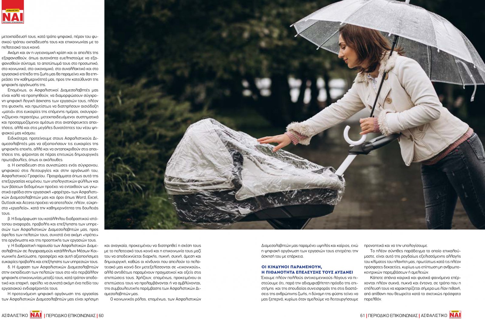 Nextdeal newsroom, 15/2/2021 - 10:20 facebook twitter linkedin Ψηφιακό μοντέλο ασφαλιστικών εργασιών και βροχερές μέρες Nextdeal newsroom, 15/2/2021 facebook twitter linkedin Aναγκαίο και επιθυμητό το ψηφιακό μοντέλο ασφαλιστικών εργασιών καθώς οι κίνδυνοι παραμένουν και οι Ασφαλιστικοί Διαμεσολαβητές καλούνται να τους αντιμετωπίσουν, στις επόμενες «βροχερές» ημέρες Γράφει ο Νίκος Δ. Σωφρονάς, Γενικός Διευθυντής Ελληνικού Ινστιτούτου Ασφαλιστικών Σπουδών Η Στατιστική της Νέας Ψηφιακής Πραγματικότητας Η πρόσφατη όξυνση της υγειονομικής κρίσης στη χώρα μας, αλλά και διεθνώς, επιβεβαιώνει την πεποίθηση ότι οι επιδράσεις της στον τρόπο ζωής και εργασίας μας, στην οικονομία και την κοινωνία μας, δεν είναι πρόσκαιρες. Αντιθέτως, αρκετές από τις επιδράσεις αυτές, κυρίως εκείνες που αφορούν στην ψηφιακή αλλαγή θεμελιωδών συνηθειών και λειτουργιών της ζωής και της εργασίας μας, αποκτούν μόνιμα χαρακτηριστικά και καθορίζουν, πλέον τον νέο κοινωνικό και οικονομικό μας «βιότοπο». Ας προσέξουμε τα ακόλουθα στατιστικά δεδομένα, καθώς φαίνεται ότι πιστοποιούν τη νεοδιαμορφωνόμενη τάση των ημερών μας: α. Ενώ τον προηγούμενο μήνα Μάρτιο, η ηλεκτρονική εμπορική δραστηριότητα στη χώρα μας ανερχόταν σε ποσοστό 5% της συνολικής, σε συντομότατο χρονικό διάστημα τριών (3) μόλις μηνών, αναρριχήθηκε σε πολλαπλάσιο ποσοστό 30% της συνολικής. β. Μετά την πρόσκαιρη εξομάλυνση των μεγεθών διαδικτυακής εμπορικής δραστηριότητας, κατά τη διάρκεια των καλοκαιρινών μηνών, το ηλεκτρονικό εμπόριο φαίνεται να ενισχύεται περαιτέρω, κατά τη διάρκεια των φθινοπωρινών μηνών, καθώς η υγειονομική κρίση οξύνεται. γ. Το διαδικτυακό εμπόριο στη χώρα μας αυξανόταν κατά μισή ποσοστιαία μονάδα ετησίως, έως τον προηγούμενο μήνα Μάρτιο. Αυτή η ετήσια αύξηση επιταχύνθηκε σε ημερήσια, κατά το ολιγόμηνο διάστημα της αναφοράς μας, όπως μόλις διαπιστώσαμε. Σε αυτό το πλαίσιο, έχει αξία να αντιληφθούμε τις προκλήσεις της νέας ψηφιακής πραγματικότητας της ζωής και της εργασίας μας, να αποκτήσουμε τα κατάλληλα «εφόδια» ανταπόκρισής μας σε αυτές, να τις αξιοποιήσουμε και να αξιολογήσουμε δημιουργικά τις αστείρευτες δυνατότητες προόδου της αγοράς μας και των στελεχών της, εν μέσω αυτών των ανατροπών και των νεοσχηματιζόμενων απαιτήσεων. Ακριβώς αυτή η δημιουργική αναφορά στις νέες συνθήκες και στις προκλήσεις τους, συνιστά μέρος του σκοπού αυτού του κειμένου, καθώς το άλλο, εξ ίσου σημαντικό, αφορά στην αδήριτη ανάγκη να επικοινωνούμε με το πελατειακό μας κοινό, να το συμβουλεύουμε σωστά και να το προστατεύουμε έναντι των κινδύνων που το απειλούν, καθώς οι κίνδυνοι αυτοί παραμένουν μεγάλοι και ποικιλόμορφοι. Άλλωστε, αυτό το τελευταίο σημείο συνιστά πρώτιστο ενδιαφέρον των παραγόντων της αγοράς μας και κύριο μέλημα των Ασφαλιστικών Διαμεσολαβητών μας. Αλλαγή, η Νέα «Σταθερά» Εάν ανατρέξουμε στην παγκόσμια ιστορία, μπορούμε να εντοπίσουμε σημαντικά επιτεύγματα της ανθρωπότητας και, επίσης, ραγδαίες επιταχύνσεις στην εξέλιξη τομέων του ενδιαφέροντός της, επιστημονικών ή άλλων, που προέκυψαν κατόπιν κρίσεων, επαναστάσεων ή αιφνίδιων ανατροπών της συνήθους κατάστασης των πραγμάτων. Αλλά και στην πλέον πρόσφατη ιστορία της χώρας μας, μπορούμε να παρατηρήσουμε δραστικές μεταβολές των συνηθειών και της συμπεριφοράς ή του τρόπου οργάνωσης και λειτουργίας μας, οι οποίες προέκυψαν ύστερα από αιφνίδια γεγονότα και ανατροπές τ