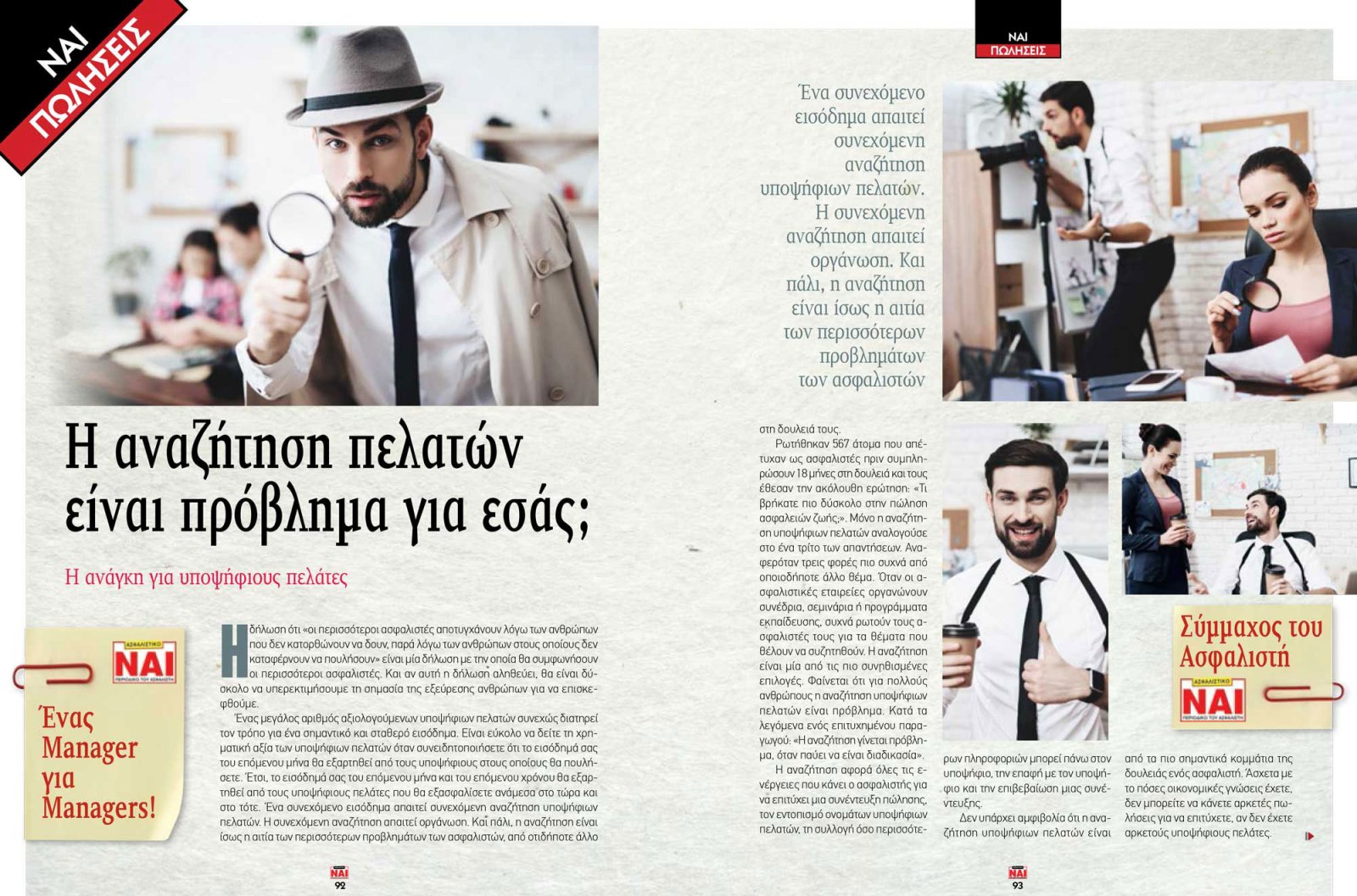 Ασφαλιστικό ΝΑΙ, 1/6/2022 - 16:17 facebook twitter linkedin Η αναζήτηση πελατών είναι πρόβλημα για εσάς; Ασφαλιστικό ΝΑΙ, 1/6/2022 facebook twitter linkedin Η δήλωση ότι «οι περισσότεροι ασφαλιστές αποτυγχάνουν λόγω των ανθρώπων που δεν κατορθώνουν να δουν, παρά λόγω των ανθρώπων στους οποίους δεν καταφέρνουν να πουλήσουν» είναι μία δήλωση με την οποία θα συμφωνήσουν οι περισσότεροι ασφαλιστές. Και αν αυτή η δήλωση αληθεύει, θα είναι δύσκολο να υπερεκτιμήσουμε τη σημασία της εξεύρεσης ανθρώπων για να επισκεφθούμε. Ένας μεγάλος αριθμός αξιολογούμενων υποψήφιων πελατών συνεχώς διατηρεί τον τρόπο για ένα σημαντικό και σταθερό εισόδημα. Είναι εύκολο να δείτε τη χρηματική αξία των υποψήφιων πελατών όταν συνειδητοποιήσετε ότι το εισόδημά σας του επόμενου μήνα θα εξαρτηθεί από τους υποψήφιους στους οποίους θα πουλήσετε. Έτσι, το εισόδημά σας του επόμενου μήνα και του επόμενου χρόνου θα εξαρτηθεί από τους υποψήφιους πελάτες που θα εξασφαλίσετε ανάμεσα στο τώρα και στο τότε. Ένα συνεχόμενο εισόδημα απαιτεί συνεχόμενη αναζήτηση υποψήφιων πελατών. Η συνεχόμενη αναζήτηση απαιτεί οργάνωση. Και πάλι, η αναζήτηση είναι ίσως η αιτία των περισσότερων προβλημάτων των ασφαλιστών, από οτιδήποτε άλλο στη δουλειά τους. Ρωτήθηκαν 567 άτομα που απέτυχαν ως ασφαλιστές πριν συμπληρώσουν 18 μήνες στη δουλειά και τους έθεσαν την ακόλουθη ερώτηση: «Τι βρήκατε πιο δύσκολο στην πώληση ασφαλειών ζωής;». Μόνο η αναζήτηση υποψήφιων πελατών αναλογούσε στο ένα τρίτο των απαντήσεων. Αναφερόταν τρεις φορές πιο συχνά από οποιοδήποτε άλλο θέμα. Όταν οι ασφαλιστικές εταιρείες οργανώνουν συνέδρια, σεμινάρια ή προγράμματα εκπαίδευσης, συχνά ρωτούν τους ασφαλιστές τους για τα θέματα που θέλουν να συζητηθούν. Η αναζήτηση είναι μία από τις πιο συνηθισμένες επιλογές. Φαίνεται ότι για πολλούς ανθρώπους η αναζήτηση υποψήφιων πελατών είναι πρόβλημα. Κατά τα λεγόμενα ενός επιτυχημένου παραγωγού: «Η αναζήτηση γίνεται πρόβλημα, όταν παύει να είναι διαδικασία». Η αναζήτηση αφορά όλες τις ενέργειες που κάνει ο ασφαλιστής για να επιτύχει μια συνέντευξη πώλησης, τον εντοπισμό ονομάτων υποψήφιων πελατών, τη συλλογή όσο περισσότερων πληροφοριών μπορεί πάνω στον υποψήφιο, την επαφή με τον υποψήφιο και την επιβεβαίωση μιας συνέντευξης. Δεν υπάρχει αμφιβολία ότι η αναζήτηση υποψήφιων πελατών είναι από τα πιο σημαντικά κομμάτια της δουλειάς ενός ασφαλιστή. Άσχετα με το πόσες οικονομικές γνώσεις έχετε, δεν μπορείτε να κάνετε αρκετές πωλήσεις για να επιτύχετε, αν δεν έχετε αρκετούς υποψήφιους πελάτες. Διαβάστε παρακάτω το ενδιαφέρον άρθρο σχετικά με την αναζήτηση υποψήφιων πελατών, που δημοσιεύθηκε στο Ασφαλιστικό ΝΑΙ, τεύχος 172, Μάιος - Ιούνιος 2018 (πατήστε πάνω στην εικόνα για μεγέθυνση): Ακολουθήστε το Nextdeal.gr στο Google News .