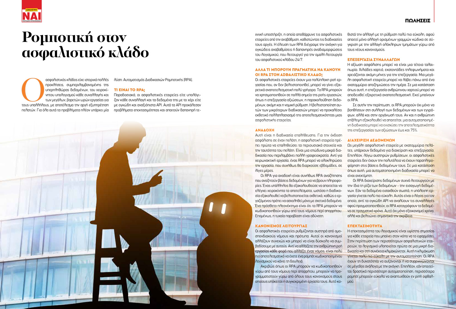Ασφαλιστικό ΝΑΙ, 7/7/2022 - 10:10 facebook twitter linkedin Ρομποτική στον ασφαλιστικό κλάδο Ασφαλιστικό ΝΑΙ, 7/7/2022 facebook twitter linkedin Ο ασφαλιστικός κλάδος είχε ιστορικά πολλές προκλήσεις, συμπεριλαμβανομένης της υπερπληθώρας δεδομένων, του χειροκίνητου υπολογισμού κάθε συναλλαγής και των μεγάλων, βαρετών ωρών εργασίας για τους υπαλλήλους με αποτέλεσμα την αργή εξυπηρέτηση πελατών. Για όλα αυτά τα προβλήματα πλέον, υπάρχει μία λύση: Αυτοματισμός Διαδικασιών Ρομποτικής (RPA). Τι είναι το RPA; Παραδοσιακά, οι ασφαλιστικές εταιρείες είτε υπολόγιζαν κάθε συναλλαγή και τα δεδομένα της, με το χέρι είτε με ογκώδη και αναξιόπιστα API. Αυτά τα API προκάλεσαν προβλήματα επεκτασιμότητας και απαιτούν δαπανηρή τεχνική υποστήριξη, η οποία αποθάρρυνε τις ασφαλιστικές εταιρείες από την αναβάθμιση, καθιστώντας τις διαδικασίες τους αργές. Η έλευση των RPA διέγραψε την ανάγκη για ογκώδεις αναβαθμίσεις ή δαπανηρές αναδιαμορφώσεις του λογισμικού που λειτουργεί για την ομαλή λειτουργία του ασφαλιστικού κλάδου 24/7. Αλλά τι μπορούν πραγματικά να κάνουν οι RPA στον ασφαλιστικό κλάδο; Οι ασφαλιστικές εταιρείες έχουν μια πολύπλοκη ροή εργασίας που, αν δεν βελτιστοποιηθεί , μπορεί να γίνει εξαιρετικά αναποτελεσματική πολύ γρήγορα. Τα RPA μπορούν να χρησιμοποιηθούν σε πολλά σημεία της ροής εργασιών, όπως η επεξεργασία αξιώσεων, η παρακολούθηση δεδομένων, ακόμη και η νομική ρύθμιση. Η βελτιστοποίηση αυτών των μικρότερων διαδικασιών μπορεί να προκαλέσει εκθετικό πολλαπλασιασμό της αποτελεσματικότητας μιας ασφαλιστικής εταιρείας. Αναδοχή Αυτή είναι η διαδικασία επαλήθευσης. Για την έκδοση ασφάλισης σε έναν πελάτη, η ασφαλιστική εταιρεία πρέπει πρώτα να επαληθεύσει τα περιουσιακά στοιχεία και την ταυτότητα του πελάτη. Είναι μια επώδυνα μακρά διαδικασία που περιλαμβάνει πολλή γραφειοκρατία. Αντί για χειρωνακτική εργασία , ένας RPA μπορεί να ολοκληρώσει την εργασία που συνήθως θα διαρκούσε εβδομάδες σε λίγες μέρες. Οι RPA για αναδοχή είναι συνήθως RPA αναζήτησης που αναζητούν βάσεις δεδομένων για να βρουν πληροφορίες. Ένας υπάλληλος θα εξακολουθούσε να απαιτείται να ελέγχει χειροκίνητα τα αποτελέσματα, ωστόσο, η διαδικασία εξακολουθεί να βελτιστοποιείται εκθετικά , καθώς ο εργαζόμενος πρέπει να ασχοληθεί μόνο με σχετικά δεδομένα. Ένα πρόσθετο πλεονέκτημα είναι ότι τα RPA μπορούν να κωδικοποιηθούν γύρω από τους νόμους περί απορρήτου. Επομένως, η τυχαία παραβίαση είναι αδύνατη. Κανονισμός λειτουργίας Οι ασφαλιστικές εταιρείες ρυθμίζονται αυστηρά από ομοσπονδιακούς νόμους και πρότυπα. Αυτοί οι κανονισμοί αλλάζουν συνεχώς και μπορεί να είναι δύσκολο να συμβαδίσουμε με αυτούς. Αντί να αλλάζετε την ανθρώπινη ροή εργασίας κάθε φορά που αλλάζει ένας νόμος, είναι πολύ πιο αποτελεσματικό να έχετε ένα ρομπότ κωδικοποιημένου λογισμικού να κάνει τη δουλειά. Ακριβώς όπως οι RPA μπορούν να κωδικοποιηθούν γύρω από τους νόμους περί απορρήτου, μπορούν να προγραμματιστούν γύρω από όλους τους κανονισμούς στους οποίους υπόκειται η συγκεκριμένη εργασία τους. Αυτό καθιστά την αλλαγή με τη ρύθμιση πολύ πιο εύκολη αφού απαιτεί μόνο αλλαγή ορισμένων γραμμών κώδικα σε σύγκριση με την αλλαγή ολόκληρων τμημάτων γύρω από τους νέους κανονισμούς. Επεξεργασία συναλλαγών Η αξίωση ασφάλισης μπορεί να είναι μια τέτοια ταλαιπωρία. Χιλιάδες χαρτιά, εκατοντάδες τηλεφωνήματα και χρειάζονται ακόμη μήνες για την ε