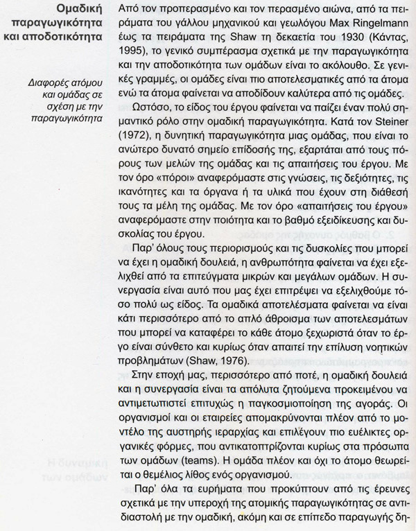 Σμαρούλα Παντελή, 25/1/2016 - 14:58 facebook twitter linkedin Ομαδική ή ατομική παραγωγικότητα και αποδοτικότητα στο 2016; Σμαρούλα Παντελή, 25/1/2016 facebook twitter linkedin Της ψυχολόγου Σμαρούλας Παντελή* Στην εποχή μας, περισσότερο από ποτέ, η ομαδική δουλειά και η συνεργασία είναι απαραίτητα προκειμένου να αντιμετωπιστεί επιτυχώς η παγκοσμιοποίηση της αγοράς. Οι ομάδα πλέον και όχι το άτομο θεωρείται ο θεμέλιος λίθος ενός οργανισμού. Ποια είναι όμως τα σημαντικότερα επιχειρήματα που υποστηρίζουν την ομαδική δουλειά και ποια είναι τα προβληματικά φαινόμενα της ομαδικής παραγωγικότητας και λήψης αποφάσεων; NEWSLETTER Λάβετε τα καλύτερα του Nextdeal στα εισερχόμενά σας, κάθε μέρα. *Ποια είναι η Σμαρούλα Παντελή Σμαρούλα ΠαντελήΗ Σμαρούλα Παντελή είναι διδάκτωρ ψυχολογίας του πανεπιστημίου Surrey της Αγγλίας. Από το 1986 συνεργάζεται με μεγάλες εταιρίες και οργανισμούς και διευθύνει βιωματικά σεμινάρια για τα στελέχη τους με θέματα σχετικά με τις ανθρώπινες σχέσεις, την ομαδικότητα και τη Συναισθηματική Νοημοσύνη. Από το 2002 μέχρι το 2009 συνεργάστηκε με το πανεπιστήμιο Πειραιώς και δίδαξε στο μεταπτυχιακό πρόγραμμα MBA Τουρισμού, καθώς και στο προπτυχιακό πρόγραμμα του Τμήματος Οργάνωσης και Διοίκησης Επιχειρήσεων σε συνεργασία με τον καθηγητή Ε. Κονδύλη. Εργάζεται ως ψυχοθεραπεύτρια εφαρμόζοντας ατομική και ομαδική θεραπεία, ψυχόδραμα και κοινωνιόδραμα. Έχει γράψει βιβλία ψυχολογίας, θεματικά ημερολόγια και παιδαγωγικές ιστορίες για παιδιά του Δημοτικού. Αρθρογραφεί στο Ασφαλιστικό ΝΑΙ από τις αρχές του 1990 με άρθρα για ασφαλιστές και όχι μόνο. Υπήρξε ομιλητής σε συνέδρια και εισηγητής σεμιναρίων στις πιο μεγάλες ασφαλιστικές εταιρίες. Από το 1991 διευθύνει το Ελληνικό Ινστιτούτο Επικοινωνίας και Ανθρώπινων Σχέσεων, έναν μη κερδοσκοπικό οργανισμό για την προαγωγή των υγιών ανθρώπινων σχέσεων. Η διεύθυνσή της στο διαδίκτυο είναι www.mirazomai.com. Πολύ ενδιαφέρον για ασφαλιστές και συντονιστές είναι το βιβλίο "Τα μυστικά της Ομαδικής Επιτυχίας - Από τη Θεωρία στην Πράξη", εκδόσεις "ΚΡΙΤΙΚΗ", απόσπασμα του οποίου αποτελεί το παρόν δημοσίευμα. www.mirazomai.com [email protected] Ακολουθήστε το Nextdeal.gr στο Google News .