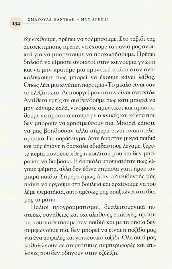 Σμαρούλα Παντελή, 13/10/2017 - 12:14 facebook twitter linkedin Αυτοεκτίμηση (Self-esteem): Είμαστε ευέλικτοι και προσαρμοστικοί διατηρώντας το δικαίωμα της αλλαγής πορείας Σμαρούλα Παντελή, 13/10/2017 facebook twitter linkedin Ξεκινώντας το ταξίδι της αυτοεκτίμησης βάζουμε κάποιους αρχικούς στόχους. Αυτό δε σημαίνει πως δεν έχουμε το δικαίωμα να τους επαναπροσδιορίζουμε. Εκτός αυτού, μπορούμε ακόμη να επαναπροσδιορίσουμε και το δρόμο, την πορεία που θ’ ακολουθήσουμε… Διαβάστε ένα πολύ ενδιαφέρον κεφάλαιο από το βιβλίο της ψυχολόγου Σμαρούλας Παντελή* "Μου αρέσω - Ένα βιβλίο για την αυτοεκτίμηση", εκδόσεις "Ταξιδευτής": NEWSLETTER Λάβετε τα καλύτερα του Nextdeal στα εισερχόμενά σας, κάθε μέρα. Βιογραφικό Σμαρούλας Παντελή Η Σμαρούλα Παντελή είναι διδάκτωρ ψυχολογίας του πανεπιστημίου Surrey της Αγγλίας. Από το 1986 συνεργάζεται με μεγάλες εταιρίες και οργανισμούς και διευθύνει βιωματικά σεμινάρια για τα στελέχη τους με θέματα σχετικά με τις ανθρώπινες σχέσεις, την ομαδικότητα και τη Συναισθηματική Νοημοσύνη. Από το 2002 μέχρι το 2009 συνεργάστηκε με το πανεπιστήμιο Πειραιώς και δίδαξε στο μεταπτυχιακό πρόγραμμα MBA Τουρισμού, καθώς και στο προπτυχιακό πρόγραμμα του Τμήματος Οργάνωσης και Διοίκησης Επιχειρήσεων σε συνεργασία με τον καθηγητή Ε. Κονδύλη. Εργάζεται ως ψυχοθεραπεύτρια εφαρμόζοντας ατομική και ομαδική θεραπεία, ψυχόδραμα και κοινωνιόδραμα. Έχει γράψει βιβλία ψυχολογίας, θεματικά ημερολόγια και παιδαγωγικές ιστορίες για παιδιά του Δημοτικού. Αρθρογραφεί στο Ασφαλιστικό ΝΑΙ από τις αρχές του 1990 με άρθρα για ασφαλιστές και όχι μόνο. Υπήρξε ομιλητής σε συνέδρια και εισηγητής σεμιναρίων στις πιο μεγάλες ασφαλιστικές εταιρίες. Από το 1991 διευθύνει το Ελληνικό Ινστιτούτο Επικοινωνίας και Ανθρώπινων Σχέσεων, έναν μη κερδοσκοπικό οργανισμό για την προαγωγή των υγιών ανθρώπινων σχέσεων. Η διεύθυνσή της στο διαδίκτυο είναι www.mirazomai.com. Ακολουθήστε το Nextdeal.gr στο Google News .