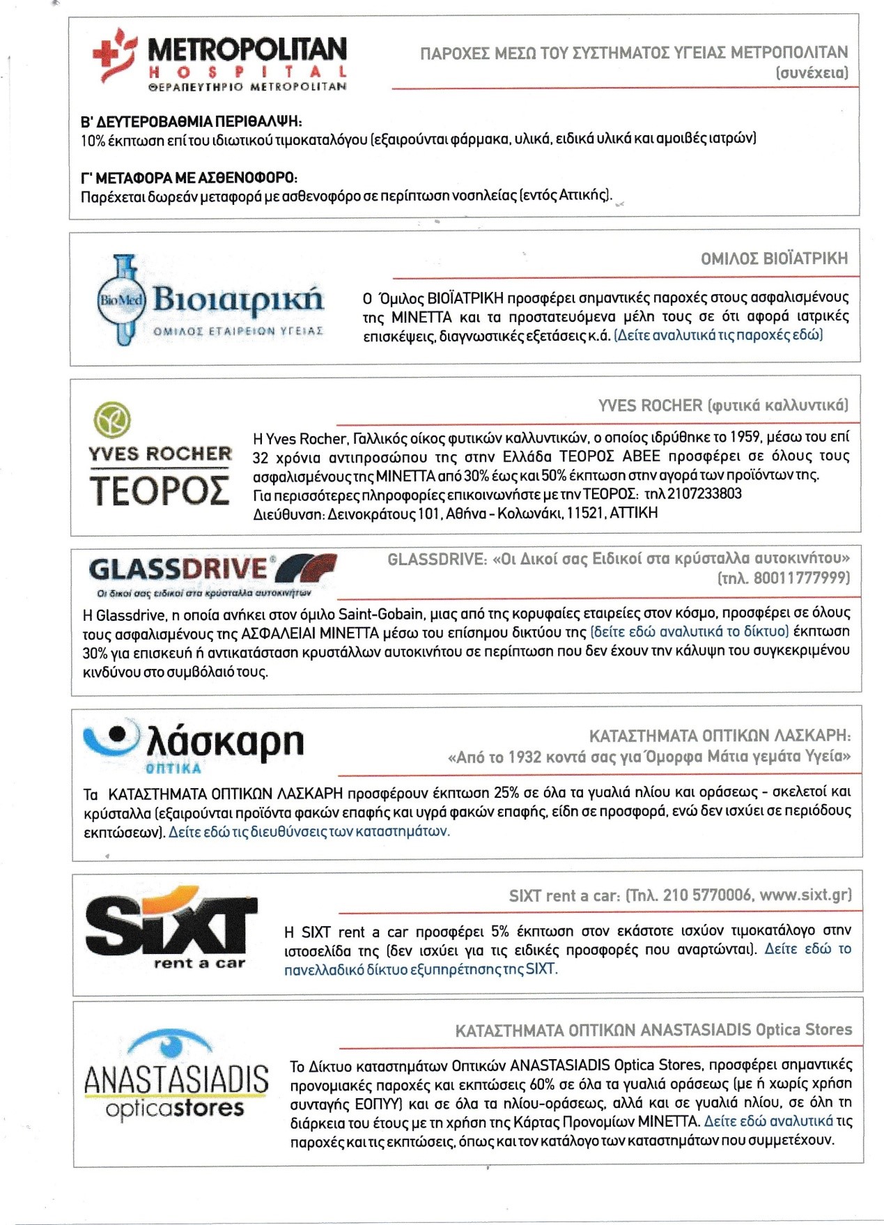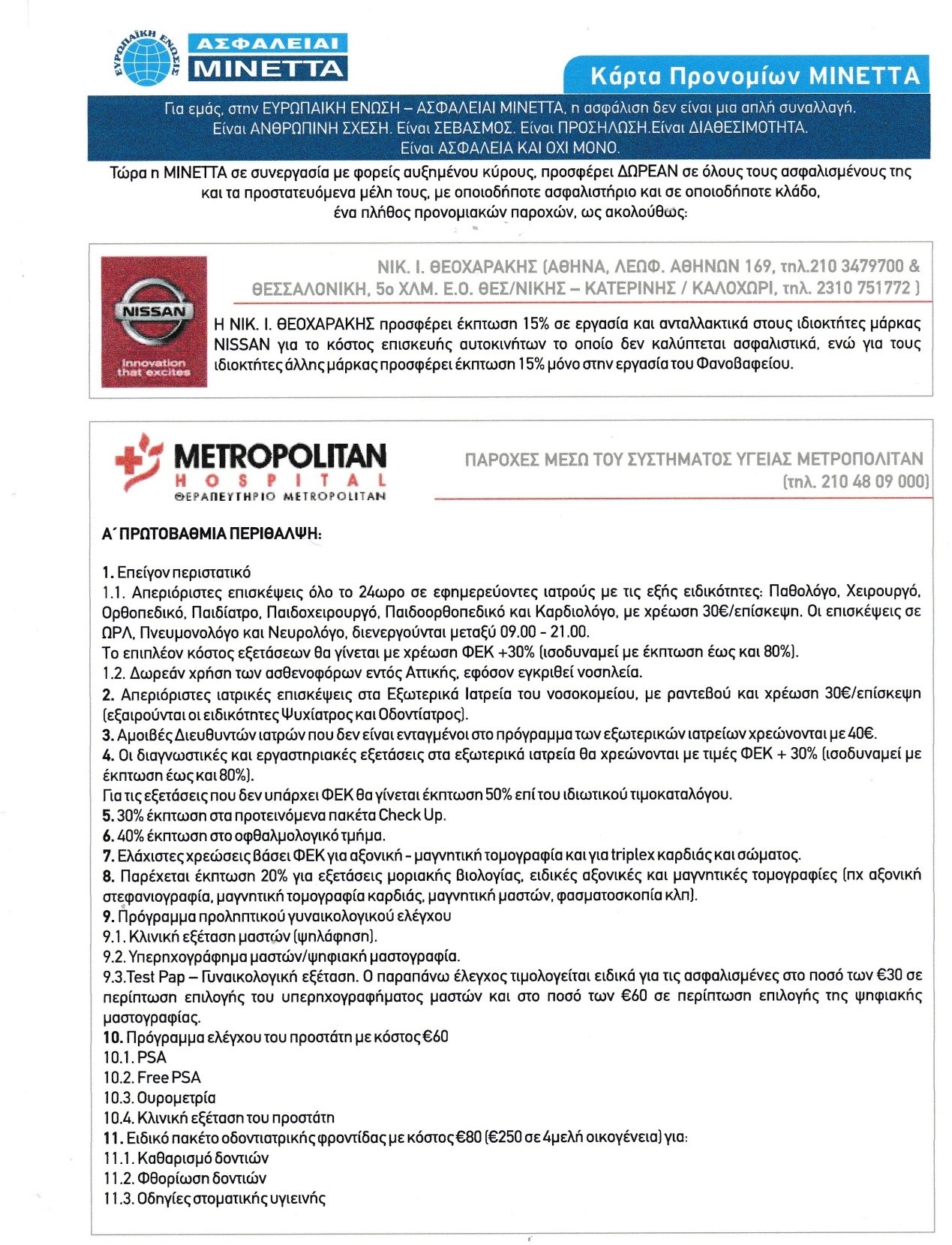 Nextdeal newsroom, 12/12/2016 - 11:42 facebook twitter linkedin Γνωρίστε ένα πλήθος προνομιακών παροχών από τις ασφάλειες Μινέττα! Nextdeal newsroom, 12/12/2016 facebook twitter linkedin Η Μινέττα Ασφαλιστική παρέχει Δωρεάν σε όλους τους ασφαλισμένους πρόσβαση στο Θεραπευτήριο Metropolitan! Με απόλυτο σεβασμό προς τις ανάγκες του σύγχρονου ανθρώπου, η Μινέττα Ασφαλιστική παρέχει σε όλους τους πελάτες της, προνομιακή πρόσβαση στο Ιδιωτικό Θεραπευτήριο Metropolitan .Ο ασφαλισμένος με συμβόλαιο Μινέττα και όλα τα μέλη της οικογένειάς του, μπορούν να επωφεληθούν από σημαντικές εκπτώσεις και προσφορές της κάρτας προνομίων που παρέχει η εταιρεία ΔΩΡΕΑΝ μαζί με κάθε συμβόλαιο της. Εκτός των άλλων η Νικ.Ι. Θεοχαράκης προσφέρει 15% έκπτωση σε εργασία και ανταλλακτικά σε όλους τους ιδιοκτήτες οχημάτων μάρκας Nissan για το κόστος επισκευής των αυτοκίνητων που δεν καλύπτεται ασφαλιστικά, ενώ για τους ιδιοκτήτες άλλης μάρκας προσφέρει έκπτωση 15% στην εργασία του φανοβαφείου. Δείτε εδώ τις παροχές της κάρτας προνομίων ΜΙΝΕΤΤΑ σύμφωνα με το www.minetta.gr : Επιπλέον για τα συμβόλαια οχημάτων σύμφωνα με το www.minetta.gr η εταιρεία επιβραβεύει με έως και 30% έκπτωση στα ασφάλιστρα των αφοσιωμένων πελατών ή και επιπλέον εκπτώσεις σε συμβόλαια περιουσίας, ή και άλλων κλάδων όταν ο ασφαλισμένος διατηρεί ανάλογα συμβόλαια. Σε μία εποχή ισχνών αγελάδων η Μινέττα Ασφαλιστική προσφέρει ποιότητα, παροχές και ανταγωνιστικά ασφάλιστρα σε όλους τους κλάδους ασφάλισης.Αξιολογήστε τα οφέλη και τηλεφωνήστε σήμερα στον ασφαλιστικό σας διαμεσολαβητή! Εάν ανήκετε στους διαμεσολαβούντες πάσης κατηγορίας και δεν έχετε συνεργασία, ζητήστε να μάθετε για το πως μπορείτε να ξεκινήσετε άμεσα τη δική σας! ©Μέντωρ Διαμεσολαβητής Ακολουθήστε το Nextdeal.gr στο Google News .