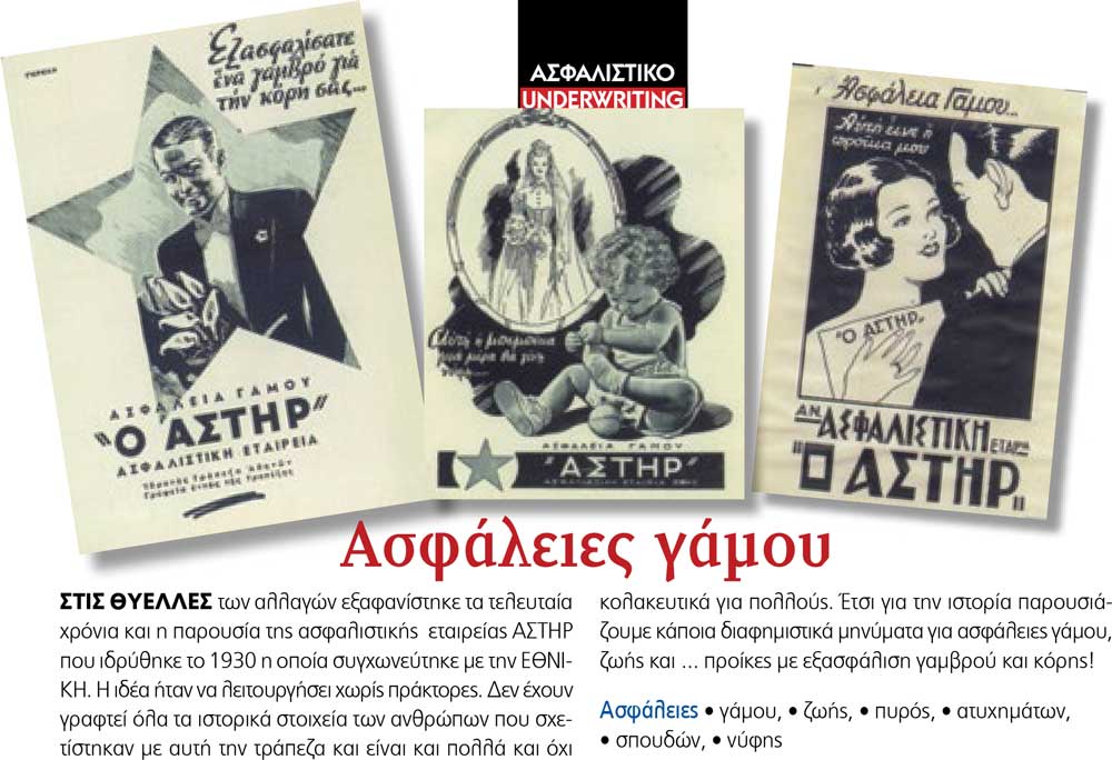 Nextdeal newsroom, 6/2/2018 - 10:05 facebook twitter linkedin Ασφάλειες γάμου Nextdeal newsroom, 6/2/2018 facebook twitter linkedin Στις θύελλες των αλλαγών εξαφανίστηκε τα τελευταία χρόνια και η παρουσία της ασφαλιστικής εταιρείας ΑΣΤΗΡ που ιδρύθηκε το 1930 η οποία συγχωνεύτηκε με την ΕΘΝΙΚΗ. Η ιδέα ήταν να λειτουργήσει χωρίς πράκτορες. Δεν έχουν γραφτεί όλα τα ιστορικά στοιχεία των ανθρώπων που σχετίστηκαν με αυτή την τράπεζα και είναι και πολλά και όχι κολακευτικά για πολλούς. Έτσι για την ιστορία παρουσιάζουμε κάποια διαφημιστικά μηνύματα για ασφάλειες γάμου, ζωής και... προίκες με εξασφάλιση γαμβρού και κόρης! Ασφάλειες • γάμου, • ζωής, • πυρός, • ατυχημάτων, • σπουδών, • νύφης. Ακολουθήστε το Nextdeal.gr στο Google News .