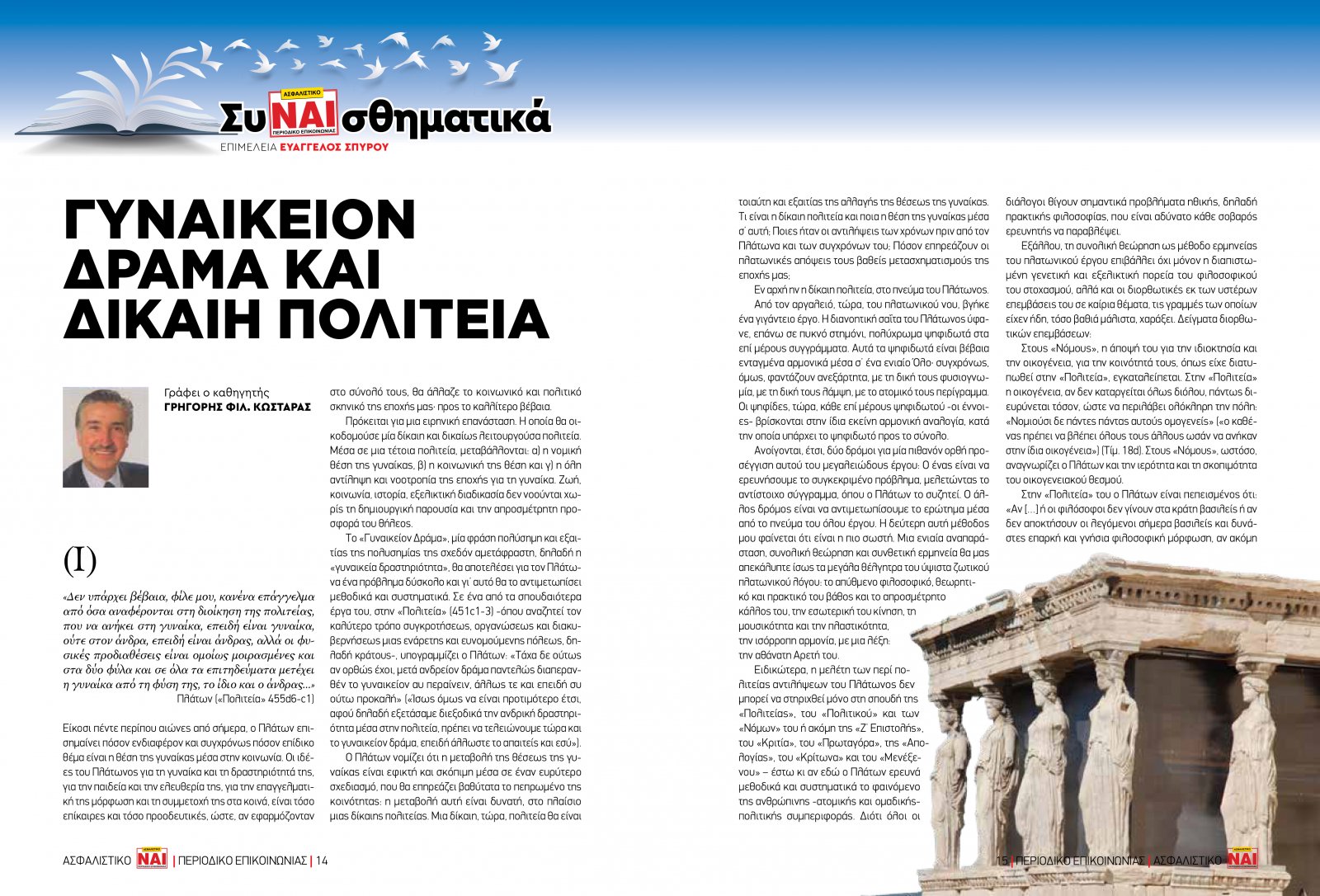 Γρηγόρης Κωσταράς, 20/9/2021 - 12:15 facebook twitter linkedin Γυναικείον Δράμα και Δίκαιη Πολιτεία Γρηγόρης Κωσταράς, 20/9/2021 facebook twitter linkedin "«Γυναικείον Δράμα» είναι μία φράση πολύσημη και εξαιτίας της πολυσημίας της σχεδόν αμετάφραστη, που σημαίνει δραστηριότητα", γράφει στην ενότητα ΣυΝΑΙσθηματικά του περιοδικού Ασφαλιστικό ΝΑΙ ο ομ. καθηγητής Πανεπιστημίου Αθηνών Γρηγόρης Φιλ. Κωσταράς. Διαβάστε το άρθρο του κ. Κωσταρά όπως δημοσιεύθηκε στο περιοδικό Ασφαλιστικό ΝΑΙ, τεύχος 191, Ιούλιος - Αύγουστος 2021 (πατήστε πάνω την εικόνα για μεγέθυνση): Ακολουθήστε το Nextdeal.gr στο Google News .