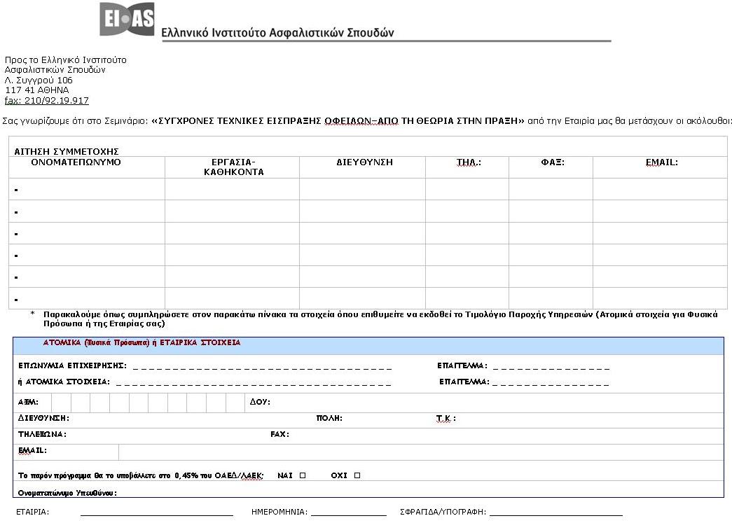 Nextdeal newsroom, 29/8/2011 - 13:18 facebook twitter linkedin Σύγχρονες τεχνικές είσπραξης οφειλών στο ΕΙΑΣ Nextdeal newsroom, 29/8/2011 facebook twitter linkedin Το Σεμινάριο με θέμα τις σύγχρονες τεχνικές είσπραξης οφειλών πρόκειται να πραγματοποιήσει το Ελληνικό Ινστιτούτο Ασφαλιστικών Σπουδών την Τρίτη 27 Σεπτεμβρίου. Το σεμινάριο διάρκειας 8 εκπαιδευτικών ωρών, θα πραγματοποιηθεί στο εκπαιδευτικό κέντρο του ΕΙΑΣ (Λ. Συγγρού 106, στον 5ο όροφο) με εισηγήτρια τη Σύμβουλο Εκπαίδευσης κυρία Κωνστάντιου Μαίρη. Σκοπός του Σεμιναρίου είναι η εκπαίδευση του προσωπικού της Εταιρίας στις τεχνικές είσπραξης οφειλών, έτσι ώστε να αυξηθούν οι εισπράξεις από πελάτες που έχουν καθυστερήσει τις πληρωμές τους. Η εκπαίδευση ενισχύει τις διαπροσωπικές δεξιότητες στο τηλέφωνο και επικεντρώνεται στη δομή της συζήτησης, στη διαπραγμάτευση στην αντιμετώπιση αντιρρήσεων και στον τρόπο καθοδήγησης του πελάτη στο απαιτούμενο αποτέλεσμα. Επιπρόσθετα, θα πρέπει να διατηρηθεί μια σωστή και επαγγελματική σχέση με το πελάτη. Το Σεμινάριο απευθύνεται σε υπαλλήλους, στελέχη των κεντρικών υπηρεσιών οποιασδήποτε βαθμίδας των διαφόρων επιχειρήσεων που σχετίζονται άμεσα ή έμμεσα με συναλλαγές πελατών και με τις εισπράξεις, με στόχο να μειωθούν τα χρεωστικά υπόλοιπα από πελάτες που έχουν καθυστερήσει τις πληρωμές τους. Η εκπαίδευση έχει συγκεκριμένη δομή, έτσι ώστε οι συμμετέχοντες να αφομοιώσουν τις δεξιότητες κα τις τεχνικές που διδάχθηκαν. Είναι συμμετοχική και μπορεί να προσαρμοστεί στις καθημερινές εργασιακές συνθήκες των συμμετεχόντων. Κατά τη διάρκεια του σεμιναρίου οι συμμετέχοντες θα παρακολουθήσουν σχετικά video και θα εξασκηθούν μέσω πρακτικών ασκήσεων και εφαρμογών. Θα συμμετέχουν σε Role-Plays όπου θα εναλλάσσονται οι ρόλοι του πελάτη, του υπευθύνου εισπράξεων και του παρατηρητή. Στόχος είναι οι συμμετέχοντες, να αξιολογηθούν και να βελτιώσουν τις ικανότητες τους, με κύριο μέλημα τους την αύξηση των εισπράξεων από πελάτες που καθυστερούν τις πληρωμές τους. Οι συμμετέχοντες στο τέλος του σεμιναρίου θα είναι σε θέση να: Αναγνωρίσουν τη σημασία του ρόλου τους για την εταιρία Χρησιμοποιούν μια καλά οργανωμένη προσέγγιση σε κάθε στάδιο του τηλεφωνήματος για την είσπραξη των χρεωστικών υπολοίπων των πελατών, από την αρχική προετοιμασία μέχρι τις ενέργειες της παρακολούθησης και της τήρησης των συμφωνηθέντων από την πλευρά του πελάτη Αναγνωρίσουν την σημασία και την σπουδαιότητα των λεκτικών μηνυμάτων κατά τη διάρκεια του τηλεφωνήματος Χρησιμοποιούν κάποιες βασικές τεχνικές για να ξεπερνούν τις δικαιολογίες του πελάτη Αποσπούν την δέσμευση του πελάτη μετά από κάθε τηλεφώνημα Ενδεικτικά αναφέρονται τα θέματα που θα αναπτυχθούν κατά τη διάρκεια του Σεμιναρίου: Πώς να αποφεύγει ο υπεύθυνος εισπράξεων να «μιλάει μόνος του» χωρίς να τον ακούει ο συνομιλητής του Πώς να χειρίζεται τις υπεκφυγές Πώς να χειρίζεται την «συναισθηματική φόρτιση» του πελάτη Πώς να χειρίζεται τους εκνευρισμένους και «βίαιους» πελάτες Πώς να καθοδηγεί τον πελάτη έτσι ώστε να ενισχύσει την δέσμευση του για πληρωμή Πώς να ξεκινήσει την συζήτηση με τον πελάτη για την πληρωμή των ληξιπρόθεσμων οφειλών Πώς να χρησιμοποιεί τις τεχνικές ερωτήσεων με στόχο τον διακανονισμό πληρωμής Πώς να χειρίζεται τις αντιρρήσεις του πελάτη Πώς να επιτευχθεί συμφωνία για συγκεκριμένο διακανονισμό Πώς να κλείσει την συζήτηση και τα β