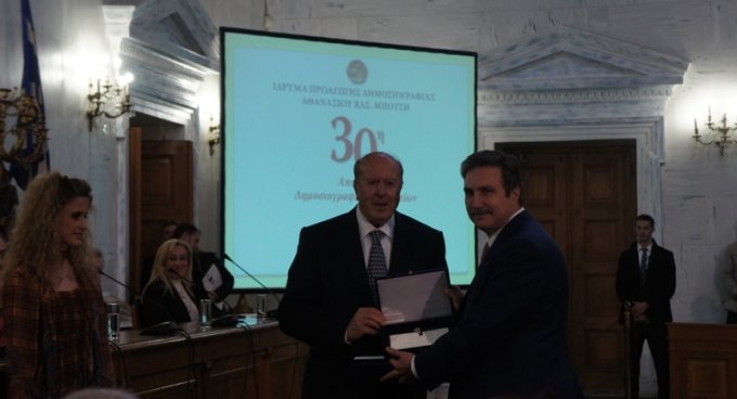 Nextdeal newsroom, 17/12/2013 - 15:56 facebook twitter linkedin Βραβείο δημοσιογραφίας στον Ευάγγελο Σπύρου Nextdeal newsroom, 17/12/2013 facebook twitter linkedin Ο εκδότης και δημοσιογράφος κ.Ευάγγελος Σπύρου παρέλαβε σε εκδήλωση στην αίθουσα της Παλιάς Βουλής στην Αθήνα, το Βραβείο «Βλάσσης Σωκρατίδης» από το Ίδρυμα Προαγωγής Δημοσιογραφίας Αθανασίου Μπότση για το 2013, παρουσία του Προέδρου της Δημοκρατίας κ.Κάρολου Παπούλια. Ο κ.Ευάγγελος Σπύρου βραβεύθηκε για την έκδοση των περιοδικών Ασφαλιστικό ΝΑΙ, Bancassurance & Banking, των εφημερίδων Nextdeal και «Παιδικός Σταθμός για Γονείς, καθώς και για το συγγραφικό του έργο. Το Ίδρυμα Μπότση βραβεύει κάθε χρόνο τους δημοσιογράφους, τα έντυπα, τα μέσα ενημέρωσης που σέβονται το δικαίωμα των πολιτών για ενημέρωση» τόνισε ο πρόεδρος του Ιδρύματος, Πάνος Καραγιάννης, ο οποίος απευθυνόμενος στον Πρόεδρο της Δημοκρατίας, είπε: «Αυτήν τη σκληρή περίοδο που δοκιμάζεται ο ελληνικός λαός και η χώρα μας, υψώσατε αυστηρό λόγο απέναντι στις παράλογες και εξοντωτικές απαιτήσεις των ξένων δανειστών και ο λόγος αυτός ανύψωσε το ηθικό και έδωσε ελπίδα στους Έλληνες. Ειδικότερα: Τα τέσσερα βραβεία του Ιδρύματος απονεμήθηκαν από τον Πρόεδρο της Δημοκρατίας, Κάρολο Παπούλια: Στη Ρένα Κουβελιώτη, που εργάζεται στον τηλεοπτικό σταθμό Alpha, για τα αποκαλυπτικά και αποκλειστικά ρεπορτάζ στη διάρκεια τους έτους. Στον Ανδρέα Παναγόπουλο για την επιστημονική του έρευνα σχετικά με τη διαδικτυακή ειδησεογραφία στην Ελλάδα. Δημοσιογραφεί στο Αθηναϊκό– Μακεδονικό Πρακτορείο Ειδήσεων και στον ΑΝΤ1. Στον Κώστα Αργυρό για την προσέγγιση στην παρουσίαση της «Ευρώπης των 27» με σειρά τηλεοπτικών εκπομπών. Στο Μορφωτικό Ίδρυμα της ΕΣΗΕΜ- Θ για το σύνολο της πολιτιστικής δράσης του, ως φορέας, αλλά και ως προσφορά των δημοσιογράφων. Το βραβείο παρέλαβε ο πρόεδρος της ΕΣΗΕΜ- Θ, Μάκης Βοϊτσίδης. Από τα ειδικά βραβεία: Τα βραβεία Κοινοβουλευτικού Ρεπορτάζ, με χορηγό τη Βουλή των Ελλήνων, απονεμήθηκαν από τον πρόεδρο της Βουλής, Ευάγγελο Μεϊμαράκη. Το βραβείο «Γιάννης Φάτσης» δόθηκε στην Πηνελόπη Γκάλιου για την πληρότητα κάλυψης του νομοθετικού έργου και του κοινοβουλευτικού ελέγχου της Βουλής, στον τηλεοπτικό και ραδιοφωνικό σταθμό «Σκάι» και στον διαδικτυακό τόπο skai.gr, ενώ το βραβείο «Χρήστος Πασαλάρης» δόθηκε στην Αντιγόνη Πανέλλη για την αντικειμενική κάλυψη, επί δέκα χρόνια, των εργασιών της Βουλής και την επιτυχή προβολή- ανάλυση θεμάτων της κοινοβουλευτικής δραστηριότητας, στο Αθηναϊκό- Μακεδονικό Πρακτορείο Ειδήσεων. Τα βραβεία Οικονομικού Ρεπορτάζ, με χορηγό το Εμπορικό και Βιομηχανικό Επιμελητήριο Αθηνών, απονεμήθηκαν από τον αντιπρόεδρο του ΕΒΕΑ, Παύλο Θωμόγλου στους Γιώργο Πουλερέ για την αναλυτική καταγραφή της οικονομικής και επιχειρηματικής δραστηριότητας και την αντικειμενική ενημέρωση της κοινής γνώμης στην εφημερίδα «Τα Νέα» και στη Χριστίνα Κοψίνη για το πλήρες ρεπορτάζ και την αρθρογραφία σε επίκαιρα οικονομικά, εργασιακά και οικονομικοκοινωνικά θέματα στην εφημερίδα «Η Καθημερινή». Το βραβείο Τοπικής Αυτοδιοίκησης, με χορηγό τον δήμο Αθηναίων, απονεμήθηκε από τον δήμαρχο Αθηναίων, Γιώργο Καμίνη, στον Άρη Χατζηγεωργίου που καλύπτει το συγκεκριμένο ρεπορτάζ στην εφημερίδα «Ελεύθερος Τύπος» και το βραβείο «Βλάσσης Σωκρατίδης», με χορηγό την Ένωση Δημοσιογράφων Ιδιοκτητών Περιοδικού Τύπου, στον Ευάγγελο Σπύρου για την έκδοση δύο περιοδικών με θέμ