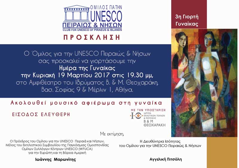 Nextdeal newsroom, 17/3/2017 - 15:46 facebook twitter linkedin Ο Όμιλος UNESCO Πειραιώς και Νήσων τιμά και φέτος τη γυναίκα! Nextdeal newsroom, 17/3/2017 facebook twitter linkedin Μεγάλη γιορτή αφιερωμένη στις γυναίκες, με αφορμή την παγκόσμια ημέρα της γυναίκας που για 3η συνεχή χρονιά διοργανώνει ο Όμιλος UNESCO Πειραιώς και Νήσων. Η εκδήλωση θα πραγματοποιηθεί την Κυριακή 19 Μαρτίου 2017 και ώρα 19:30, στο Αμφιθέατρο του Ιδρύματος Τεχνών και Μουσικής Θεοχαράκη (Μέρλιν 1 και Βασ. Σοφίας). Όπως κάθε χρονιά λοιπόν έτσι και φέτος θα βραβευτούν σημαντικές κυρίες από διάφορους χώρους (τηλεόρασης, αθλητικό, επιχειρηματικό, πολιτισμού, γραμμάτων, τεχνών κα) όπου η καθεμία έχει ξεχωρίσει. Στην εκδήλωση χαιρετισμό θα απευθύνει η Πρόεδρος του Ιδρύματος Εικαστικών Τεχνών και Μουσικής Β&Μ Θεοχαράκη, κα Μαρίνα Θεοχαράκη. Δείτε την επίσημη πρόσκληση της εκδήλωσης, καθώς και αφιερωματικό βίντεο από τις προηγούμενες χρονιές: Ακολουθήστε το Nextdeal.gr στο Google News .