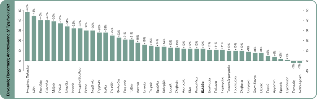 Nextdeal newsroom, 14/9/2021 - 15:45 facebook twitter linkedin Ποιες οι προοπτικές προσλήψεων στον χρηματοοικονομικό κλάδο για το Δ' Τρίμηνο 2021 Nextdeal newsroom, 14/9/2021 facebook twitter linkedin Σύμφωνα με την Έρευνα Προοπτικών Απασχόλησης της ManpowerGroup που δημοσιεύτηκε σήμερα, 760 Έλληνες εργοδότες καταγράφουν συγκρατημένες προοπτικές προσλήψεων για το χρονικό διάστημα από τον Οκτώβριο έως και τον Δεκέμβριο. Με το 20% των εργοδοτών να αναμένει αύξηση του αριθμού των απασχολουμένων, το 15% να προβλέπει μείωση και το 61% να μην προβλέπει κάποια αλλαγή, οι Συνολικές Προοπτικές Απασχόλησης ανέρχονται σε +5%. Οι προοπτικές προσλήψεων αποδυναμώνονται κατά 2 ποσοστιαίες μονάδες σε σύγκριση με το προηγούμενο τρίμηνο, αλλά βελτιώνονται κατά 5 ποσοστιαίες μονάδες σε σχέση με το αντίστοιχο τρίμηνο του προηγούμενου έτους. Επιπρόσθετα ευρήματα της έρευνας καταγράφουν το 72% των Ελλήνων εργοδοτών αντιμετωπίζουν δυσκολία κάλυψης θέσεων εργασίας λόγω έλλειψης εξειδικευμένων ταλέντων. Το ίδιο ποσοστό (72%) αναφέρεται και για τις ΕΜΕΑ χώρες. Παρόλο αυτά, οι εργοδότες προσφέρουν ένα εύρος κινήτρων για την κάλυψη της έλλειψης ταλέντου: Η εκπαίδευση, η ανάπτυξη δεξιοτήτων ή η επαγγελματική καθοδήγηση (55%) μαζί με τα ευέλικτα ωράρια εργασίας (42%) είναι οι πιο δημοφιλείς επιλογές, ακολουθούν τα οικονομικά κίνητρα όπως υψηλότεροι μισθοί (39%) και μπόνους (29%). Όπως αναφέρουν οι εργοδότες, το μεγαλύτερο εμπόδιο αναφορικά με την αύξηση εφαρμογής προγραμμάτων ανάπτυξης δεξιοτήτων στον οργανισμό τους είναι: τα χρήματα (33%), ο χρόνος (16%) και η πρόσβαση στους κατάλληλους συνεργάτες για αναβάθμιση/ανάπτυξη του ανθρώπινου δυναμικού (12%). Τα προγράμματα αναβάθμισης τεχνικών δεξιοτήτων, προσωπικών δεξιοτήτων και τα προγράμματα ανάπτυξης για μάνατζερς και ανώτερα στελέχη αποτελούν βασικές προτεραιότητες για τις ομάδες ανθρώπινου δυναμικού. Συγκεκριμένα, το 42% των Ελλήνων εργοδοτών σχεδιάζει να υιοθετήσει προγράμματα αναβάθμισης προσωπικών δεξιοτήτων (π.χ. διαχείριση χρόνου, επικοινωνία) (διάρκειας 6 εβδομάδων ή λιγότερο), το 38% σχεδιάζει να εφαρμόσει προγράμματα ανάπτυξης για μάνατζερς και ανώτερα στελέχη και το 37% σχεδιάζει να επενδύσει σε προγράμματα αναβάθμισης τεχνικών δεξιοτήτων (διάρκειας 6 εβδομάδων ή λιγότερο). Ο αντίκτυπος της COVID-19 και της απομακρυσμένης εργασίας αποτυπώνεται με ανάμεικτα συναισθήματα από τα μεσαία και ανώτερα στελέχη. Όπως προκύπτει από την έρευνα, 20% των στελεχών αισθάνεται ανησυχία, και το 19% έχει θετικά συναισθήματα. Το ιστορικό των Συνολικών Προοπτικών Απασχόλησης στην Ελλάδα NEWSLETTER Λάβετε τα καλύτερα του Nextdeal στα εισερχόμενά σας, κάθε μέρα. «Η ενίσχυση του εμβολιαστικού προγράμματος έχει συμβάλει στην γενικότερη αισιοδοξία προσλήψεων, που διαφαίνεται πλέον στην πλειοψηφία των χωρών οι οποίες συμμετέχουν στην έρευνα του ομίλου μας, σε σύγκριση με το ίδιο τρίμηνο του 2020. Αξίζει να σημειωθεί ότι 1 στις 4 αγορές εμφανίζει στις προθέσεις προσλήψεων το υψηλότερο ρεκόρ των 10 ετών. Για την ελληνική αγορά, οι προθέσεις εμφανίζονται συγκρατημένες με τους κλάδους των Κατασκευών, των Χρηματοοικονομικών και Υπηρεσιών προς επιχειρήσεις και της Βιομηχανίας/Παραγωγής να πρωταγωνιστούν για ένα ακόμη τρίμηνο με τις ισχυρότερες προθέσεις προσλήψεων. Ωστόσο, οι εργοδότες (72%) αγωνίζονται να βρουν εξειδικευμένα ταλέντα. Με βάση νέα ευρήματα, οι ελληνικές επιχειρήσεις επιδιώκουν να εκπαιδεύσουν και 