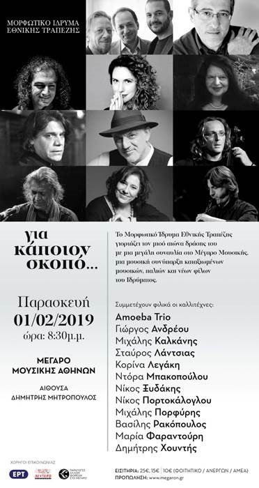 Nextdeal newsroom, 17/1/2019 - 11:49 facebook twitter linkedin Το Μορφωτικό Ίδρυμα Εθνικής Τραπέζης γιορτάζει μισό αιώνα δράσης! Nextdeal newsroom, 17/1/2019 facebook twitter linkedin ΣΥΝΑΥΛΙΑ ΣΤΟ ΜΕΓΑΡΟ ΜΟΥΣΙΚΗΣ «ΑΙΘΟΥΣΑ ΔΗΜΗΤΡΗΣ ΜΗΤΡΟΠΟΥΛΟΣ» Παρασκευή 1η Φεβρουαρίου 2019, 8.30 μ.μ. «Για κάποιον σκοπό…» Το Μορφωτικό Ίδρυμα Εθνικής Τραπέζης γιορτάζει τον μισό αιώνα δράσης του με μια μεγάλη συναυλία στο Μέγαρο Μουσικής, μια μουσική συνύπαρξη καταξιωμένων μουσικών, παλιών και νέων φίλων του Ιδρύματος. Συμμετέχουν φιλικά οι καλλιτέχνες: Αmoeba, Γιώργος Ανδρέου, Μιχάλης Καλκάνης, Σταύρος Λάντσιας, Κορίνα Λεγάκη, Ντόρα Μπακοπούλου, Νίκος Ξυδάκης, Νίκος Πορτοκάλογλου, Μιχάλης Πορφύρης, Βασίλης Ρακόπουλος, Μαρία Φαραντούρη, Δημήτρης Χουντής Το ΜΙΕΤ, με αδιάλειπτη παρουσία πενήντα και πλέον ετών στον χώρο των γραμμάτων και των τεχνών, αποτελεί έναν από τους σημαντικότερους πολιτιστικούς φορείς στην Ελλάδα. Συστάθηκε το 1966 από την Εθνική Τράπεζα στο πλαίσιο του εορτασμού των 125 χρόνων από την ίδρυσή της. Ωστόσο, αρχίζει τη δράση του ουσιαστικά το 1974, μετά την αποκατάσταση της Δημοκρατίας, με σκοπό να συμβάλει στην ανάπτυξη των γραμμάτων, των επιστημών και των καλών τεχνών. Το ΜΙΕΤ αγκαλιάζει πλήθος δραστηριοτήτων και επιμέρους τμημάτων. Κύριο μέλημα του είναι οι εκδόσεις του και, δίπλα σε αυτές, μια πολύ ανεπτυγμένη καλλιτεχνική δραστηριότητα, εκθεσιακή και αρχειακή. Τα τελευταία χρόνια, το καλοκαίρι και το φθινόπωρο, το ΜΙΕΤ διοργανώνει μουσικές βραδιές στην αυλή του, στην Πλάκα. Στον ίδιο χώρο, φέτος το καλοκαίρι, εγκαινίασε και τη συνεργασία του με το Φεστιβάλ Αθηνών και Επιδαύρου, φιλοξενώντας μουσικές παραστάσεις. Από τις μουσικές εκδηλώσεις στην αυλή μας είχαμε τη χαρά να αναπτύξουμε δεσμούς φιλίας και συνεργασίας με καταξιωμένους Έλληνες μουσικούς, κάποιοι από τους οποίους θα μας συντροφεύσουν με τις μουσικές τους σε αυτή τη συναυλία. Συμμετέχουν οι μουσικοί: Κουαρτέτο: Λαέρτης Κοκολάνης, 1ο βιολί – Ευγένιος Ζιμπάϊ, 2ο βιολί – Ηλίας Σδούκος, βιόλα – Μιχάλης Πορφύρης, βιολοντσέλο. Πληροφορίες: 210 3234 267, 210 7282 333 Εισιτήρια: 25, 15 και 10 ευρώ (φοιτητικό, ανέργων, ΑΜΕΑ) Προπώληση εισιτηρίων εδώ και στα ταμεία του Μεγάρου Μουσικής, Ομήρου 8, τηλ. 210 7282 333 Ακολουθήστε το Nextdeal.gr στο Google News .