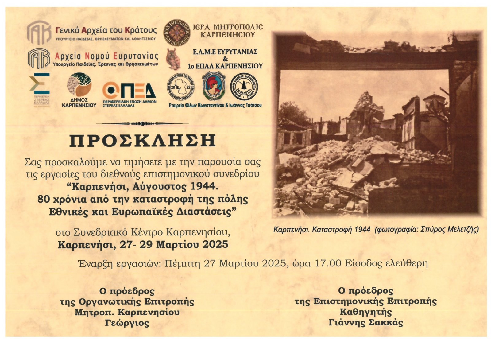 Ηλίας Προβόπουλος, 28/3/2025 - 09:15 facebook twitter linkedin Ο ματωμένος Αύγουστος του 1944 στο Καρπενήσι Ηλίας Προβόπουλος, 28/3/2025 facebook twitter linkedin Ο ματωμένος Αύγουστος του 1944 στο Καρπενήσι Με τον ματωμένο Αύγουστο του 1944, όταν το Καρπενήσι ισοπεδώθηκε από τη βαρβαρότητα, καταπιάνεται το τριήμερο διεθνές συνέδριο που ξεκίνησε χθες στο Συνεδριακό Κέντρο Καρπενησίου, με 35 ομιλητές – προσωπικότητες που δραστηριοποιούνται σε Ελλάδα και εξωτερικό. Σκοπός δεν είναι απλώς η αποτύπωση ή μια υπενθύμιση ενός ιστορικού γεγονότος για την πόλη, αλλά η προσέγγιση και η ανάλυσή του στις εθνικές καθώς και στις ευρωπαϊκές διαστάσεις του. Φορείς και ιδιώτες ένωσαν δυνάμεις για την διοργάνωση της επιστημονικής συνάντησης, χτίζοντας πάνω σε μια ιδέα του δημοσιογράφου – συγγραφέα Δημήτρη Ευαγγελοδήμου (1954 – 2023), όπως ο ίδιος την μοιράστηκε για πρώτη φορά τον Ιούνιο του 2023 με τα Γενικά Αρχεία του Κράτους (ΓΑΚ) – Τμήμα Ευρυτανίας. Οι εργασίες άνοιξαν με ομιλία του πρώην Προέδρου της Δημοκρατίας Προκόπη Παυλόπουλου: «Το νομικώς ενεργό και δικαστικώς επιδιώξιμο των απαιτήσεων της Ελλάδας κατά της Ομοσπονδιακής Δημοκρατίας της Γερμανίας αναφορικά με το κατοχικό δάνειο και με τις εν γένει αποζημιώσεις για τα θύματα και τις καταστροφές της ναζιστικής θηριωδίας». Τον λόγο πήραν στην πρώτη μέρα τρεις διακεκριμένοι καθηγητές. Ο Χάγκεν Φλάισερ: «Πόλεμος πατήρ πάντων; Βιωματικά και αρχειακά ενθυμήματα ενός Γερμανοέλληνα». Ο Άντονι Μακέλιγκοτ (Anthony McElligott): «Varieties of violence under the German Occupation» (Μορφές βίας επί γερμανικής κατοχής). Ο Πάολο Φόντζι (Paolo Fonzi): «Good Occupiers? Military governance and the use of violence in the Italian occupation of Greece 1941-43» (Καλές κατοχικές δυνάμεις; Στρατιωτική διακυβέρνηση και χρήση βίας στην ιταλική κατοχή. Ελλάδα 1941-43). Στην δεύτερη και στην τρίτη μέρα (Παρασκευή 28 Μαρτίου και Σάββατο 29 Μαρτίου) έχουν προγραμματιστεί εισηγήσεις επιστημόνων, καθηγητών και ερευνητών σε έξι θεματικές, οι οποίες επιτρέπουν μια ολιστική προσέγγιση των γεγονότων. – Η γερμανική αντιανταρτική στρατηγική και η εμπειρία της καταστροφής του Καρπενησίου. – Η μετεμφυλιακή ανασυγκρότηση του Καρπενησίου και της Ευρυτανίας. – Η καταστροφή άλλων ελληνικών και ευρωπαϊκών πόλεων την περίοδο του Β’ Παγκοσμίου Πολέμου. Σύγκριση με την εμπειρία της καταστροφής του Καρπενησιού. – Έκφραση και Μνήμη. Αποτυπώσεις των καταστροφών ελληνικών και ευρωπαϊκών πόλεων κατά τον Β’ Παγκόσμιο Πόλεμο στην Τέχνη. – Έκφραση και Μνήμη. Η λειτουργία της μνήμης και της λήθης της καταστροφής πόλεων την περίοδο του Β’ Παγκοσμίου Πολέμου κατά την μετακατοχική περίοδο –προγράμματα και εκπαιδευτικές δράσεις για την διατήρηση και διαχείριση της ιστορικής μνήμης. – Μαρτυρίες προφορικές ή γραπτές για την καταστροφή του Καρπενησιού και της ενδοχώρας του. Την Κυριακή 30 Μαρτίου (ώρα 13:30) εγκαινιάζεται η έκθεση «Μνήμη και Τιμή» στο Μουσείο Εθνικής Αντίστασης Κορυσχάδων Δικτυακή παρακολούθηση μέσω του συνδέσμου εδώ Ακολουθήστε το Nextdeal.gr στο Google News .