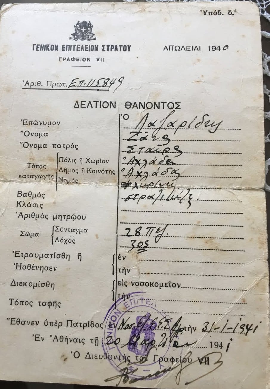 Ηλίας Προβόπουλος, 4/9/2025 - 09:14 facebook twitter linkedin Ένας ήρωας του έπους του ’40 δεν ξεχάστηκε… Ηλίας Προβόπουλος, 4/9/2025 facebook twitter linkedin Διαβάζουμε στην εξαιρετική διαδικτυκή ομάδα «Αιτωλία και Ακαρνανία στο πέρασμα του χρόνου, Aetolia Acarnania tempus που υπογράφει ο Λίνος Υφαντής, μια ενδιαφέρουσα ιστορία που θυμίζει τις ημέρες του πολέμου στην Αλβανία και τους ανθρώπους που πέθαναν νοσηλευόμενοι στο νοσοκομείο του Αγρινίου αλλά δεν ξεχάστηκαν… Μια άκρως συγκινητική ιστορία έλαβε αίσιο τέλος σήμερα 3-9-2025 στο νεκροταφείο Αγρινίου. Πρωταγωνιστής ο εγγονός ενός ήρωα έλληνα στρατιώτη, του Ιωάννη Λαζαρίδη, ο οποίος μαχόμενος ηρωϊκά από 5-12-1940 έως 22-12-1940 κατά την μετακίνηση των Ελληνικών στρατευμάτων από την Κλεισούρα στο Φρασέρι της Αλβανίας πέθανε από κρυοπαγήματα στο νοσοκομείο Αγρινίου στις 31-1-1941. Ο Ιωάννης Λαζαρίδης κατάγονταν από την Αχλάδα Φλωρίνης. Η οικογένεια του πλήρωσε τα παιχνίδια της ιστορίας και βρέθηκε χωρίς να το θέλει στη λάθος πλευρά, καθώς εκδιώχθηκε το 1948 από τις εστίες της και εγκαταστάθηκαν αρχικά στην Ουγγαρία και τη Βουδαπέστη και μετέπειτα στα Σκόπια και στην τότε Γιουγκοσλαβία και στην περιοχή της σημερινής Βόρειας Μακεδονίας. Ο εγγονός του μεγάλωσε στη γείτονα χώρα. Το 1993 έφυγε ως μετανάστης στον Καναδά μαζί με την αξιότιμη γυναίκα του Ίρινα, η οποία φέρει και αυτή τη δικιά της ιστορία με παππού από τη Ρωσία και την Ουκρανία -πάλι sic παιχνίδια της ιστορίας. Διέσχισε την Ελλάδα στον πόλεμο του 1917 και ως γιατρός έφτασε στα Σκόπια όπου εκεί τον περιέθαλψε η γιαγιά της Ίρινας και ύστερα τον παντρεύτηκε. Ο Στόγιαν διαπρέπει ως μηχανολόγος μηχανικός σε μεγάλη εταιρεία στο Οντάριο. Φέρει το όνομα και το επώνυμο του παππού του παραφρασμένο στην γλώσσα των γειτόνων μας ήτοι Στόγιαν Λαζάρωφ. Προς τιμήν του έψαχνε να βρει που είναι θαμμένος ο παππούς του. Πληροφορήθηκε πριν 10 χρόνια ότι ο Ιωάννης Λαζαρίδης ήταν θαμμένος στο Αγρίνιο. Ήρθε από τον Καναδά, έψαξε και ανακάλυψε τον τόπο που πέθανε. ¨Ηταν το κτίριο που στεγάζονταν σήμερα το Παπαστράτειο Γυμνάσιο Αγρινίου και το 5ο Δημοτικό Σχολείο, διότι τότε χρησιμοποιούνταν ως στρατιωτικό νοσοκομείο και έφερναν τους τραυματίες έλληνες στρατιώτες από το μέτωπο. Ο Στόγιαν Λαζάρωφ όμως τότε “έφτασε στην βρύση αλλά νερό δεν ήπιε” γιατί έφτασε ως το νεκροταφείο Αγρινίου βρήκε το οστεοφυλάκιο αλλά δεν είχε κανέναν να του υποδείξει που βρίσκονται τα λείψανα των πεσόντων στρατιωτών του πολέμου του 1940 έναντι των Ιταλών, οι οποίοι πέθανα στο νοσοκομείο Αγρινίου. Τότε για καλή του τύχη βρέθηκαν δύο άνθρωποι μπροστά του: Ο Ιπποκράτης Μπιρμπίλης και ο Νίκος Θώμος, αμφότεροι δημοτικοί υπάλληλοι.. Με τον Ιπποκράτη Μπιρμπίλη γνωρίστηκαν στο διαδίκτυο σε ομάδα με θέμα τον πόλεμο 1940-1941 εναντίον της φασιστικής Ιταλίας. Εκεί συνομίλησαν και ο Στόγιαν ξαναήρθε με τη σύζυγο του στο Αγρίνιο. Ο Ιπποκράτης Μπιρμπίλης ανέλαβε να τρέξει δύσκολες διαδικασίες για έναν ξένο που γνωρίζει ελάχιστα πια την ελληνική γλώσσα σχετικά με το που μπορεί να βρει τέτοιες σημαντικές πληροφορίες. Είχε την τύχη να τον διευκολύνει ο δημοτικός υπάλληλος του νεκροταφείου Νίκος Θώμος που σε συνεργασία με τον συνταξιούχο υπάλληλο του κοιμητηρίου Κατσάμπα Κωνσταντίνο και να του υποδείξει το κουτί όπου βρίσκονταν τα οστά του ήρωα Ιωάννη Λαζαρίδη. Ήταν χακί κουτί του στρατού, ένα από τους 40 περίπου πεσόντες που φυλάσσεται στο Αγρίνιο