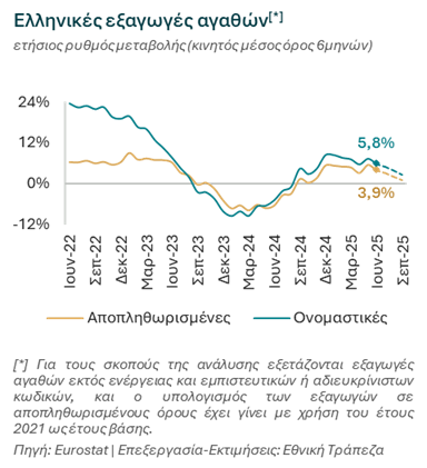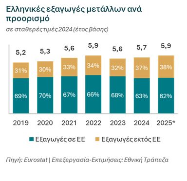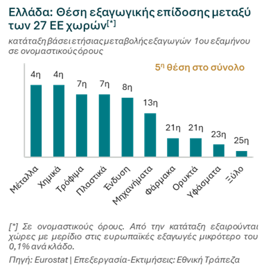 Nextdeal newsroom, 19/11/2025 - 12:20 facebook twitter linkedin Εθνική Τράπεζα: Με ορατές τις δασμολογικές πιέσεις στην Ευρώπη, η Ελλάδα βρίσκει στηρίγματα στους παραδοσιακούς της κλάδους Nextdeal newsroom, 19/11/2025 facebook twitter linkedin Εν μέσω μιας από τις πιο δύσκολες συγκυρίες των τελευταίων δεκαετιών – με δασμούς, ισχυρό ευρώ και γεωπολιτική αβεβαιότητα – οι ελληνικές βιομηχανίες επιδεικνύουν αξιοσημείωτη ανθεκτικότητα, κερδίζοντας έδαφος στις διεθνείς αγορές έναντι των Ευρωπαίων ανταγωνιστών τους. Σύμφωνα με το νέο τεύχος «Τάσεις του Επιχειρείν» της Διεύθυνσης Οικονομικής Ανάλυσης της Εθνικής Τράπεζας οι ελληνικές εξαγωγές αγαθών (εκτός πετρελαίου) αναμένεται να κλείσουν το 2025 με άνοδο 2% σε πραγματικούς όρους, αντιστρέφοντας την πτώση 0,8% του 2024. Ειδικότερα, η χώρα κατέγραψε ισχυρή άνοδο 3,9% κατά το 1ο εξάμηνο του έτους, καταλαμβάνοντας την 5η υψηλότερη εξαγωγική επίδοση στην Ευρώπη, με κορυφαίες επιδόσεις (top10) σε 5 από τους 10 ευρείς κλάδους. Ως αποτέλεσμα, το μερίδιο της ελληνικής βιομηχανίας έναντι των Ευρωπαίων ανταγωνιστών της αυξήθηκε στο 0,6% (από 0,4% το 2015) – άνοδος τόσο σημαντική που σε ορίζοντα δεκαετίας προσέθεσε €4,1 δις στις φετινές εξαγωγές της χώρας. Ωστόσο, το 2025 φαίνεται να εξελίσσεται σε έτος δύο ταχυτήτων, καθώς μετά από αυτή την ισχυρή επίδοση, το 2ο εξάμηνο κινείται σε επίπεδα αντίστοιχα με την περσινή περίοδο. Το μοτίβο αυτό αντανακλά εν πολλοίς τη στρατηγική αποθεματοποίησης από τις εισαγωγικές επιχειρήσεις πριν την ανακοίνωση της εμπορικής συμφωνίας ΕΕ-ΗΠΑ τον Ιούλιο, και την συνεπακόλουθη αντιστροφή της κατά το υπόλοιπο της χρονιάς (με τις υψηλότερες πιέσεις να εκτιμώνται για το 3ο τρίμηνο). Αν και η συμφωνία αυτή είχε περιορισμένη άμεση επίδραση για την Ελλάδα, αφαίρεσε σε μεγάλο βαθμό την αβεβαιότητα γύρω από το ενδεχόμενο ενός εκτεταμένου εμπορικού πολέμου και των συνεπακόλουθων επιπτώσεων σε όρους πληθωρισμού και διαταραχής εφοδιαστικών αλυσίδων. Υπό αυτή την οπτική, εκτιμάται ότι λειτούργησε ως βασικός διαμορφωτής της βραχυπρόθεσμης μεταβλητότητας του έτους. Πέρα από τις βραχυπρόθεσμες αυτές τάσεις, το διαρθρωτικό στοιχείο που ξεχωρίζει είναι η δυναμική παρουσία των δύο παραδοσιακών πυλώνων των ελληνικών εξαγωγών: Τρόφιμα και Μέταλλα. Τα τρόφιμα κατέγραψαν άνοδο 10% κατά το 1ο εξάμηνο, επιβεβαιώνοντας την ανταγωνιστικότητα προϊόντων όπως ελαιόλαδο, γαλακτοκομικά και φρούτα. Τα μέταλλα σημείωσαν αύξηση 7% κατά την ίδια περίοδο, διατηρώντας τη δυναμική τους τόσο εντός όσο και εκτός ΕΕ (ιδίως σε ΗΠΑ, Ηνωμένο Βασίλειο και Νορβηγία), ενώ ο κλάδος ενισχύει σταθερά το μερίδιό του στις ευρωπαϊκές εξαγωγές, φτάνοντας το 1,1% το 2025 (από 0,9% το 2011). Θετικά σημάδια συνέχισης της ανόδου προσδίδουν οι πρώτες ενδείξεις από την πορεία του 2ου εξαμήνου, με τους δύο κλάδους να ανεβαίνουν στην 3η θέση των ευρωπαϊκών εξαγωγικών επιδόσεων. Το παράδειγμα των μετάλλων συνοψίζει κάτι βαθύτερο. Η Ελλάδα – αν και μικρή χώρα – αποδεικνύει ότι μπορεί να είναι ανταγωνιστική σε τομείς παγκόσμιας εμβέλειας. Κόντρα σε δασμούς έως και 50%, μεγάλες διακυμάνσεις ζήτησης και υψηλά ενεργειακά κόστη, τα ελληνικά μέταλλα καταφέρνουν να διατηρούν ετήσιες εξαγωγές της τάξης των €6 δις την τελευταία 5ετία, τροφοδοτώντας στρατηγικές αγορές όπως οι ΗΠΑ, το ΗΒ και η ΕΕ. Συνεπώς, η Ελλάδα δείχνει ότι μπορεί, με σωστή διαφοροποίηση προϊόντων, να επεκτείνει τη θέση της σε κλάδους υψηλών απα