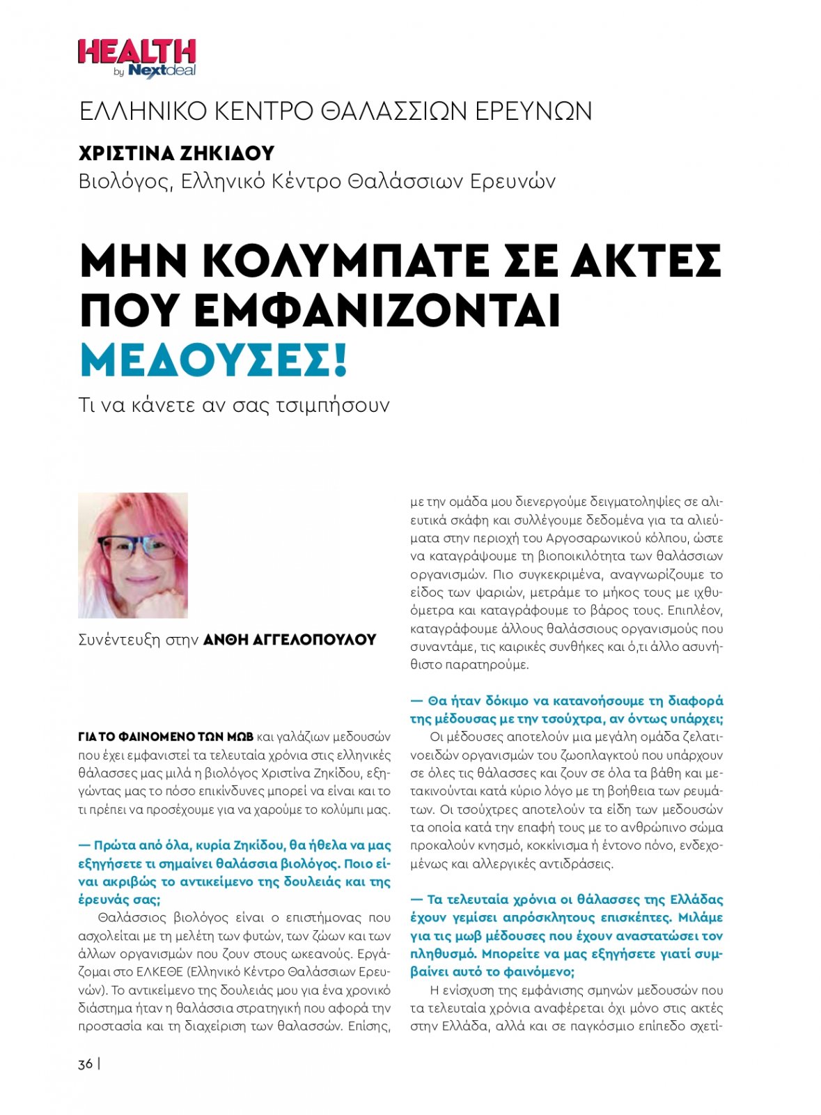 Ανθή Αγγελοπούλου, 2/8/2022 - 12:10 facebook twitter linkedin Μην κολυμπάτε σε ακτές που εμφανίζονται μέδουσες! Τι να κάνετε αν ας τσιμπήσουν! Ανθή Αγγελοπούλου, 2/8/2022 facebook twitter linkedin Για το φαινόμενο των μωβ και γαλάζιων μεδουσών που έχει εμφανιστεί τα τελευταία χρόνια στις ελληνικές θάλασσες μας μιλά η βιολόγος Χριστίνα Ζηκίδου, εξηγώντας μας το πόσο επικίνδυνες μπορεί να είναι και το τι πρέπει να προσέχουμε για να χαρούμε το κολύμπι μας. Πρώτα από όλα, κυρία Ζηκίδου, θα ήθελα να μας εξηγήσετε τι σημαίνει θαλάσσια βιολόγος. Ποιο εί- ναι ακριβώς το αντικείμενο της δουλειάς και της έρευνάς σας; Θαλάσσιος βιολόγος είναι ο επιστήμονας που ασχολείται με τη μελέτη των φυτών, των ζώων και των άλλων οργανισμών που ζουν στους ωκεανούς. Εργάζομαι στο ΕΛΚΕΘΕ (Ελληνικό Κέντρο Θαλάσσιων Ερευνών). Το αντικείμενο της δουλειάς μου για ένα χρονικό διάστημα ήταν η θαλάσσια στρατηγική που αφορά την προστασία και τη διαχείριση των θαλασσών. Επίσης, με την ομάδα μου διενεργούμε δειγματοληψίες σε αλιευτικά σκάφη και συλλέγουμε δεδομένα για τα αλιεύματα στην περιοχή του Αργοσαρωνικού κόλπου, ώστε να καταγράψουμε τη βιοποικιλότητα των θαλάσσιων οργανισμών. Πιο συγκεκριμένα, αναγνωρίζουμε το είδος των ψαριών, μετράμε το μήκος τους με ιχθυόμετρα και καταγράφουμε το βάρος τους. Επιπλέον, καταγράφουμε άλλους θαλάσσιους οργανισμούς που συναντάμε, τις καιρικές συνθήκες και ό,τι άλλο ασυνήθιστο παρατηρούμε. Θα ήταν δόκιμο να κατανοήσουμε τη διαφορά της μέδουσας με την τσούχτρα, αν όντως υπάρχει; Οι μέδουσες αποτελούν μια μεγάλη ομάδα ζελατι- νοειδών οργανισμών του ζωοπλαγκτού που υπάρχουν σε όλες τις θάλασσες και ζουν σε όλα τα βάθη και μετακινούνται κατά κύριο λόγο με τη βοήθεια των ρευμάτων. Οι τσούχτρες αποτελούν τα είδη των μεδουσών τα οποία κατά την επαφή τους με το ανθρώπινο σώμα προκαλούν κνησμό, κοκκίνισμα ή έντονο πόνο, ενδεχομένως και αλλεργικές αντιδράσεις. Τα τελευταία χρόνια οι θάλασσες της Ελλάδας έχουν γεμίσει απρόσκλητους επισκέπτες. Μιλάμε για τις μωβ μέδουσες που έχουν αναστατώσει τον πληθυσμό. Μπορείτε να μας εξηγήσετε γιατί συμ- βαίνει αυτό το φαινόμενο; Η ενίσχυση της εμφάνισης σμηνών μεδουσών που τα τελευταία χρόνια αναφέρεται όχι μόνο στις ακτές στην Ελλάδα, αλλά και σε παγκόσμιο επίπεδο σχετίζεται με τις συσσωρευτικές επιπτώσεις ορισμένων ανθρωπογενών πιέσεων, όπως κατά κύριο λόγο η κλι-ματική αλλαγή και η απομάκρυνση την θηρευτών των μεδουσών λόγω της υπεραλίευσης. Δύο από τα είδη των μεδουσών που συναντούμε στα ελληνικά νερά είναι η μωβ μέδουσα και η γαλάζια μέδουσα. Πιο συγκεκριμένα, όταν αναφερόμαστε στη μωβ μέδουσα, πρόκειται για το είδος Pelagia noctiluca. Όταν είναι νεαρή, το χρώμα της είναι πορτοκαλοκαφέ και όταν ενηλικιώνεται παίρνει αυτό το ροζιώδες χρώμα. Έχει σχήμα ημισφαιρικής ομπρέλας σαν «καμπάνα» με διάμετρο περίπου 6 εκατοστά. Μπορεί μάλιστα να φτάσει τα 15 εκατοστά. Έχει οκτώ περιφερειακά νημάτια και τέσσερα στοματικά πλοκάμια. Ζει σε παράκτια, ζεστά και εύκρατα νερά και μπορεί να βρίσκεται σε οποιοδήποτε βάθος. Η μέδουσα αυτή είναι βιοφωταυγής οργανισμός και τη νύχτα φωσφορίζει,προσφέροντας ένα αρκετά φαντασμαγορικό θέαμα. Η Pelagia noctiluca είναι γνωστή και ως τσούχτρα, επειδή είναι η μόνη μέδουσα που έχει αυτό το χαρακτηριστικό τσουχτερό τσίμπημα, το οποίο μπορεί να είναι ενοχλητικό έως οδυνηρό ή αρκετές φορές μπορεί να προκαλεί σοβαρές αν