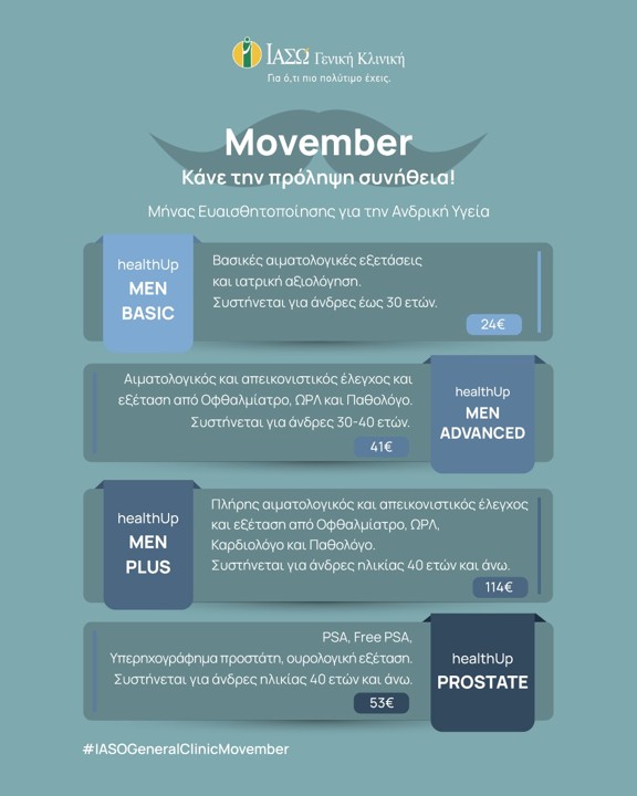 Nextdeal newsroom, 18/11/2025 - 11:15 facebook twitter linkedin ΙΑΣΩ Γενική Κλινική: Κάνε την πρόληψη συνήθεια! Nextdeal newsroom, 18/11/2025 facebook twitter linkedin Movember: Πακέτα προληπτικού ελέγχου για άνδρες σε προνομιακές τιμές H Γενική Κλινική του ΙΑΣΩ συμμετέχει και φέτος ενεργά στο παγκόσμιο κίνημα Movember, με στόχο την ενημέρωση και ευαισθητοποίηση των ανδρών γύρω από την αξία της πρόληψης και του τακτικού ελέγχου της υγείας τους. Με φετινό μήνυμα «Κάνε την πρόληψη συνήθεια!», το ΙΑΣΩ Γενική Κλινική ενθαρρύνει με χιούμορ αλλά και ουσία όλους τους άνδρες να εντάξουν τον προληπτικό έλεγχο στην καθημερινότητά τους και προσφέρει όλα τα πακέτα healthUp MEN και PROSTATE, σε ιδιαίτερα προνομιακές τιμές με έκπτωση 40%. Πιο αναλυτικά: healthUp MEN BASIC, στην προνομιακή τιμή των 24€: Βασικές αιματολογικές εξετάσεις και ιατρική αξιολόγηση. Συστήνεται για άνδρες έως 30 ετών. healthUp MEN ADVANCED, στην προνομιακή τιμή των 41€: Αιματολογικός και απεικονιστικός έλεγχος και εξέταση από Οφθαλμίατρο, ΩΡΛ και Παθολόγο. Συστήνεται για άνδρες 30-40 ετών. healthUp MEN PLUS, στην προνομιακή τιμή των 114€: Πλήρης αιματολογικός και απεικονιστικός έλεγχος και εξέταση από Οφθαλμίατρο, ΩΡΛ, Καρδιολόγο και Παθολόγο. Συστήνεται για άνδρες ηλικίας 40 ετών και άνω. healthUp PROSTATE, στην προνομιακή τιμή των 53€: PSA, Free PSA, Υπερηχογράφημα προστάτη, ουρολογική εξέταση. Συστήνεται για άνδρες ηλικίας 40 ετών και άνω. Ενημερωθείτε αναλυτικά για τα πακέτα CheckUp healthUp. Η προσφορά ισχύει για ραντεβού που θα προγραμματιστούν μέχρι και την Παρασκευή 28 Νοεμβρίου 2025. Τηλέφωνα για ραντεβού 210 6383090, 210 6383091, Δευτέρα – Παρασκευή, 07:00-15:00. Ακολουθήστε το Nextdeal.gr στο Google News .